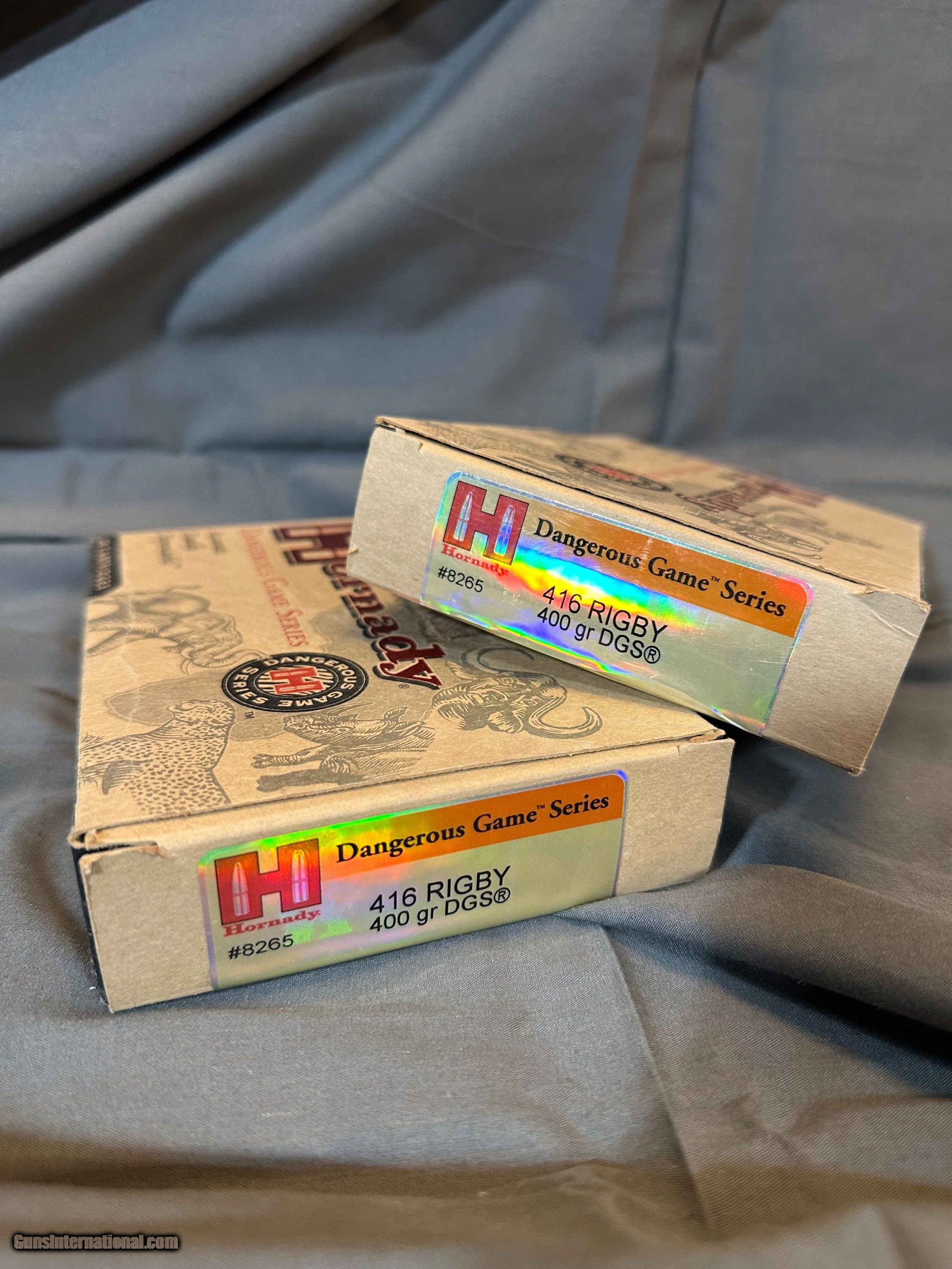 Description: 40 rounds Hornady 400gr DGS solid 416 Rigby Ammo Price: $300.00 Shipping: $15.00 Contact Seller |
