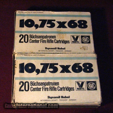 Description: One complete box and one partial box (36 rounds) new RWS 10.75 x 68 ammunition with 347 grain FMJ bullets. Dangerous game ammo in very good condition. SOLD |