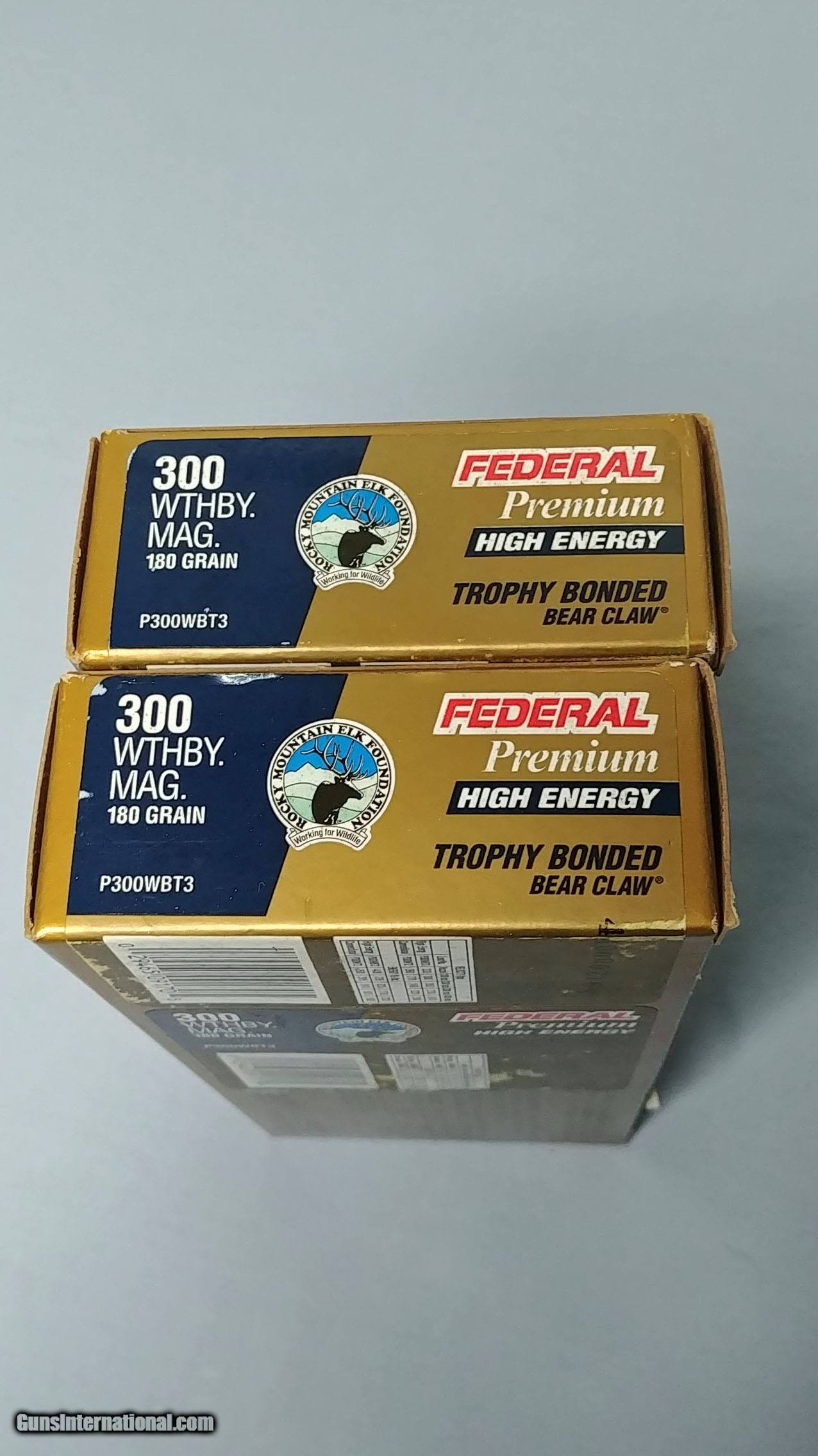 Description: Two Boxes of Federal Premium High Energy 300 Weatherby Magnum 180 Grain - Trophy Bonded Bear Claw Ammo. Two full boxes of factory ammo. The buyer is responsible for compliance with any local or state laws which may limit or prohibit their purchase. Payment by certified check or money order. I will also accept a personal check, but shipping will be delayed until check clears. A buyer must be a minimum of 21 years old to purchase centerfire or rimfire ammunition. Ammunition can only be shipped via UPS ground delivery service. I DO NOT ship to: CA, CT, AK, HI, NY, NJ, IL, Washington D.C. SOLD Rifle Caliber: .300 Weatherby Magnum |