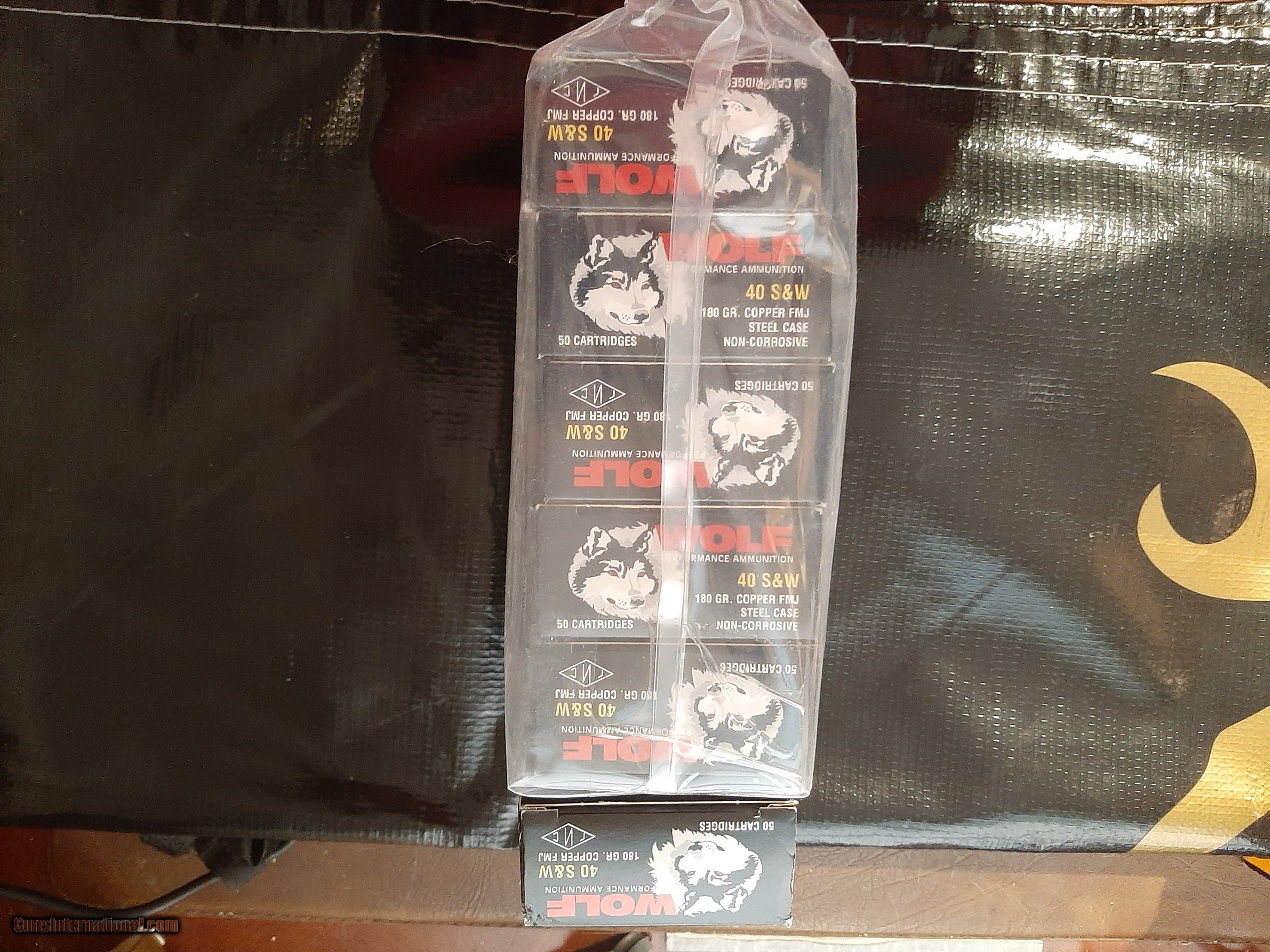 Description: Wolf 40 S & W 6 50 Rd Bxs Factory Ammo, 180 Gr FMJ 300 Total Rds. Shipping is 25.00 Credit Cards add 3%. SOLD Handgun Caliber: .40 Smith & Wesson (.40 Auto, 10 x 21 mm) |