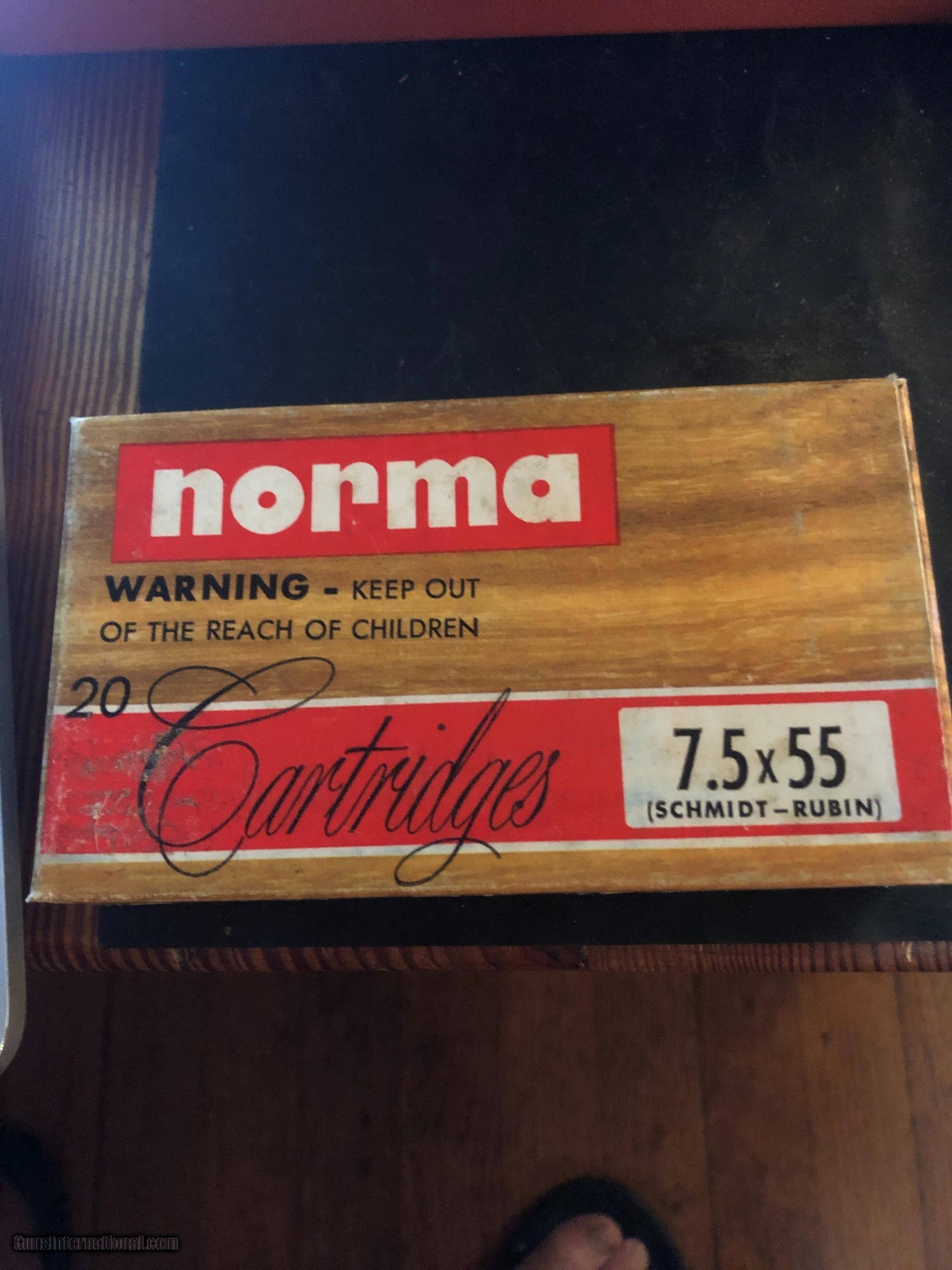Description: 1 box of 20 Norma 7.5 x 55 Schmidt Rubin SOLD |