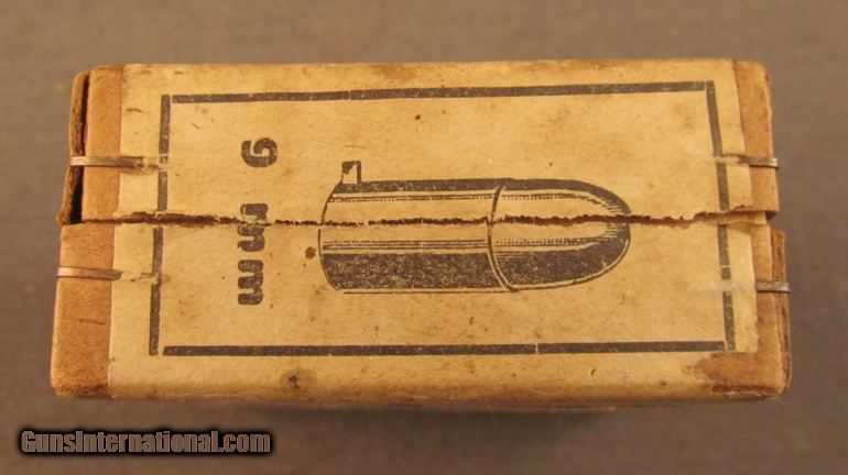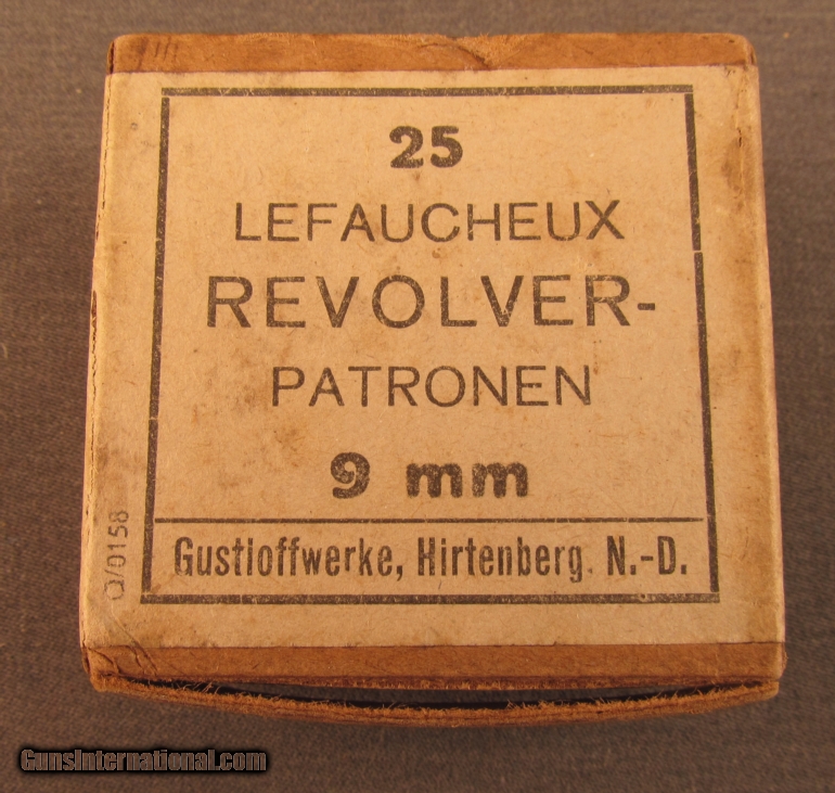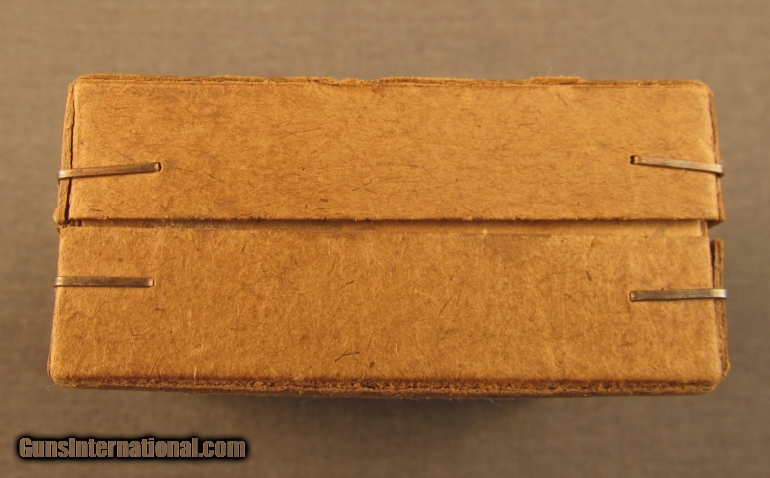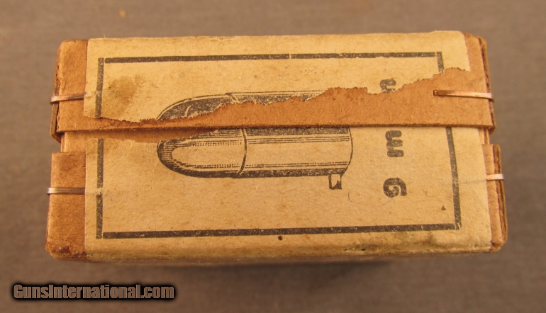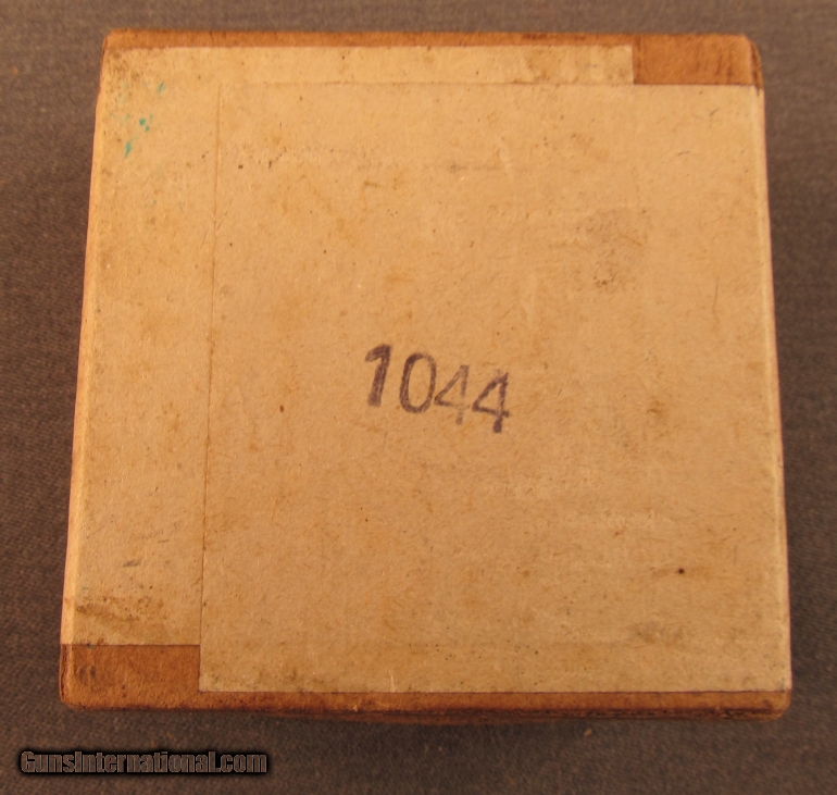 Description: This full sealed 25 round box was produced by Gustloffwerke in Hirtenberg, Austria. Box shows light soiling and minor shelf wear with stapled corners and wrap around label. SOLD Manufacturer: Gustloffwerke Model: Ammo Caliber Info: 9MM Pinfire Gauge Info: 9MM Pinfire |