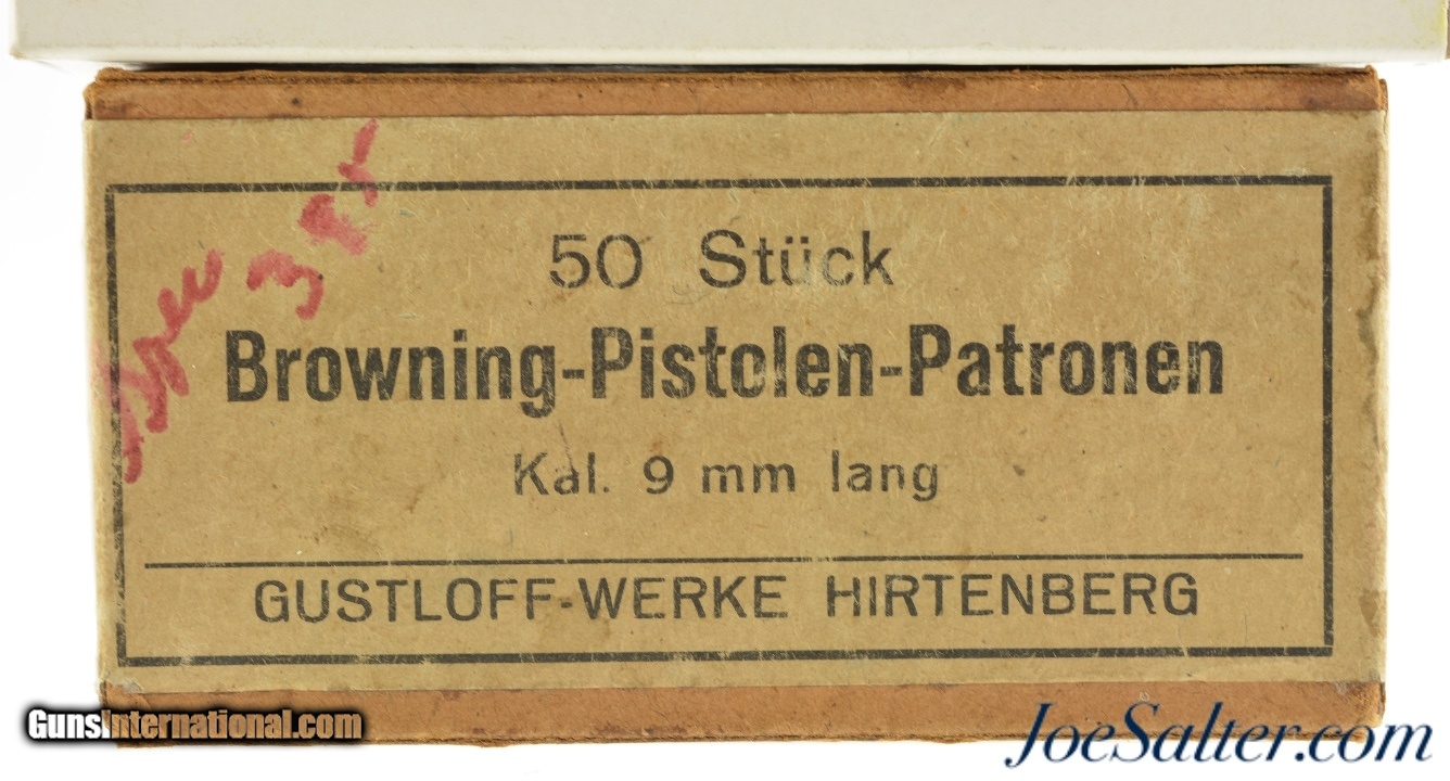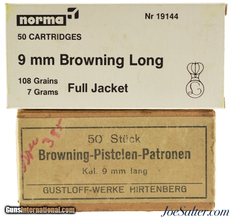 Description: This is a lot of 90 cartridges of 9mm Browning Long. One box of 40 rounds of pre-war Swedish, box is in very good condition. One NOS box of 50 Norma 108gr. FMJ, this box is in excellent condition.; SOLD |