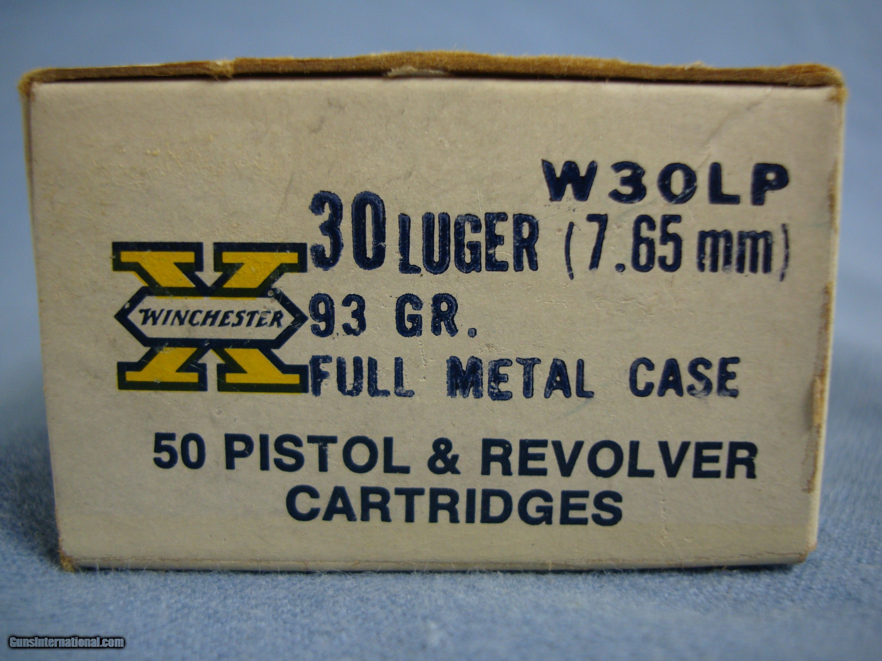 Description: One box of 50 Winchester brand 30 Luger(7.65 x 21mm) Parabellum ammunition. 93 grain Full Metal Case. New in Winchester factory box. Sales to CA residents must go through a licensed ammunition dealer. Please ask questions before committing to purchase as this is a no refund, no return, sale. Free shipping via UPS. Thanks for your interest. SOLD |