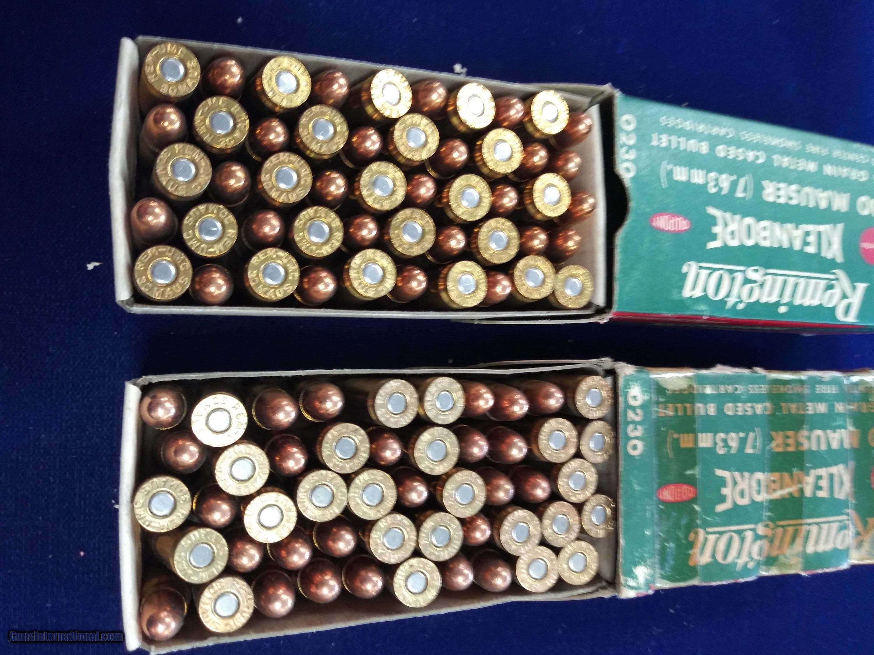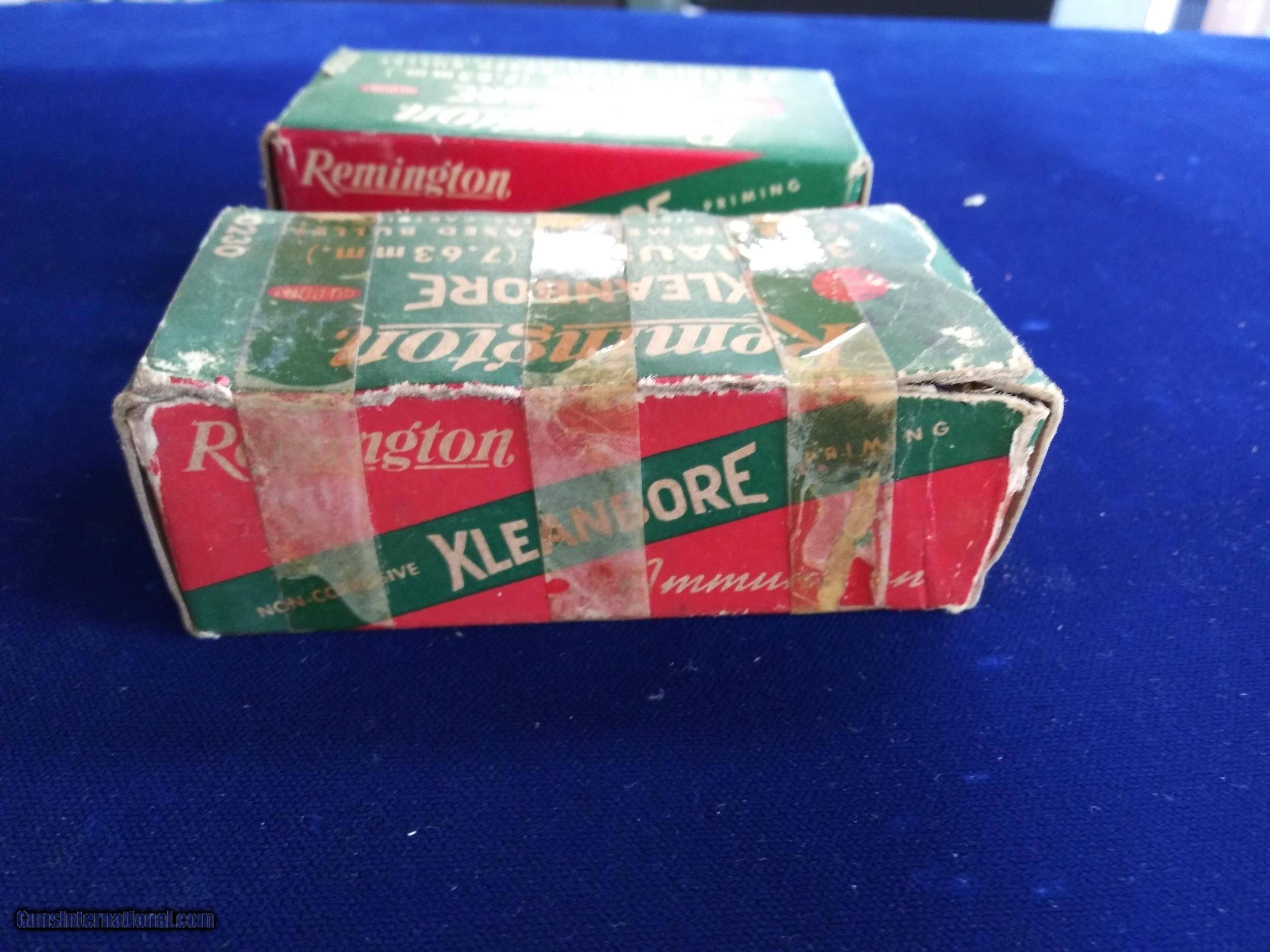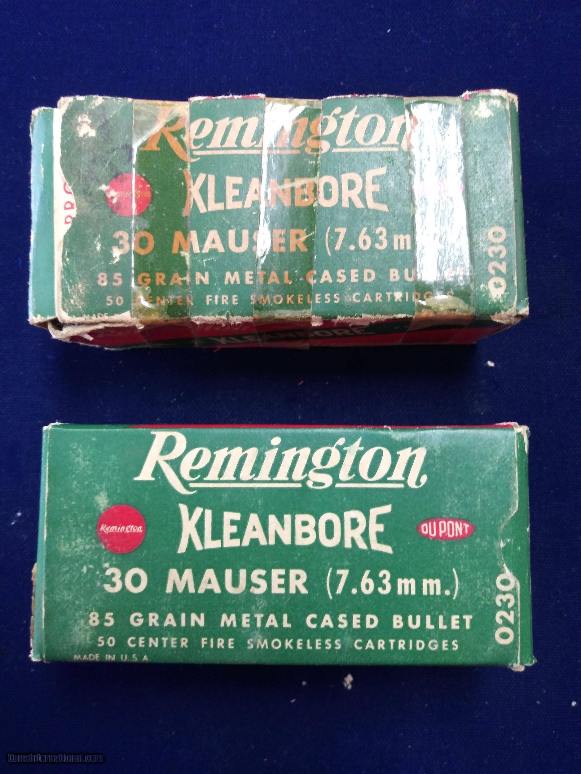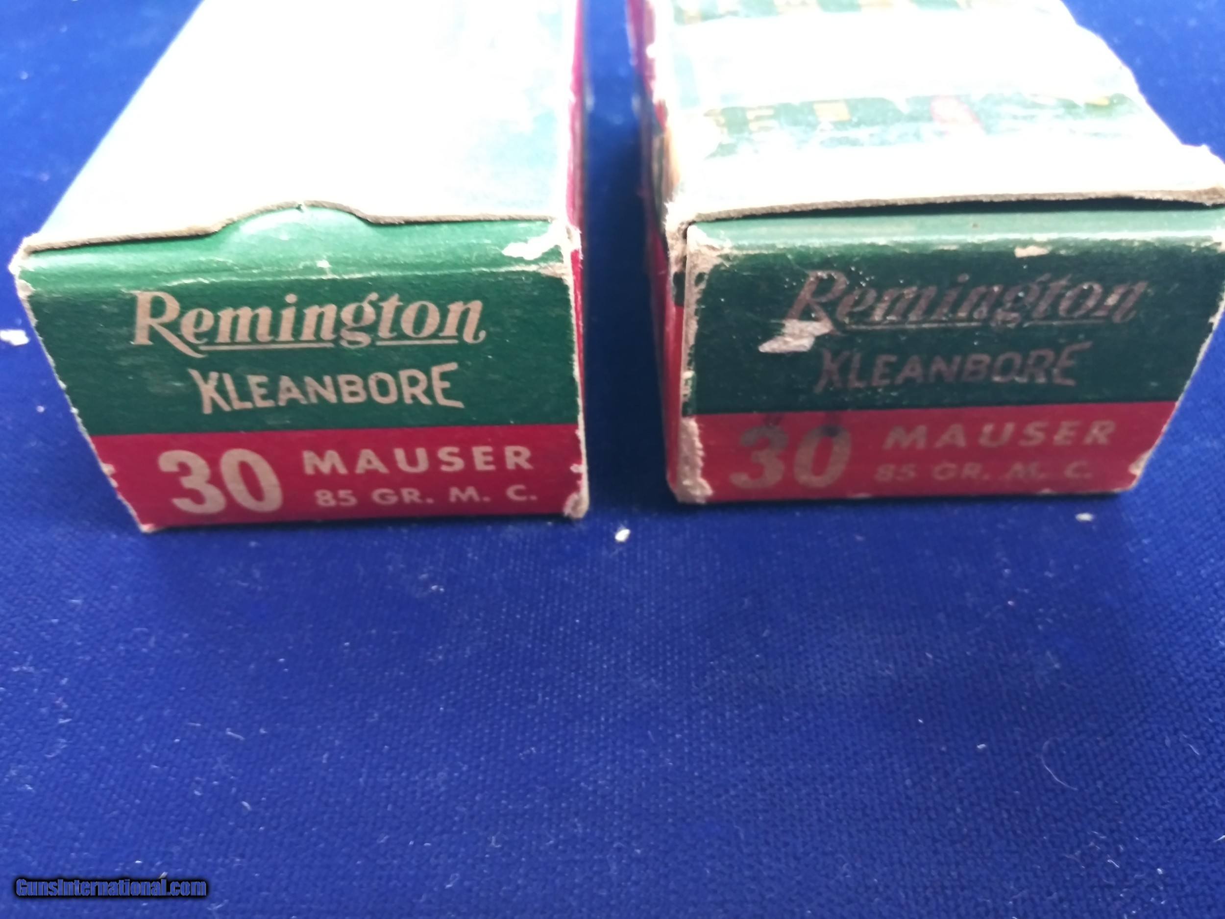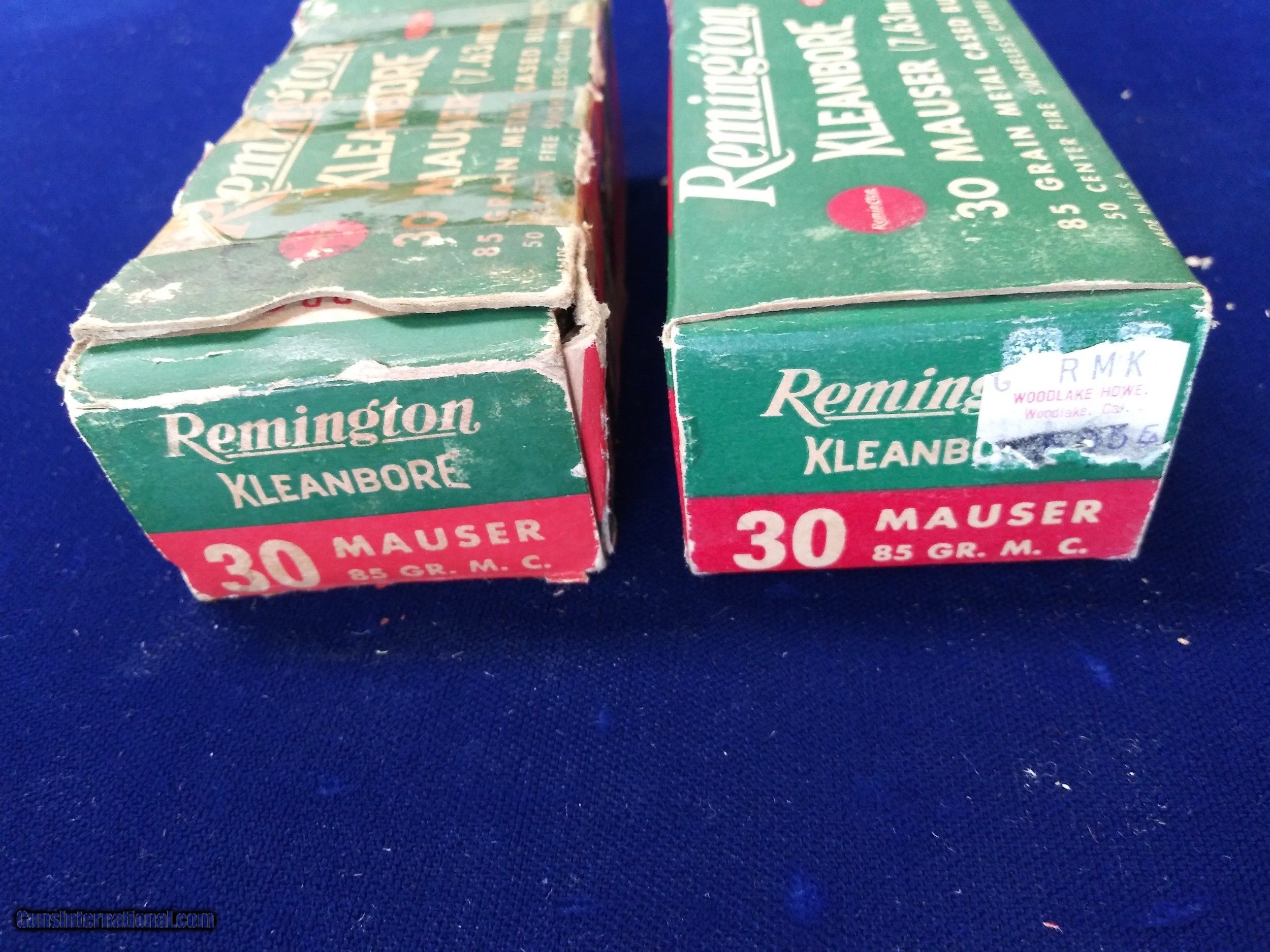 Description: 2 BOX LOT. Remington Kleanbore 30 Mauser. 85 grain FMJ. Both boxes are full. Condition as seen in pictures. $100 for both, includes shipping to lower 48. SOLD Handgun Caliber: 7.63x25mm Mauser (30 Mauser) |