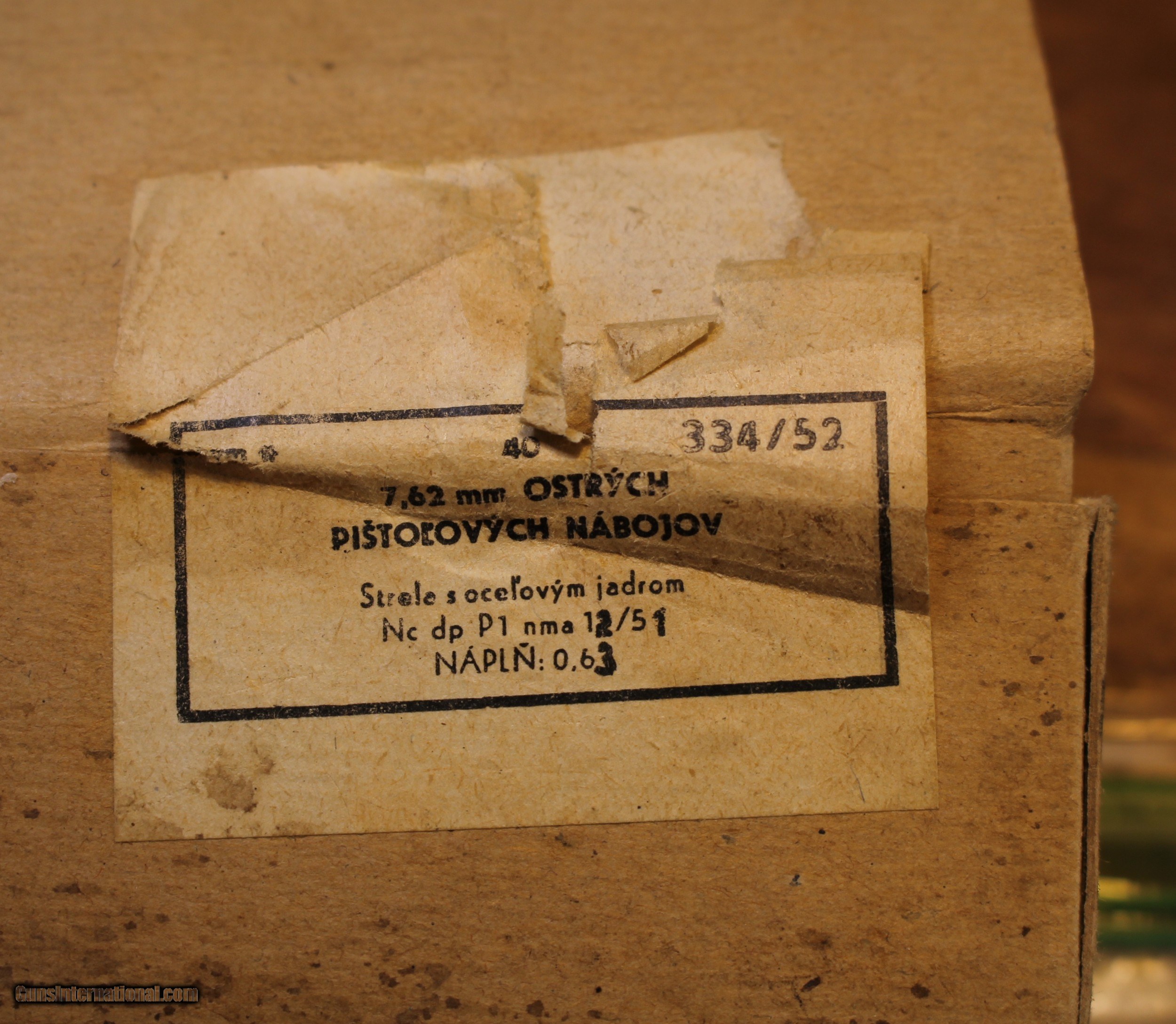 Description: We have Czech 7.62X25 85 Grain FMJ 80 Rounds 2 Boxes of 40 on 8 Round Stripper Clips Military Surplus. There are 80 rounds in two 40 round boxes inside those 40 round packages are 5 stripper clips with 8 round each. The head stamp as you can see is 52. This is surplus ammunition. From internet searches on the writing on the paper on the packages we are guessing as we do NOT speak Czech........Steel case, corrosive primer, magnetic bi-metal jacketed lead core bullet. Packed 8 rounds per stripper clip, 5 clips per 40 round box. The exact rounds you see are the exact rounds you get. Just old stock. REAL Old Stock. We are sorting through some 5000 rounds of all kinds of store or shelf stock and under the counter inventory. Some earlier such as this listing. So "New Old Stock" fits. We have listed some in our other listings that was dated 1939 This item came from the estate of a FFL/SOT/Gun Smith/Gun store. There will be countless more items listed as time permits. We figure it will take about 4 to 6 years to post the entire store to sell for the estate. This is NOT a liquidation, just selling for the estate. There are no lists and will be no list. Way too much to even try. Please check our other listings for more items as we sort through for the estate. There is about 5000 Rounds of all kinds of shelf or store stock of vintage and unique older ammuntion. Please also check our Webpage and or Facebook page at P&T Partners Shipping is $15 for UPS Ground to the lower 48. If you have any questions, you can email or call the number in the ad. Payment is Personal Check, USPS Money Order or Credit Card (BY PHONE ONLY) and add 3.5% for the credit card use). NOTE:....... Buyer RESPONSIBILITIES............ Buyer is responsible for knowing if they are eligible to purchase this ammunition based upon their location/age restrictions. Buyer assumes all liability for ammunition and agrees to not misuse it in any manner. Must be 21 years or older to purchase. SHIPPING...... Our shipping days are Tuesday and Friday. All loaded ammunition is shipped UPS Ground. We do not say to avoid any responsibility if you have a PORCH PIRATE problem in your area. You may want to pay extra for Signature at your end. . SOLD |