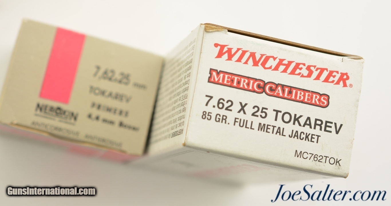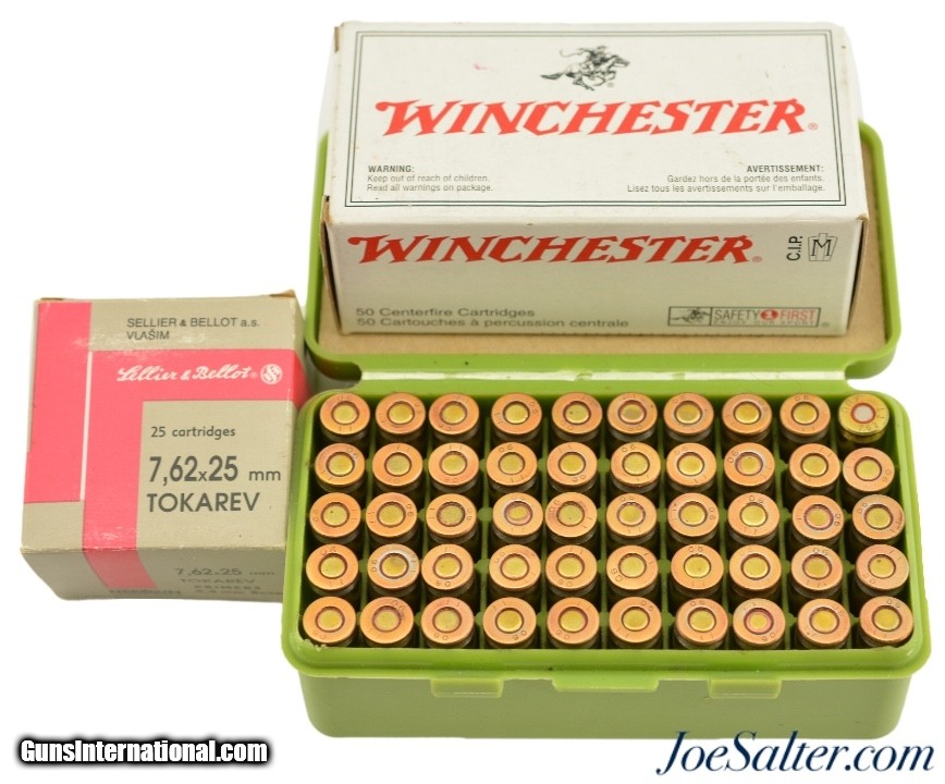 Description: This is a lot of NOS and Military 7.62x25 Tokarev consisting of 50 Military date 1990, 50 Winchester 85gr. FMJ, 25 Sellier&Bellot 85gr. FMJ. SOLD |