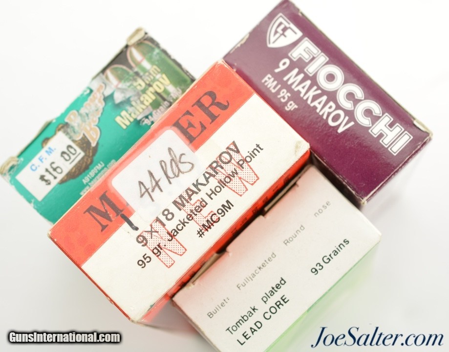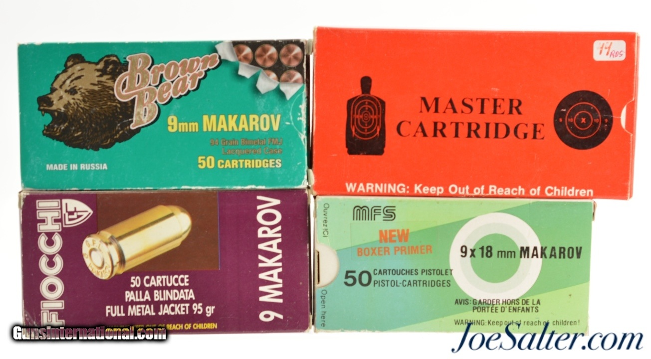 Description: This is a mixed lot of 194 rounds of 9x18mm Makarov Ammunition consisting of 3 full boxes of NOS, 1 Brown Bear 94gr. FMJ, 1 box of Fiocchi 95gr FMJ, of MFS 93gr. FMJRN. Also 1 box of 44 rounds of Masters Cartridge, re-manufactured 95gr JHP ammunition.; SOLD |