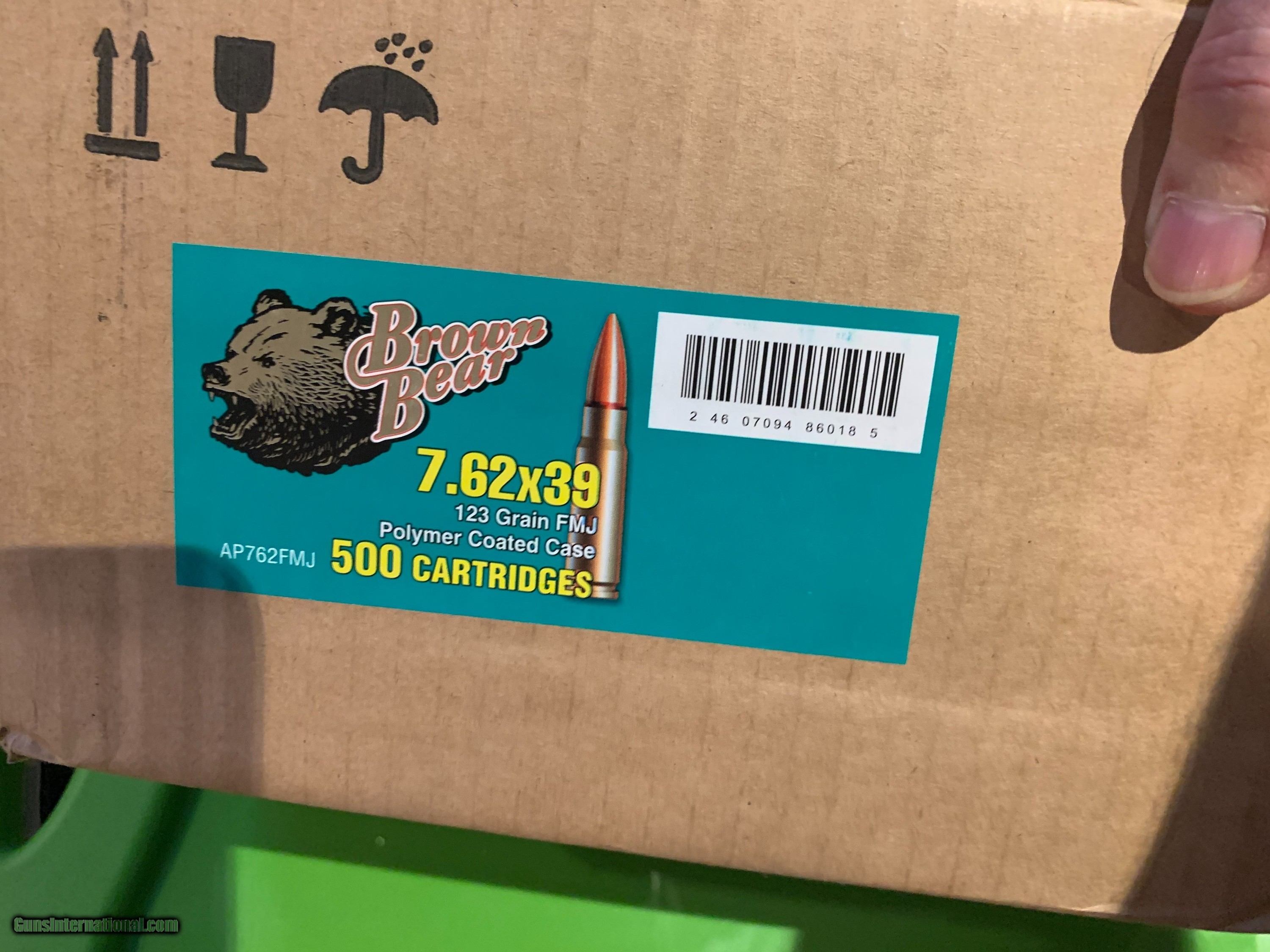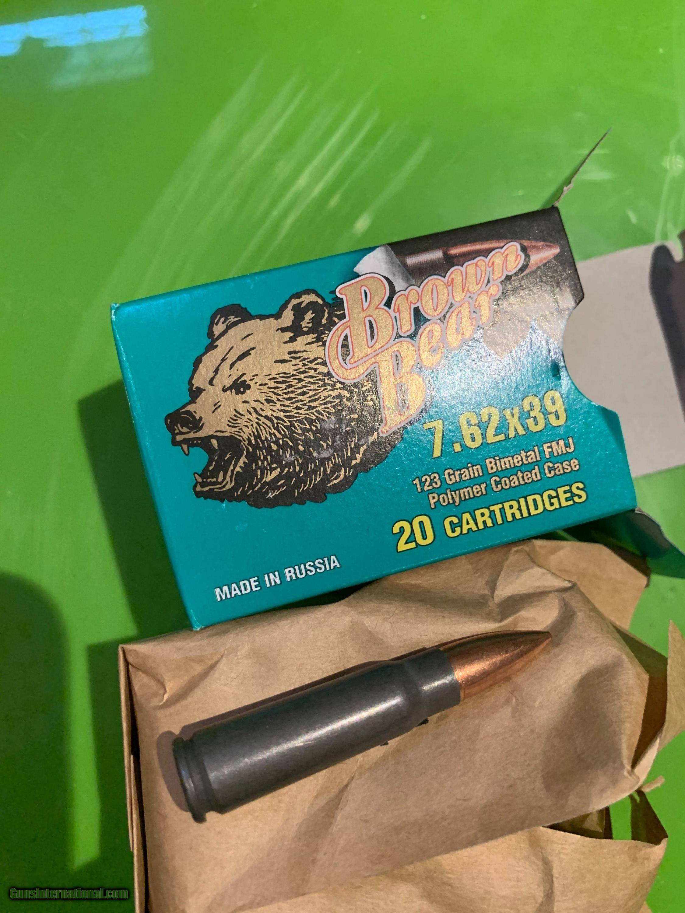 Description: 500 rounds of 7.62 X 39 polymer coated, steel cased ,FMJ ammo. Brown Bear brand. New and clean. In original packaging. SOLD Rifle Caliber: 7.62x39mm |