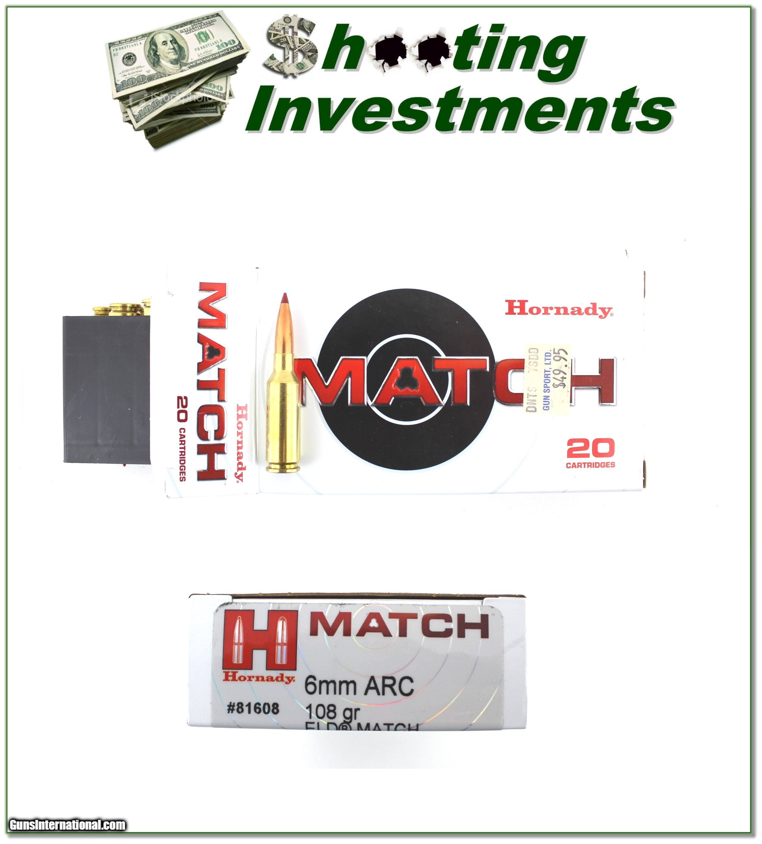 Description: This is a new box of 20 rounds of hard to find 6mm ARC Match ammo. It’s high-end ammo from Hornaday. It’ loaded with the 108 Grain EDL Match bullets. I have 2 boxes. Shipping must be through UPS and requires adult signature. It’s the same regardless of how many boxes you buy. Shipping is $19.95 and please email me with any questions or larger pictures. (Consign your quality firearms with Shooting Investments for only 12%! Let me know if you have any you would like to sell!) 25-a003 Payment: Payment is by Money Order, Cashier’s Check or Personal Check. I can now also accept Credit Cards (MasterCard, Visa, Discover & American Express) with a 3% convenience fee. Shipping: The shipping charge will be listed in each description. It is $49 for most firearms. Some heavy guns or those insured for over $2000 will be higher. Shipments to Alaska and Hawaii are higher because air shipment is required. Most firearms are shipped on Tuesday and Thursday and usually in 5 days of receipt of payment. We package all shipments carefully and insure them. Optics are shipped Priority Mail and most other non-firearm shipments are shipped First Class. Returns: Our return policy is simple. If for any reason you are not pleased with your purchase, you may return your item for a full refund of purchase price. Ammunition cannot be returned. It is important to us that you are happy. Guns cannot be fired or dissembled before returning them and they must be returned in the same condition as received. Notification of a return must occur within 3 days of receipt at your dealer. Shipping, convenience and dealer fees are not refundable and are the responsibility of the buyer. Lay-a-way: If needed, we offer a 60 day lay-a-way option on most firearms. It is 1/3 now, 1/3 in 30 days and 1/3 in 60 days. Lay-a-way firearm sales are final and cannot be returned. If a lay-a-way is not completed the first payment cannot be refunded. Consigning your firearms with Shooting Investments: We will help you get top dollar for your firearms. While most local guns shops charge 20% or more, our fee is only 12% with a minimum of $100. At your local gun shop it might take months to sell. Selling on-line provides instant access to thousands of interested buyers. You won’t find any other on-line dealer willing to sell your firearms for only 12% or listing every gun on 3 separate s. Selling through an House typically costs the seller 15% and the buyer an addition 15% (so 30%) and you have to wait several months to sell and longer to receive funds. If properly priced, we will sell your firearms within a few weeks. Send us an email or give us a call and we’ll explain how easy it is for you to get top dollar. Trading: Trading for us is really just buying your gun to re-sell. If you have a gun you want to trade, please email a picture and we will let you know what we can give for it. You will always get more if we sell it for you on consignment. SOLD |