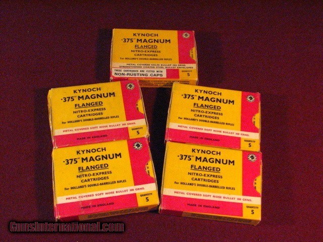 Description: Five boxes [25 rounds] Kynoch .375 Holland & Holland Flanged ammunition with 300 grain soft nose bullets and eleven Kynoch empty brass cases. All in good condition. SOLD |