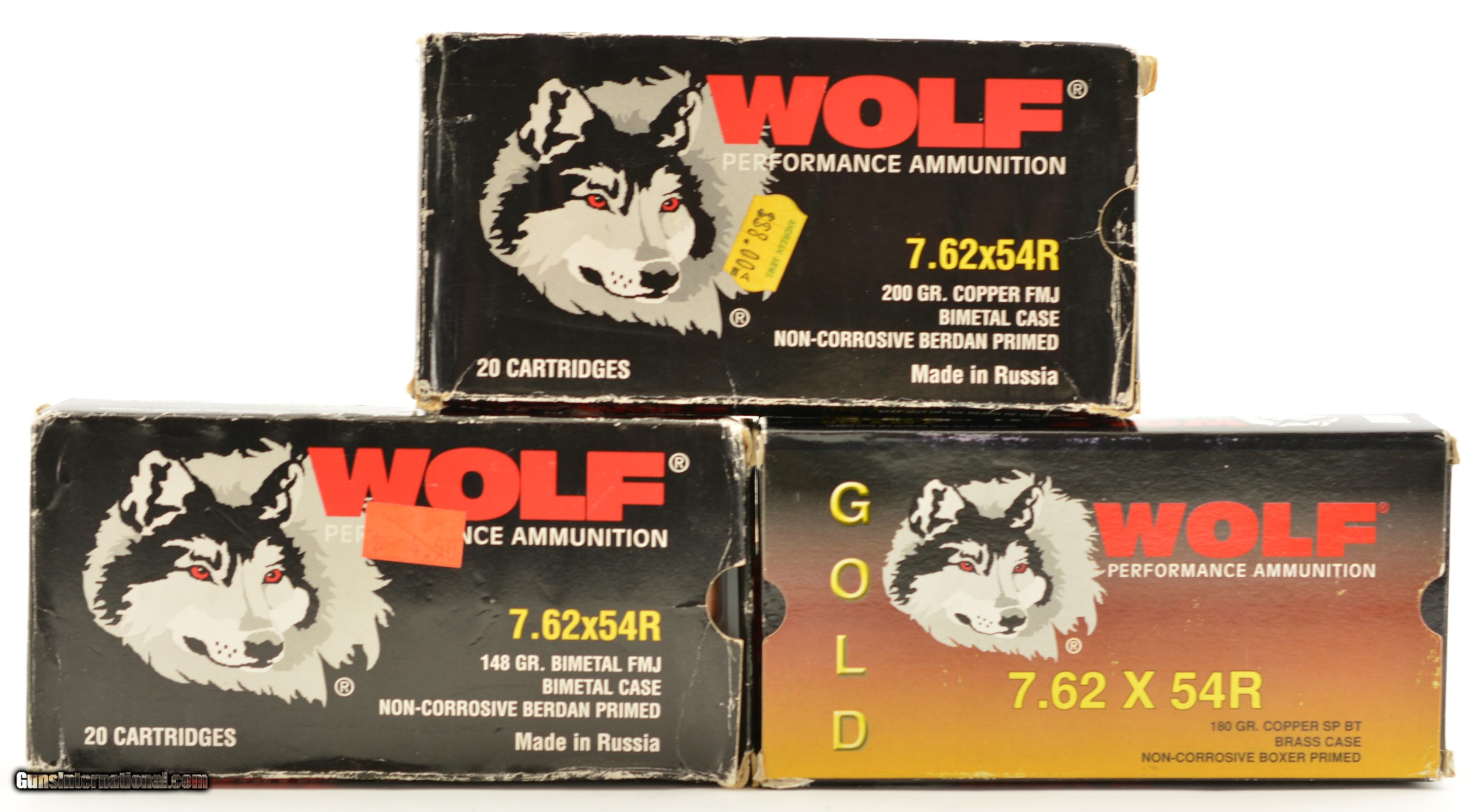 Description: This is a lot of Wolf 7.62x54R Ammunition consisting of one NOS full box of 200gr. Copper FMJ in Bimetal case, one NOS full box of 148gr. Bimetal FMJ in Bimetal case and the last is a hunting load Wolf Gold made by the Serbian company PPU it is 180gr. copper soft point with a brass case. SOLD Manufacturer: Wolf Model: Ammo Caliber Info: 7.62x54R Gauge Info: 7.62x54R |