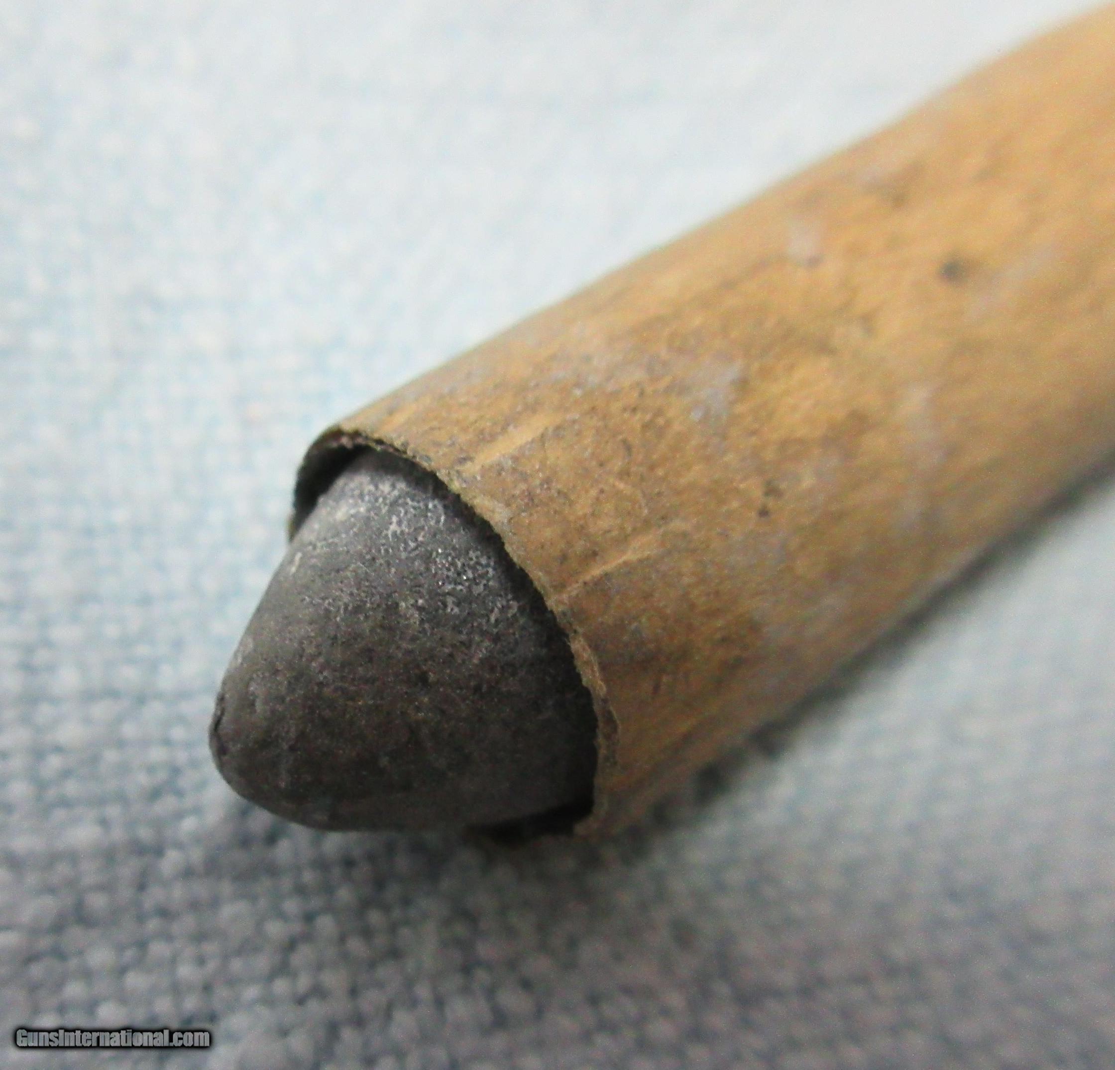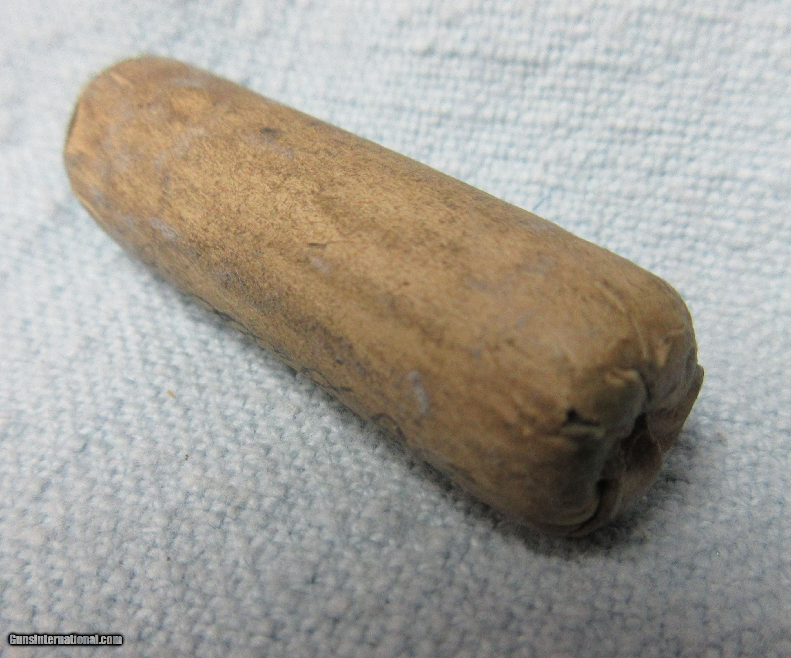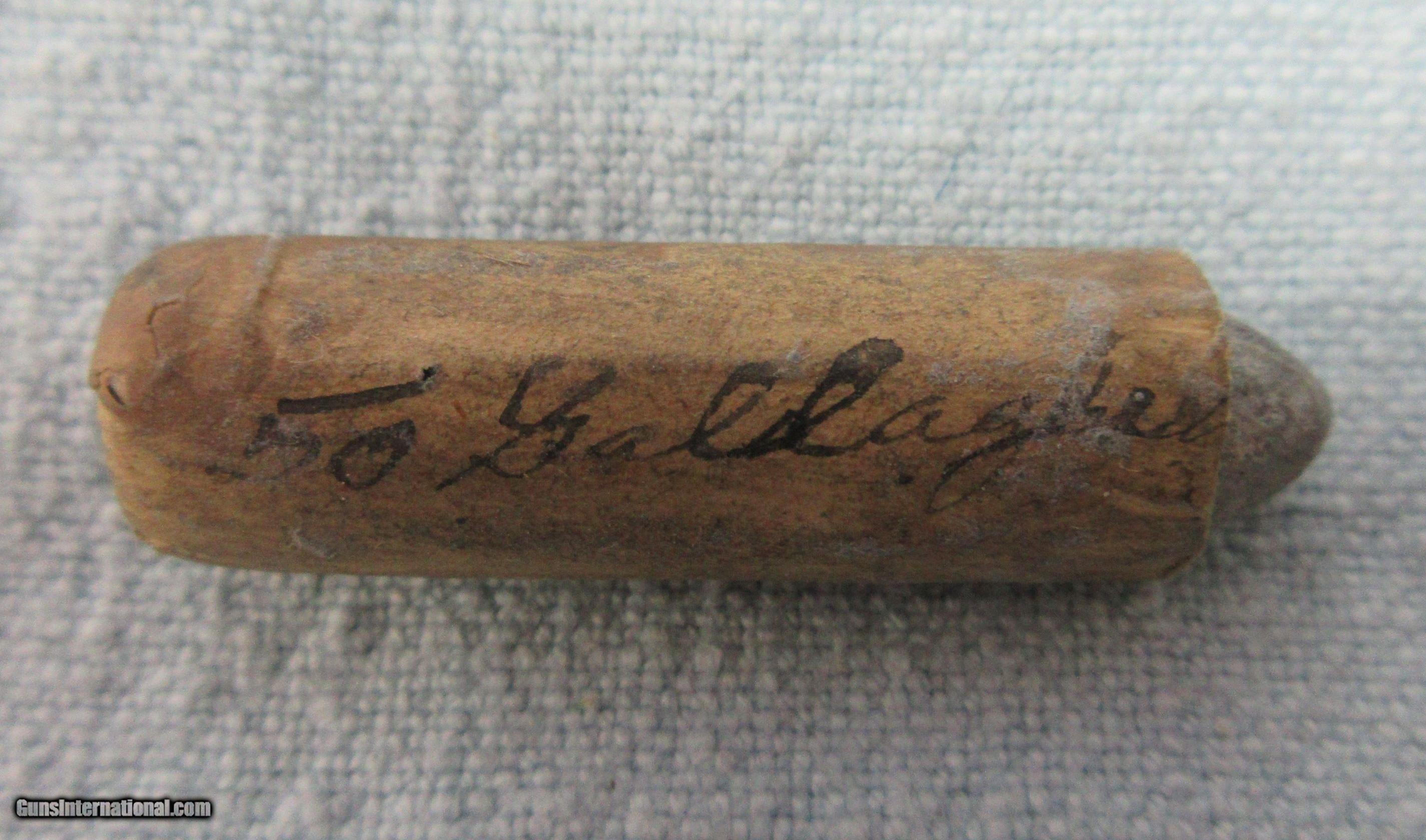 Description: A very fine example of a .50 caliber foil & paper Gallager cartridge. These are not often seen in original, intact condition. Old elegant ink identification. SOLD |