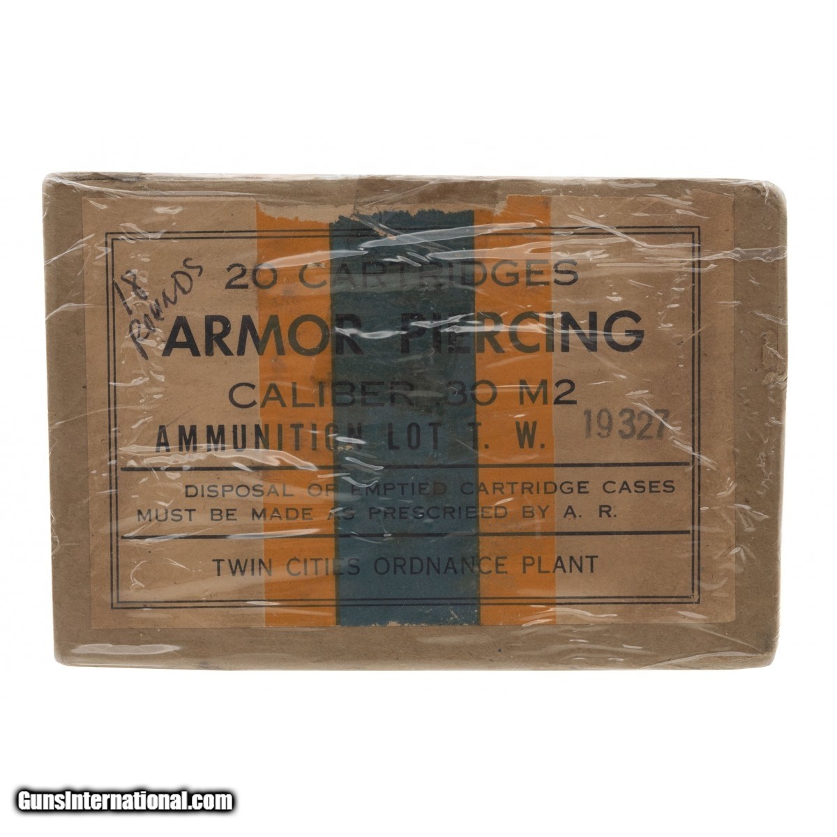 Armor Piercing Caliber 30 M2By Twin Cities Ordnance Plant. Only 18 rounds. Two fell out. Side of Box Torn.