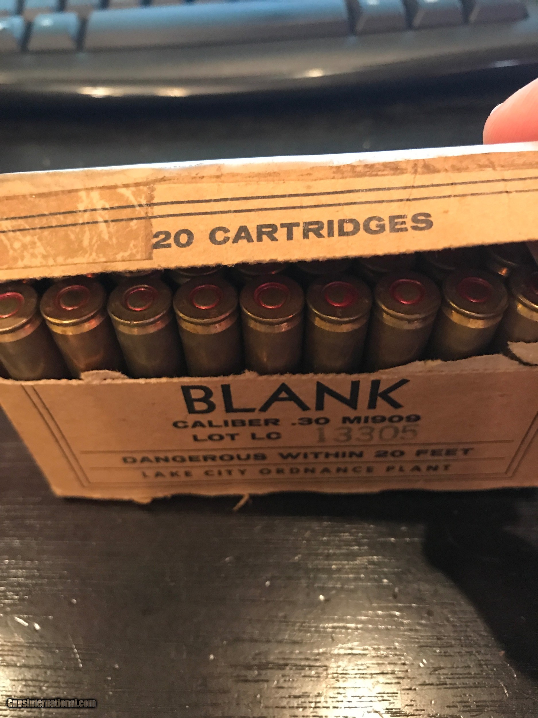 Description: I have two boxes of 20 cartridges each of Frankford Arsenal's Army lot 1377. The tops remain sealed but it is likely they have been opened from the side and re-taped, someone lifted a flap to take a peek at what's inside. These will be shrink wrapped before shipping for safe and secure transport and to reduce any further damage. Shipping will be $20 for this lot. Also included is an opened box of .30 M1909 blank cartridges, Lake City Ordinance Plant - mixed head stamps but a full box of 20 blanks nonetheless. SOLD |