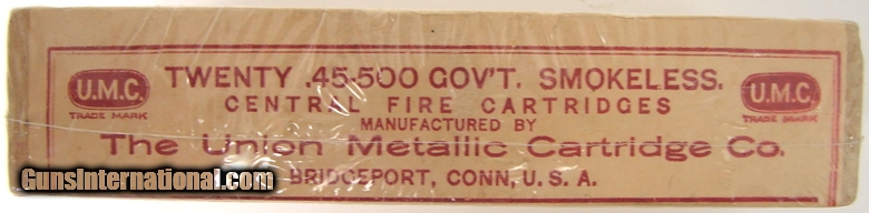 Description: 45-500 Government Smokeless Caliber central fire cartridges mfg by UMC