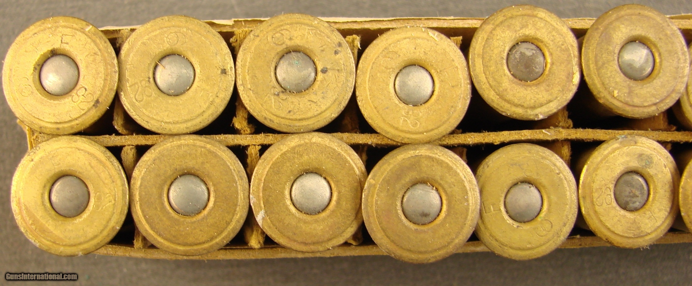Description: A 20 round box of loaded .45-70 blanks from Frankford arsenal dated 1882. A buff color 2 piece box with black printed dark blue label reading "20/rifle and carbine blank cartridges/after firing blank cartridges the chamber of the gun must be/thoroughly cleaned, before using ball cartridges/dangerous within twenty-five feet/manufactured at the Frankford arsenal." The label-seal has been slit but all ammo is intact. One end piece is missing. A box for the US military ammo or trapdoor collector. Antique SOLD Manufacturer: Frankford arsenal Model: Ammo Serial Number: NSN Caliber Info: .45-70 Gauge Info: .45-70 |