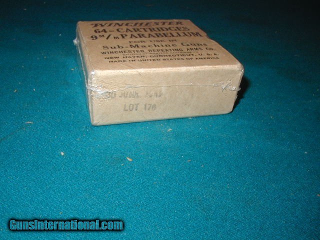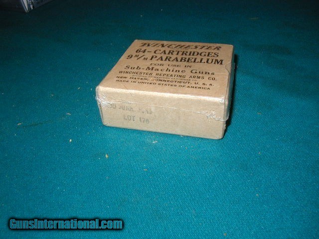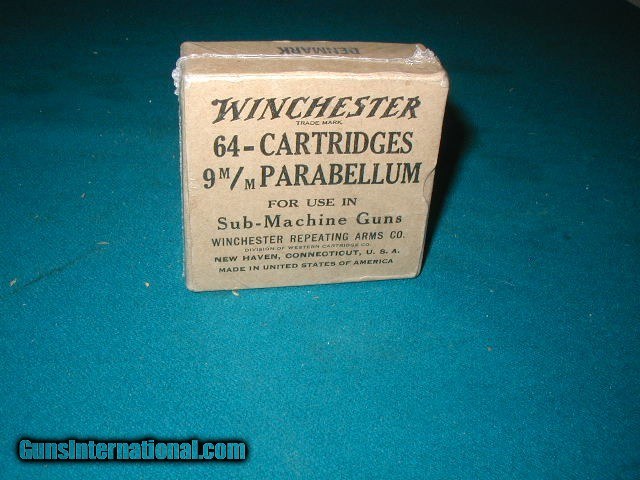 Description: ***** SPF ***** THIS IS A NEAT, VERY COLLECTIBLE BOX OF WW2 DATED WINCHESTER 9MM SUB MACHINE GUN AMMO...MARKED ; DENMARK....PRESUMABLY FOR THEIR SUB MACHINE GUNS....ONLY ONE I EVER SAW...IN MINT ORIGINAL SEALED CONDITION SOLD |