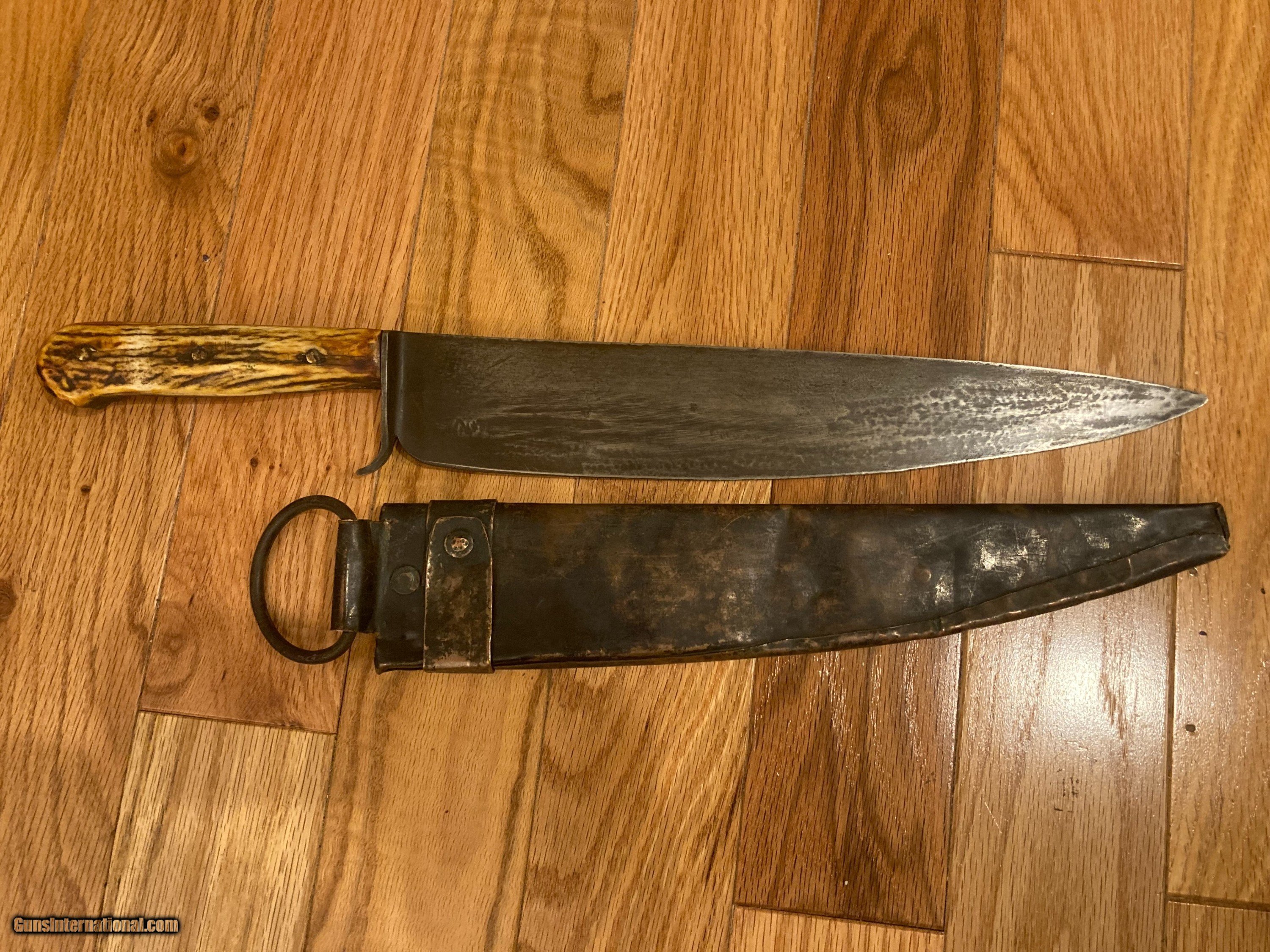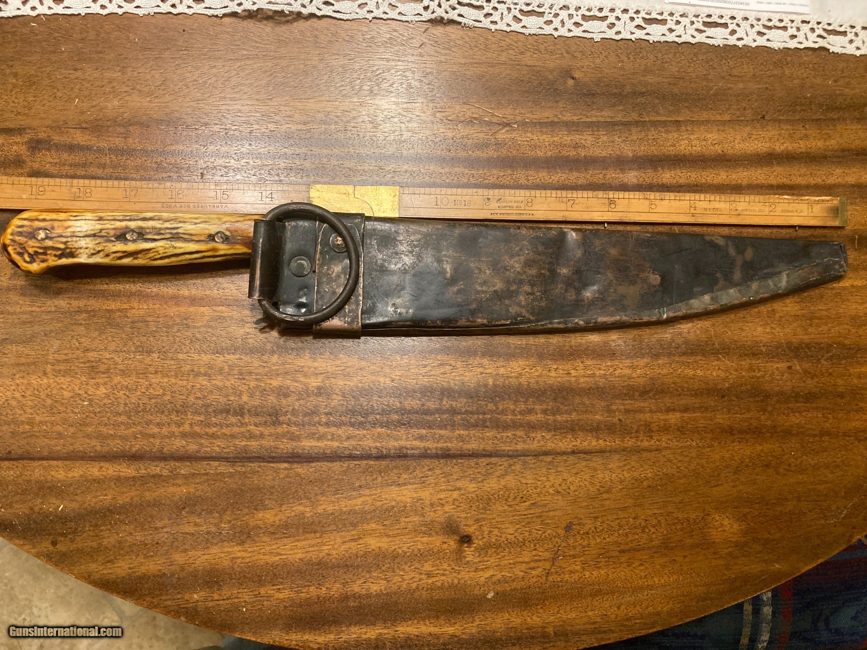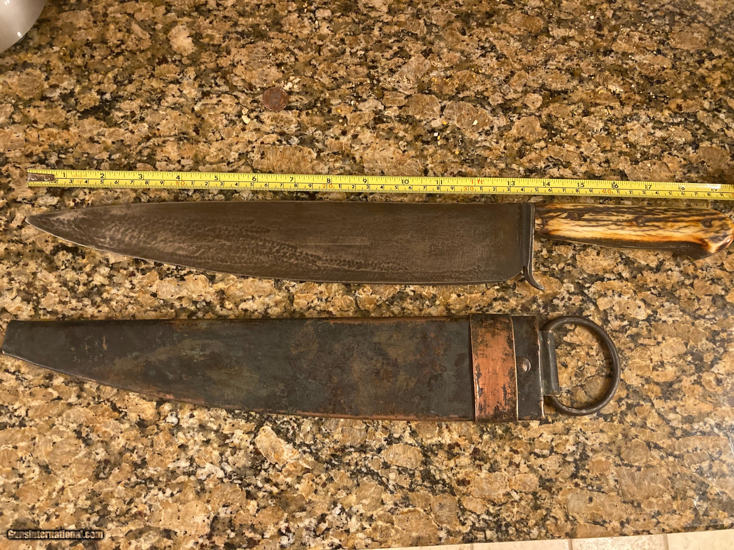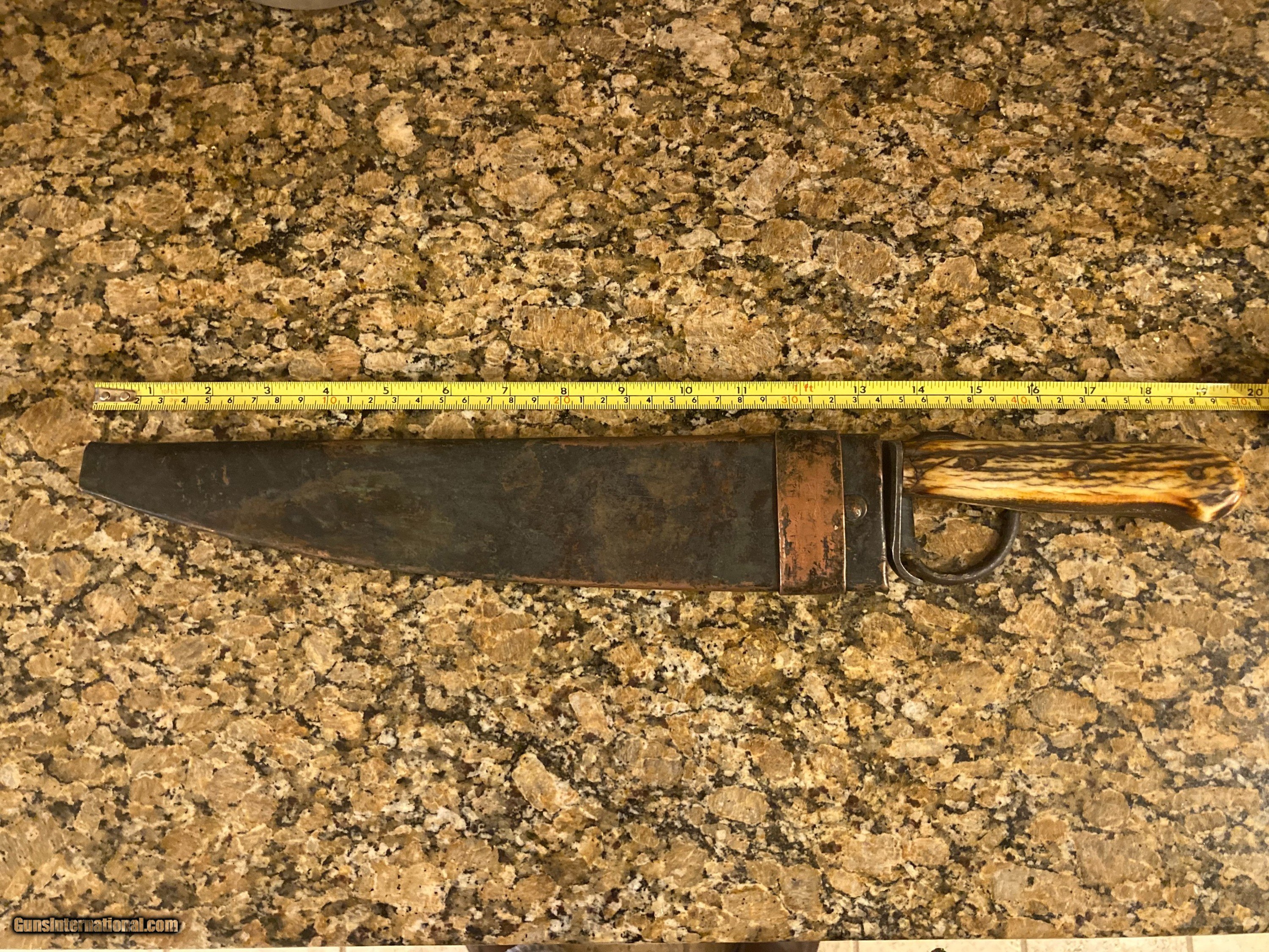 Description: Large Bowie 19 inches over all with a 13 1/2 inch blade. This is simular to a chefs knife but larger than any I have seen. It has a butcher knife type blade that was used to butcher a Baffalow, Bear, or large game in ny opinion. The Scabbard is blacksmith made of copper, and folded over with a copper strap folded over and ribbited. Scabbard has a loop inorder to mount to a belt. The blade has a blued appearance but the blade turns that color when it is in the scabbard for a long period of time.Their is a chance this knife may have been used during the Civil War as it was purchased in Alabama. I have been unable to locate any makers marking on the blade or scabbard. Grips are Stag and show much use, there are age cracks as photoed but the grips are tight and held in place with copper pins. This Bowie is a great knife for display and will be a great addition to your collection. buyer pays shipping and insurance. I accept Bank Cashiers Checks or Paypal. I allow a three day inspection period, I must be contacted during the said 3 days of intent to return Buyer pays return shipping and must be insured. Thank You for looking. J C. SOLD |