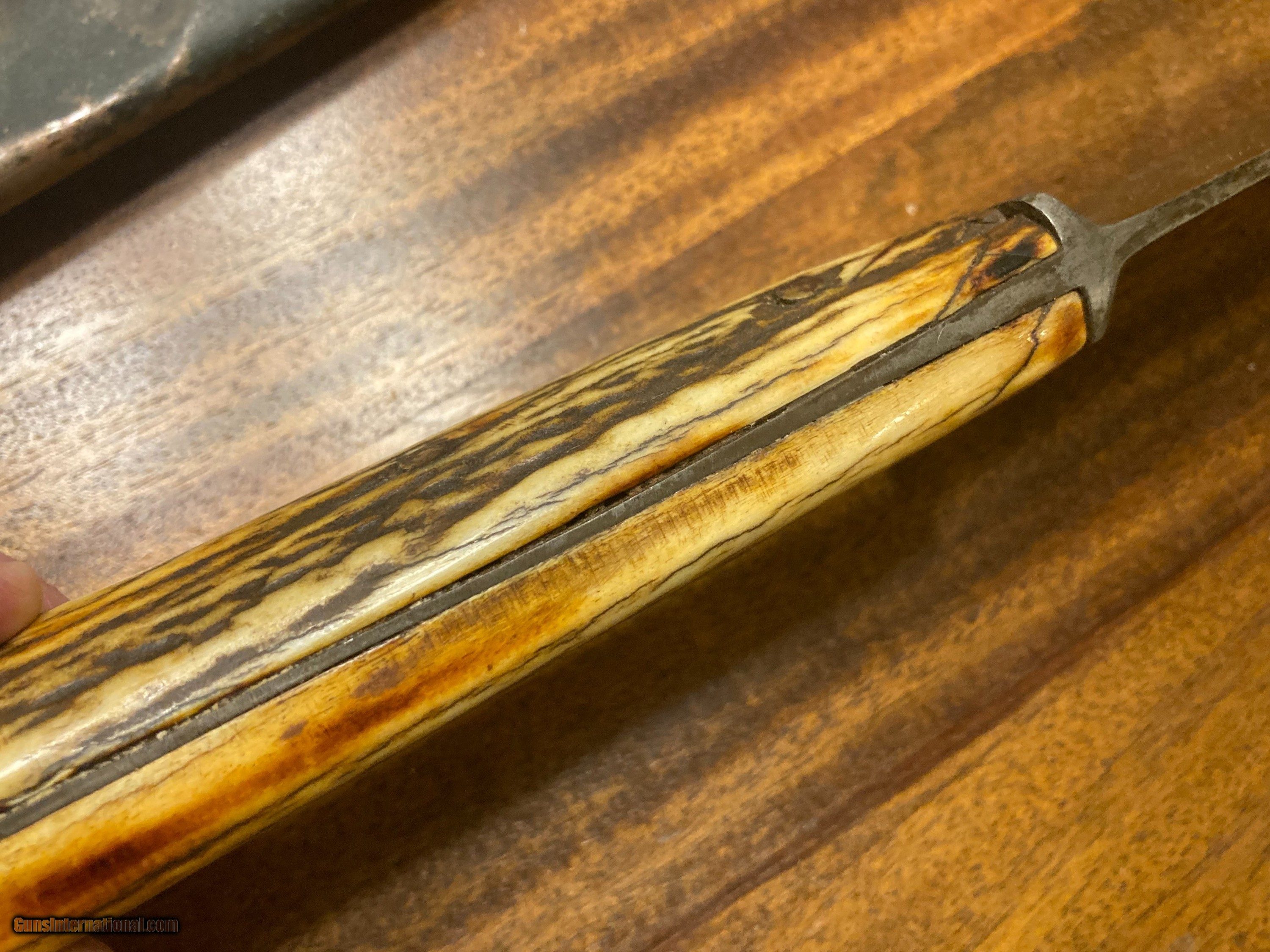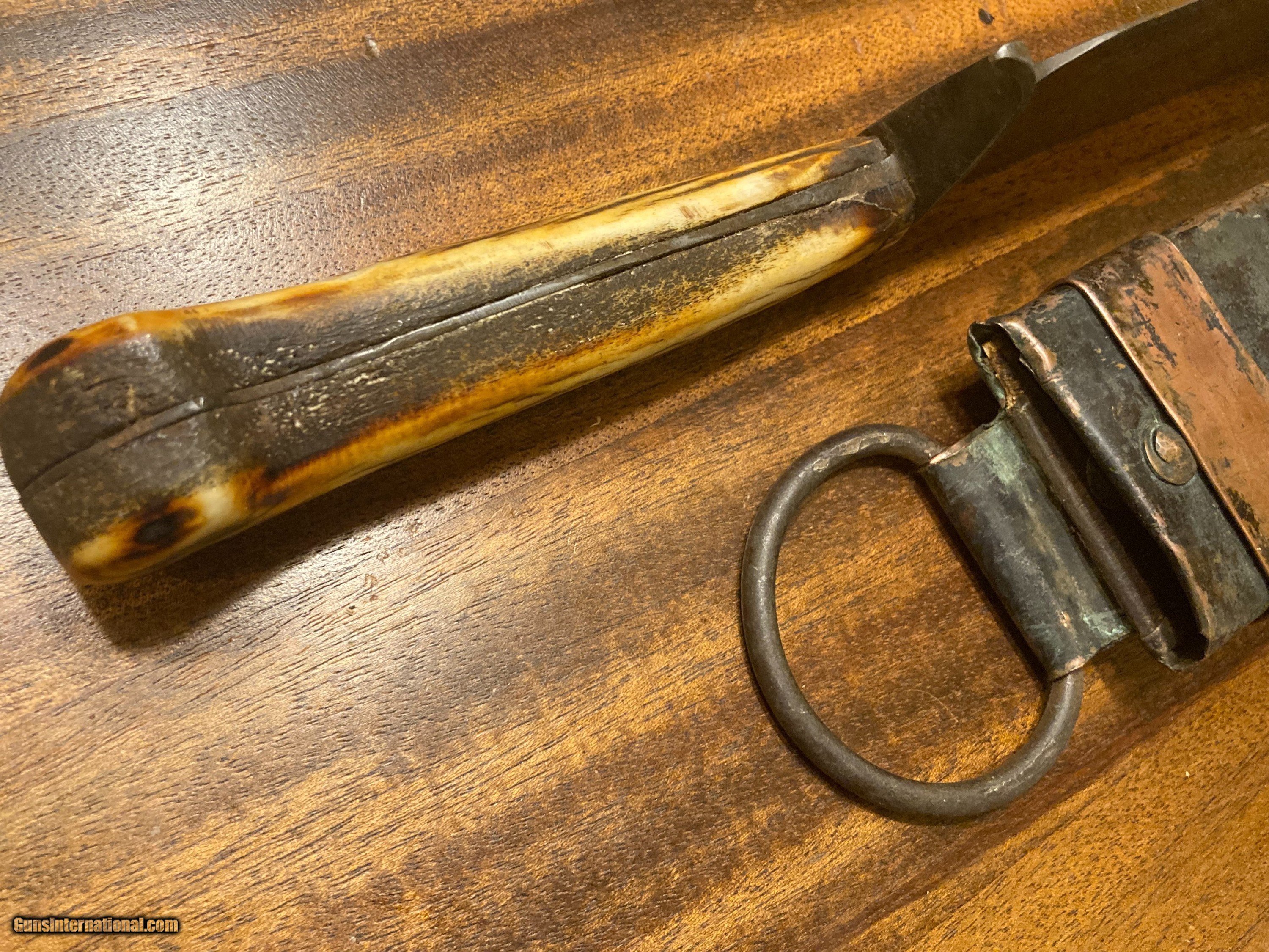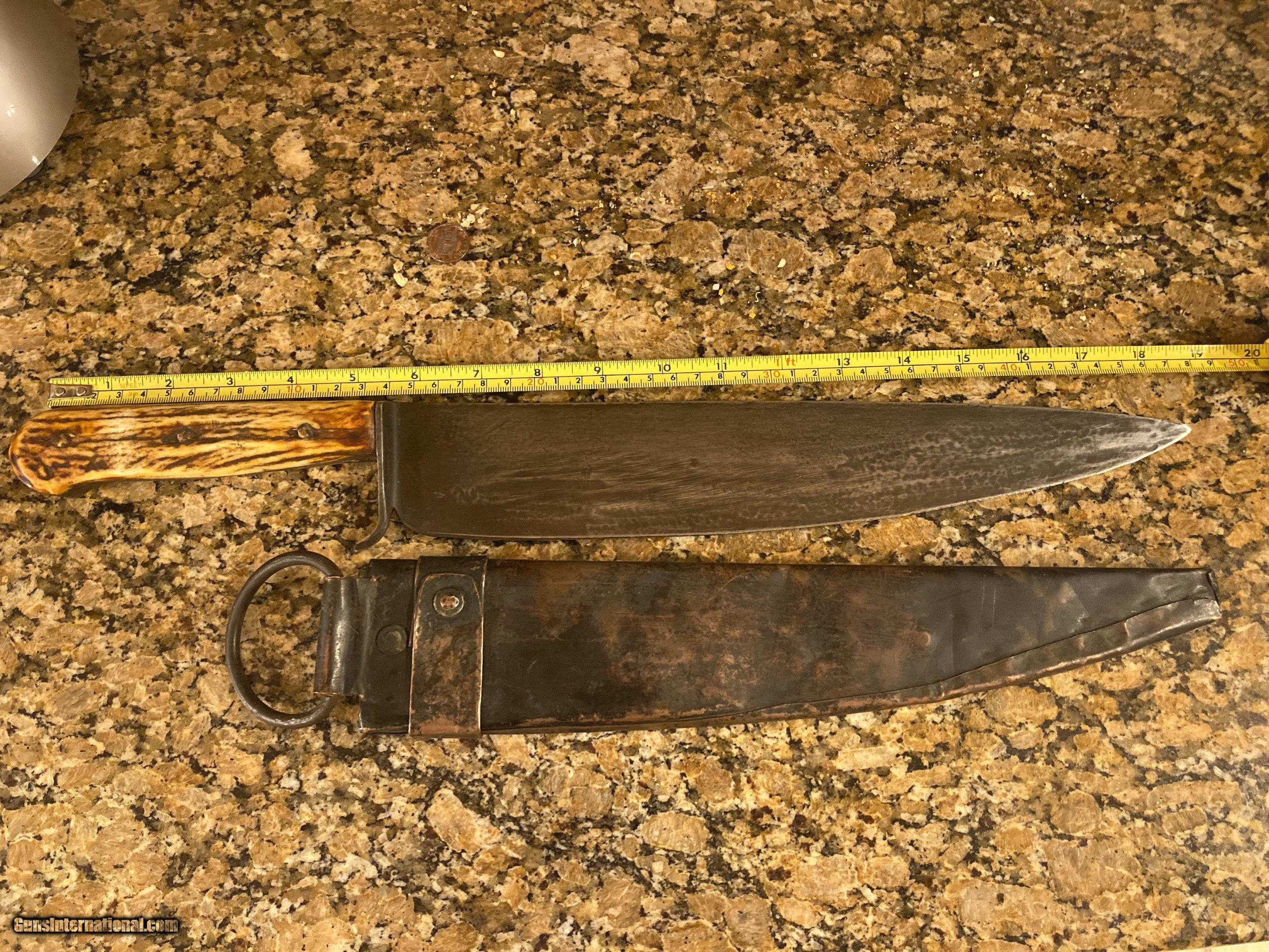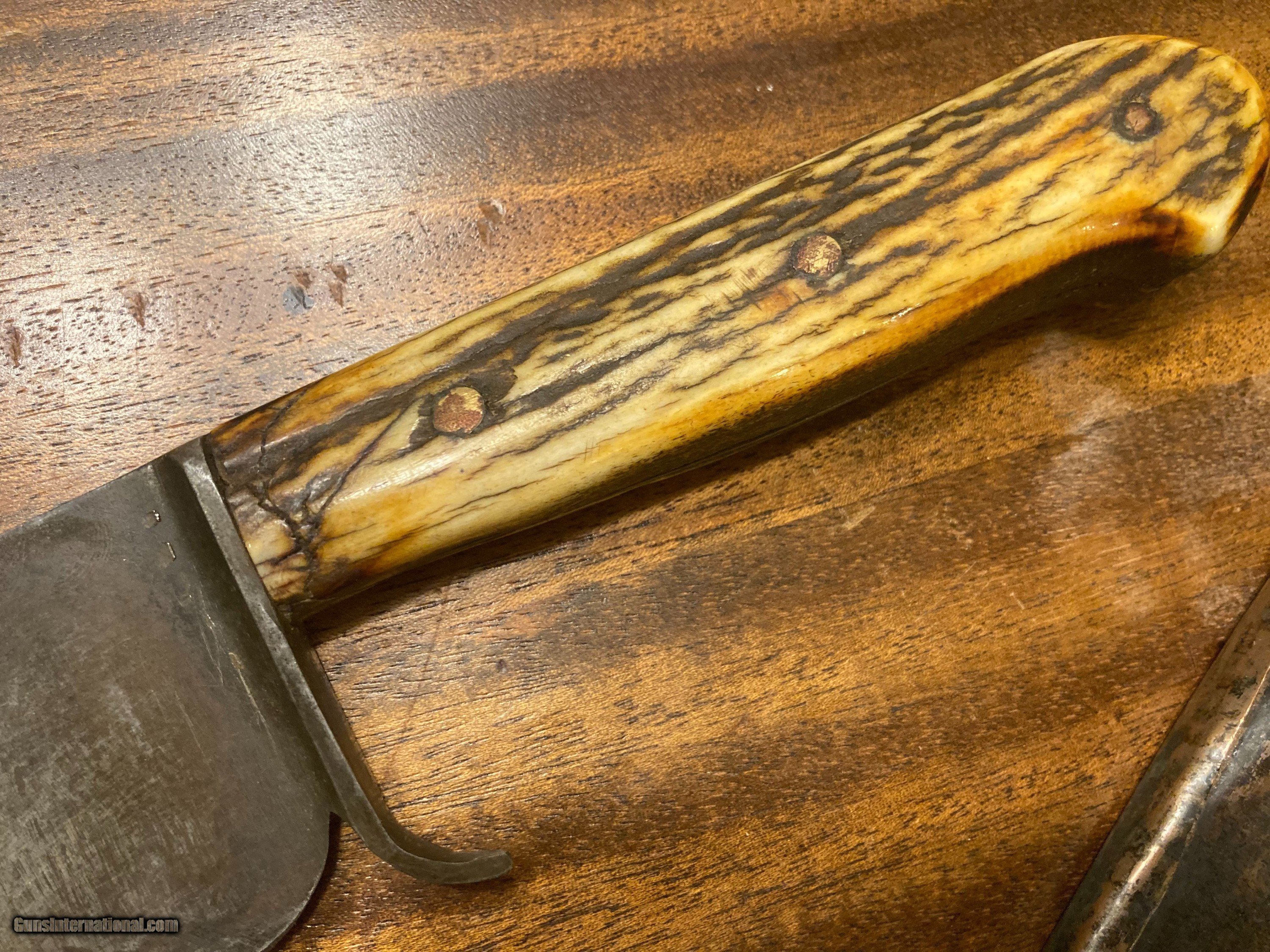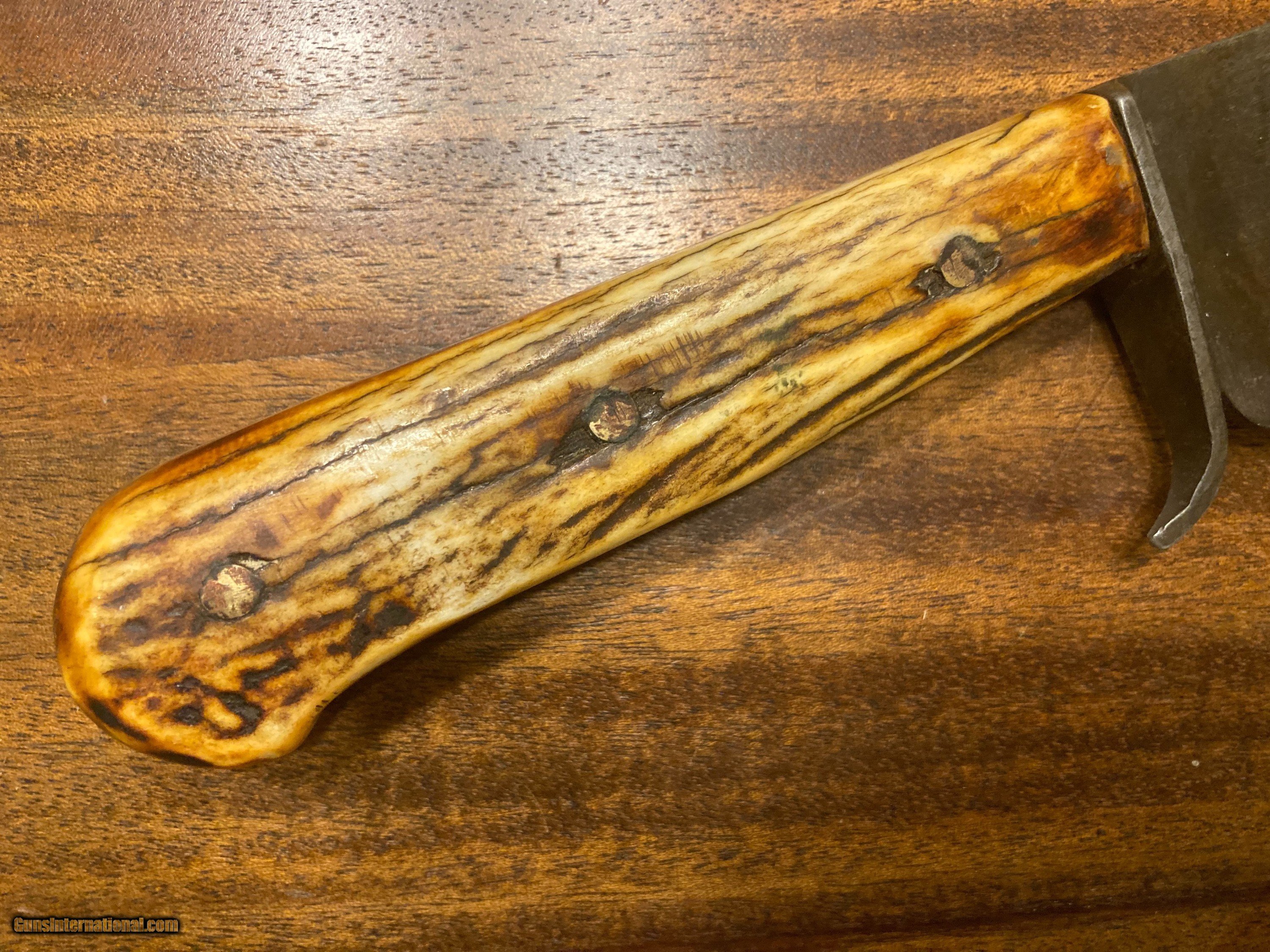 Description: Large Bowie 19 inches over all with a 13 1/2 inch blade. This is simular to a chefs knife but larger than any I have seen. It has a butcher knife type blade that was used to butcher a Baffalow, Bear, or large game in ny opinion. The Scabbard is blacksmith made of copper, and folded over with a copper strap folded over and ribbited. Scabbard has a loop inorder to mount to a belt. The blade has a blued appearance but the blade turns that color when it is in the scabbard for a long period of time.Their is a chance this knife may have been used during the Civil War as it was purchased in Alabama. I have been unable to locate any makers marking on the blade or scabbard. Grips are Stag and show much use, there are age cracks as photoed but the grips are tight and held in place with copper pins. This Bowie is a great knife for display and will be a great addition to your collection. buyer pays shipping and insurance. I accept Bank Cashiers Checks or Paypal. I allow a three day inspection period, I must be contacted during the said 3 days of intent to return Buyer pays return shipping and must be insured. Thank You for looking. J C. SOLD |