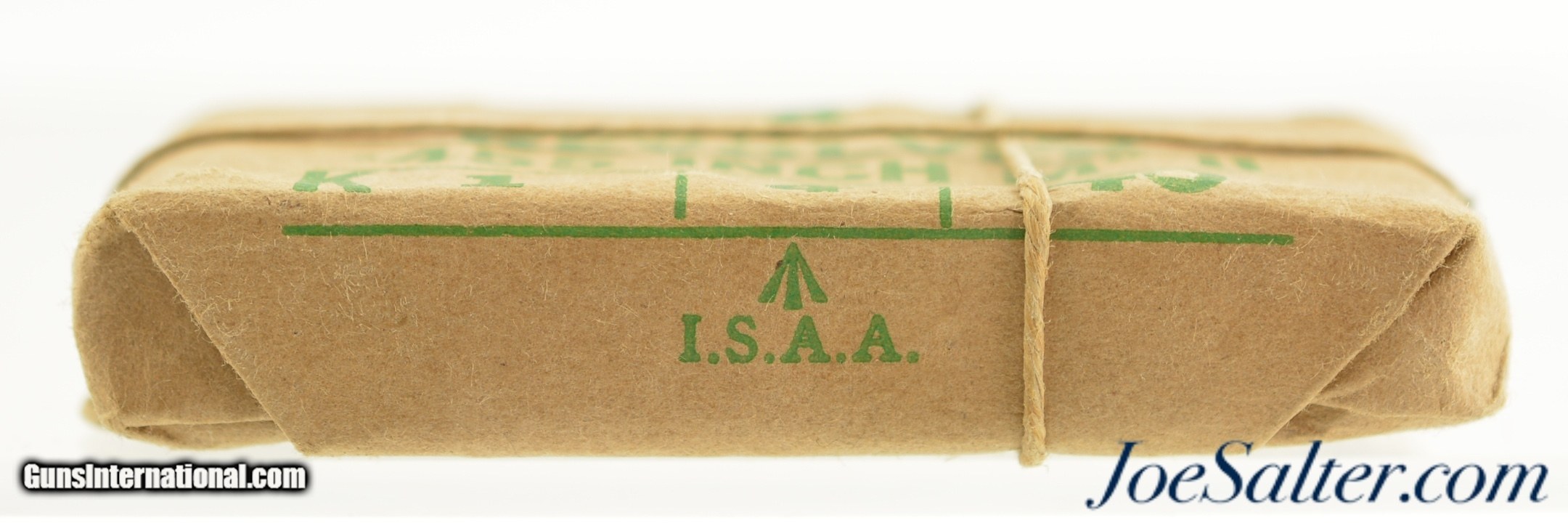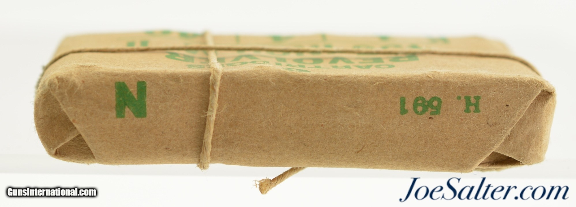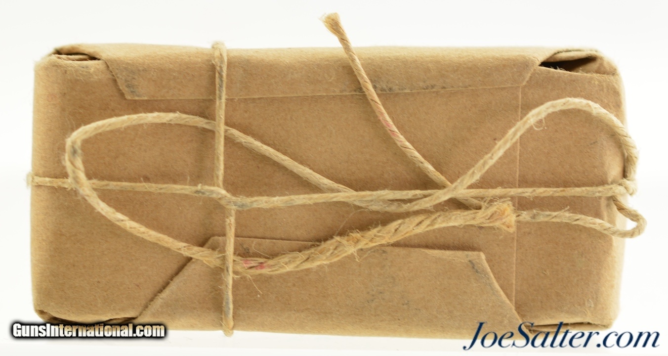 Description: This is an original WWII packet, 6 original rounds, of .455 Webley Revolver Mk II ammunition manufactured in 1940. The broad arrow marked packet is excellent with the original twine tie and sealed brown paper wrapper which is clearly marked. A great WWII issue ammo packet that is perfect for display with your revolver. Last One! SOLD |