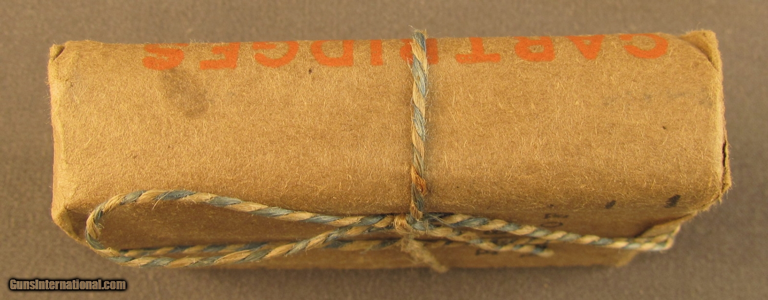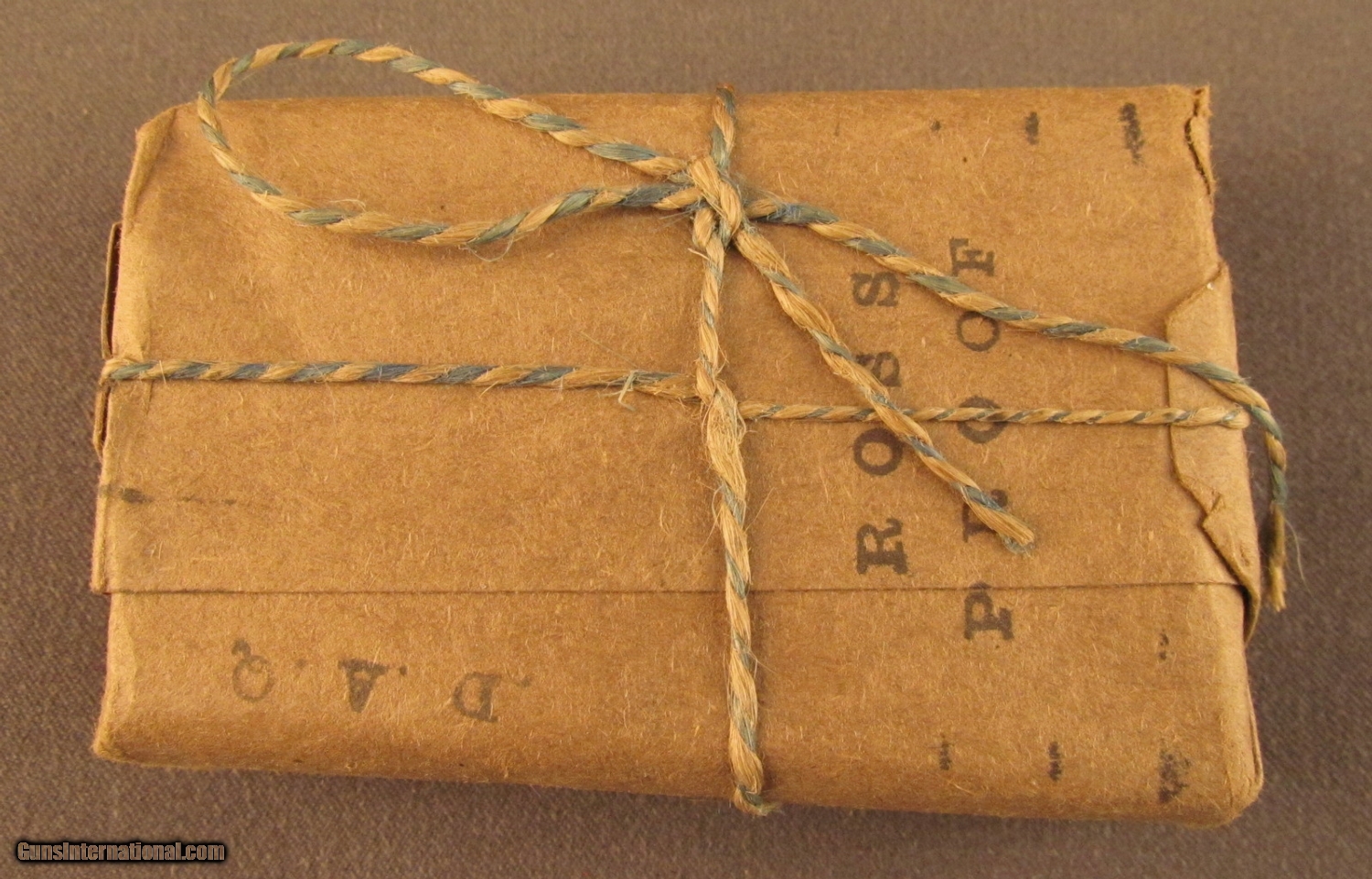 Description: A very scarce military ammunition which is a 10 round broad arrow over "DA" of Dominion arsenal. Dated "29-4-10" with "Mark VI" designation and "Cordite" callout. This packet is rubber stamped "Ross Proof" on top, one end and bottom. Bottom and other end are stamped "D.A.Q.". Still tied with original string, this paper wrapped package is in excellent condition. This is a fantastic display item for the Ross collector or for any collector of military ammo. By the date this is probably some of the military proofing ammunition used at the time of the testing of the Ross M-10 by the Canadian military. It can be noted that there are no similar ammo packets shown in the "Ross Rifle Story". A scarce packet of military 303 dated in the period of testing the MKIII (M-10). See pages 54-56 of the above reference. A piece for the Ross or Canadian military collector. SOLD Manufacturer: Ross Model: Ammo Caliber Info: .303 Gauge Info: .303 |
