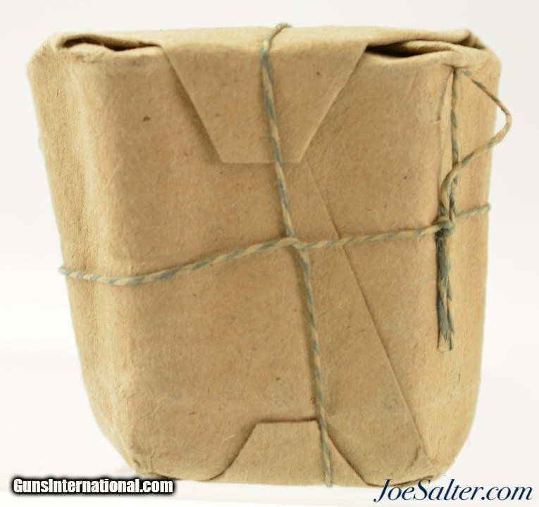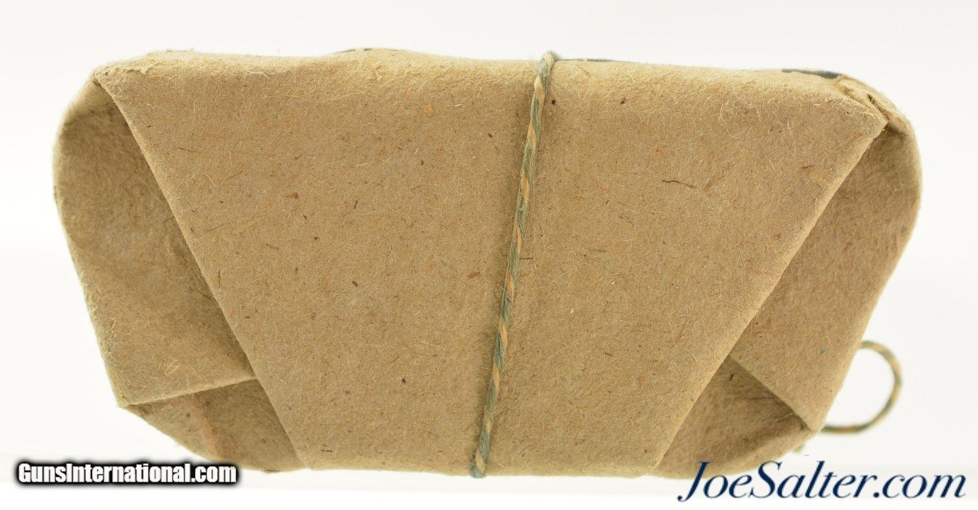 Description: This is an all original, full twine wrapped ammunition packet, 10 original rounds, of .577 Snider cartridges. The Canadian ammo packet is marked "D.C." and remains in excellent plus condition with crisp graphics showing only minor corner contact wear. A now quite scarce ammo packet in the highest condition dated 1890. Perfect to display with your Snider rifle. SOLD |