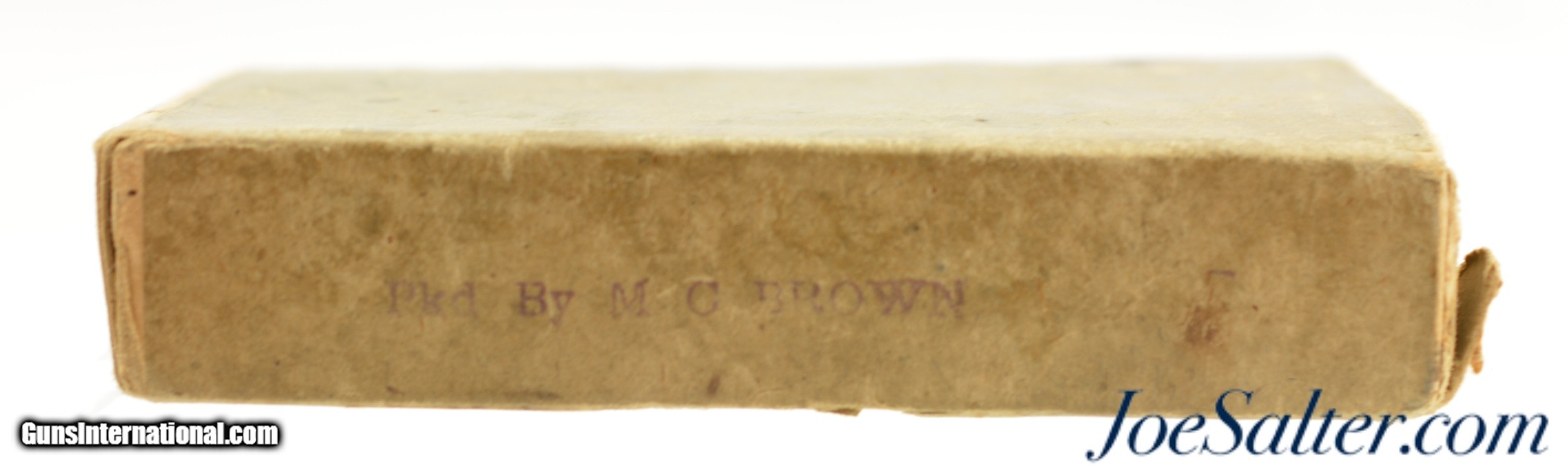 Description: This is a full box, 20 original rounds, of .30 Cal. Blank Cartridges, Model of 1909 for the Model 1903 rifle (.30-06) manufactured by the Frankford arsenal. The one piece box retains the original wrap-around label and is marked "Pkd By M.C. Brown" on the top with very crisp and legible graphics. The box shows an old tape repair to the right side and is missing some of the side flap allowing a peek inside. The cartridges are in clips and appear in excellent condition. An early military box that will look great on display with your 1903 rifle. SOLD |