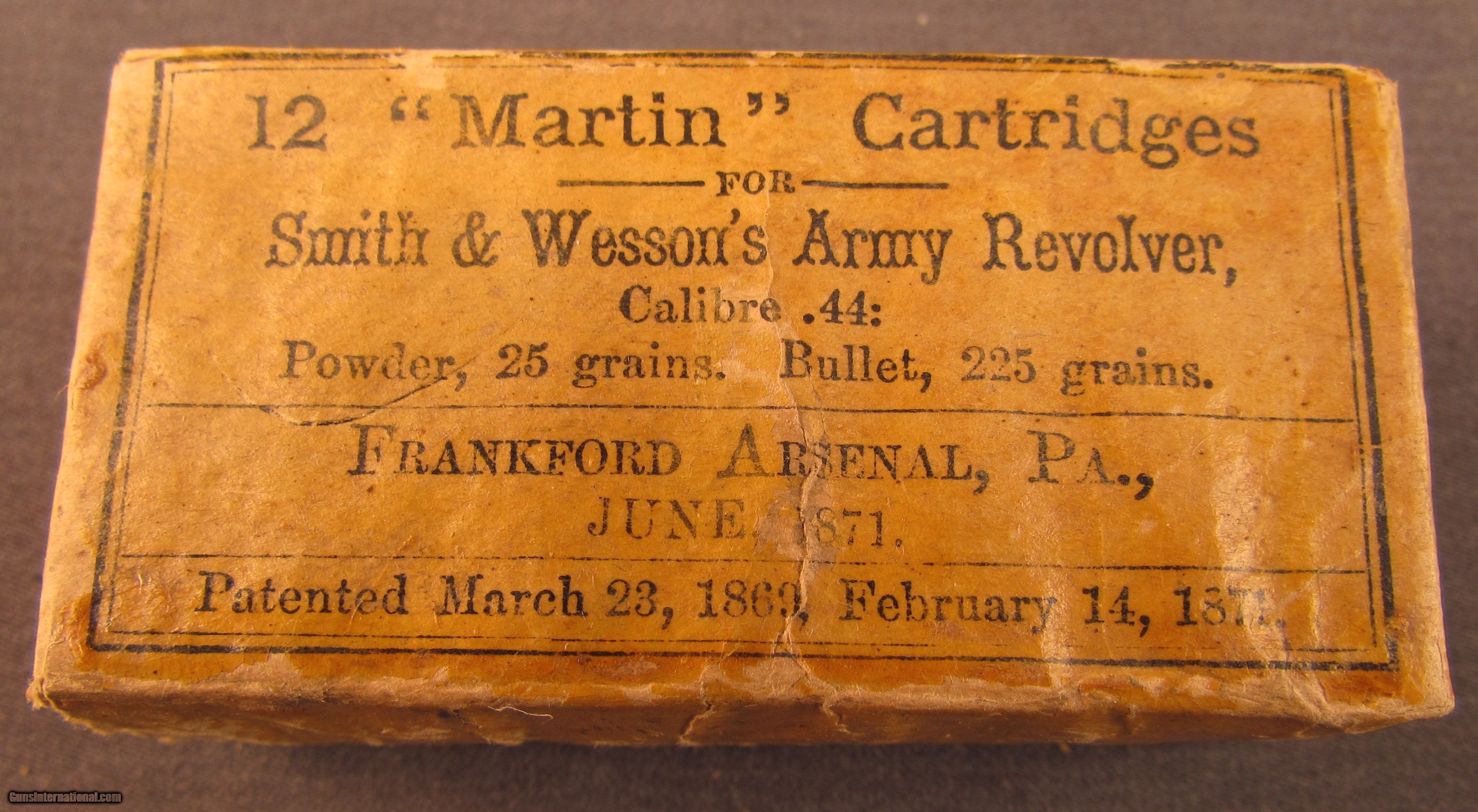 Description: Her we have a very scarce box of cartridges especially for the Smith & Wesson or U.S. Military Collectors. An original sealed box of 12 "Martin" cartridges for the Smith & Wesson Army Revolver. Cal 44. This Frankford arsenal packet dated June 1871. The packet measures 3" by 1 3/8 by 1". The face shows clear printing and all original paper wrap save the left side seam hat is partially open. This is a scarce US military packet with a relatively low survival rate. There is tremendous article written by the noted Author Charles Pate in Vol 52 No 1 of the Smith & Wesson Collectors Association Journal. A 12 page piece that tells the whole story of this ammunition. SOLD Manufacturer: U.S. Military Model: Ammo Caliber Info: .44 American Gauge Info: .44 American |