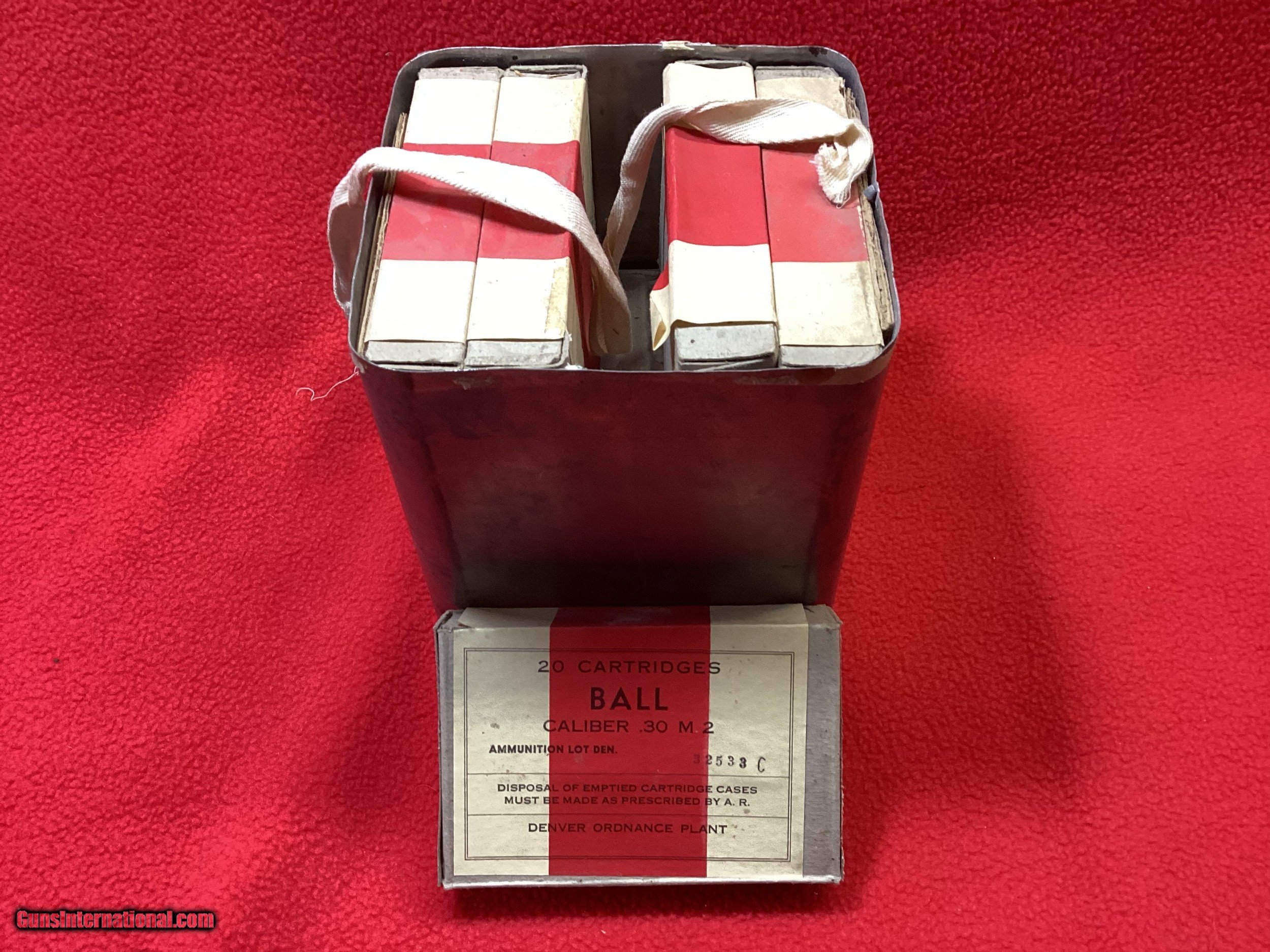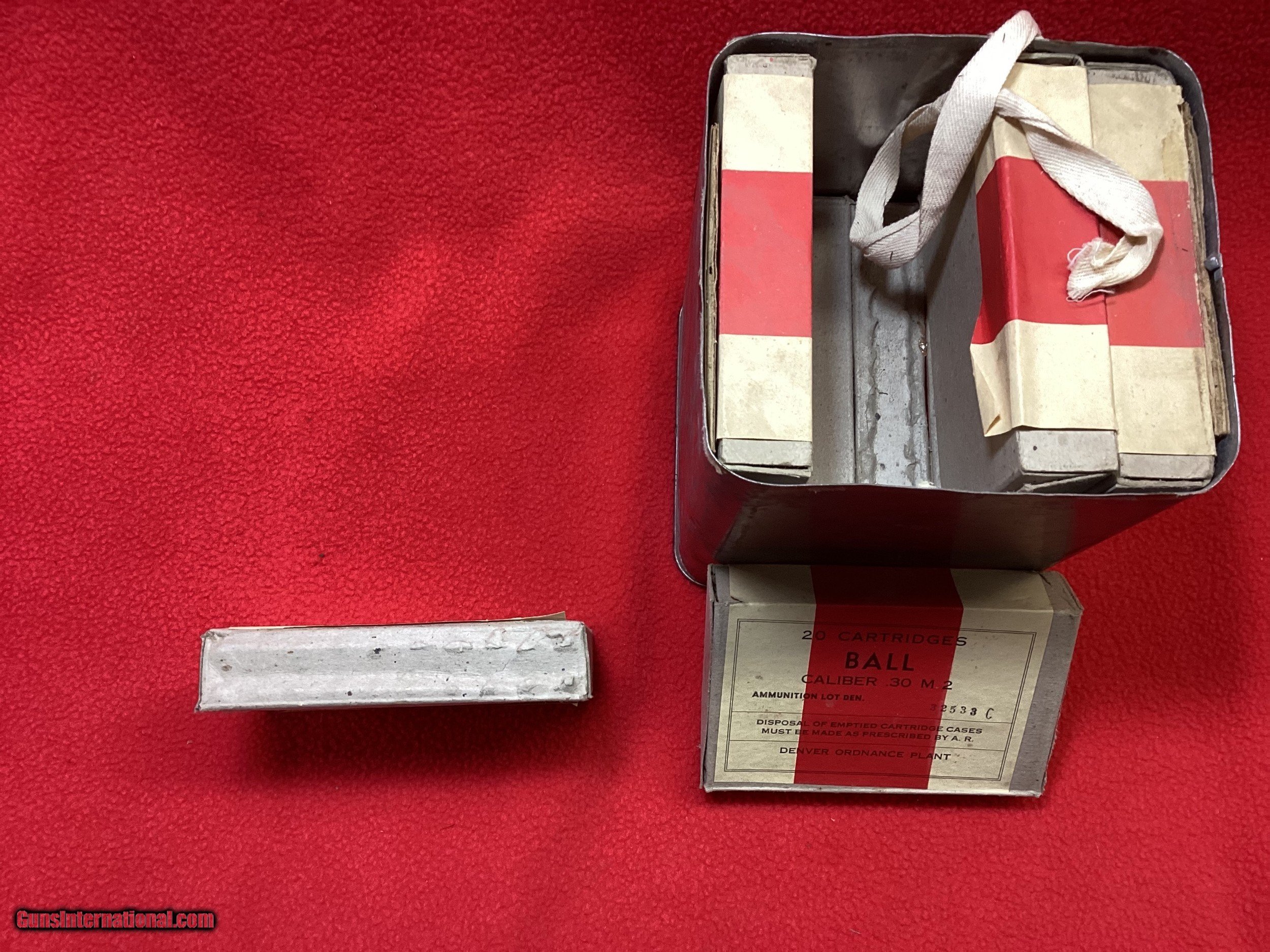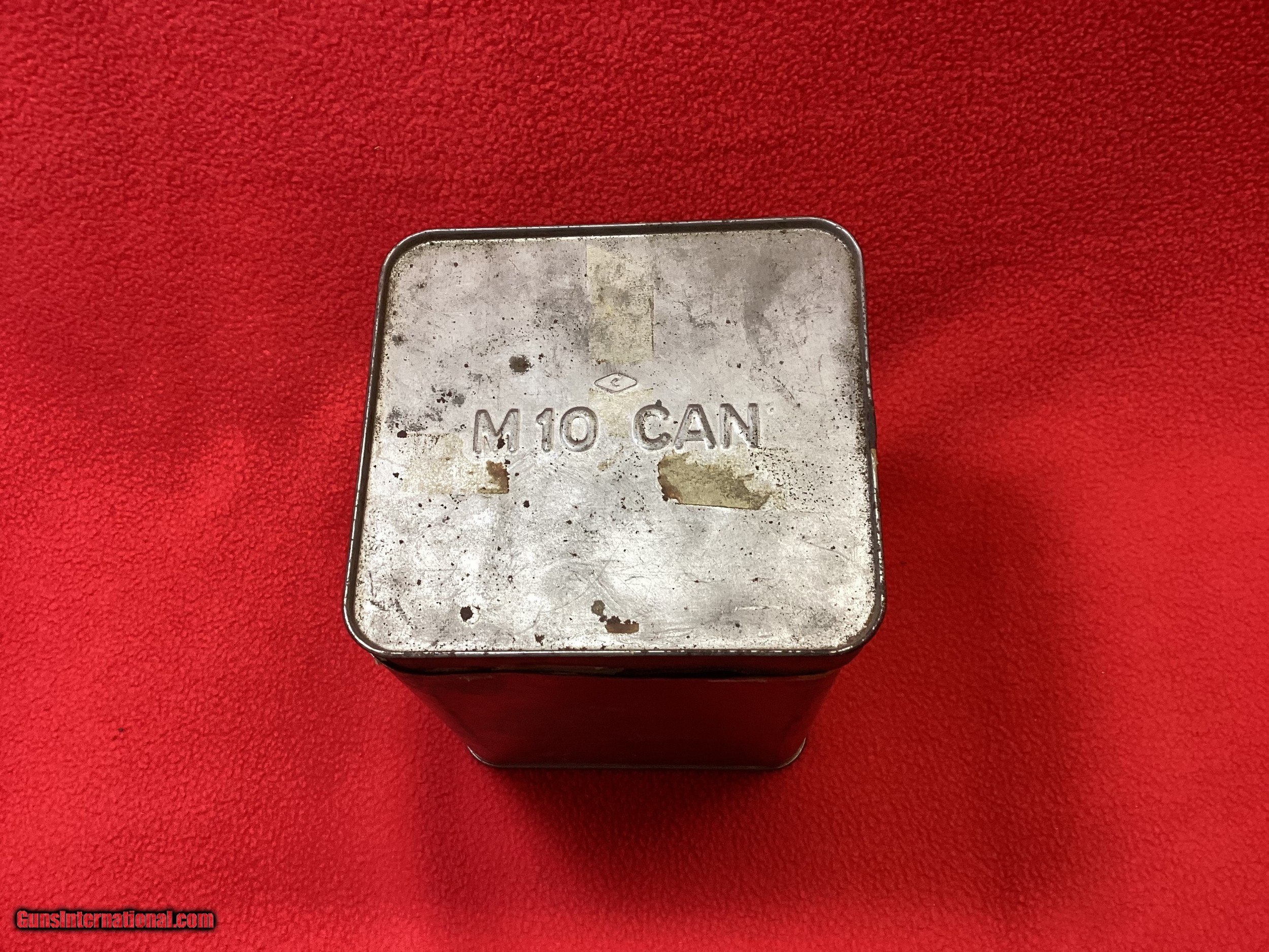 Description: *******************SOLD*********************FOR YOUR VIEWING IS A FULL SPAM TYPE CAN M-10 WITH 10 FULL BOXES OF MILITARY 1942 SECOND WWII DENVER ARSENAL MANUFACTURED. BOXES IN MINT CONDITION. SELL ALL AS ONE LOT. NOTE: SHIPPING AND INS. NOT INCLUDED SOLD |