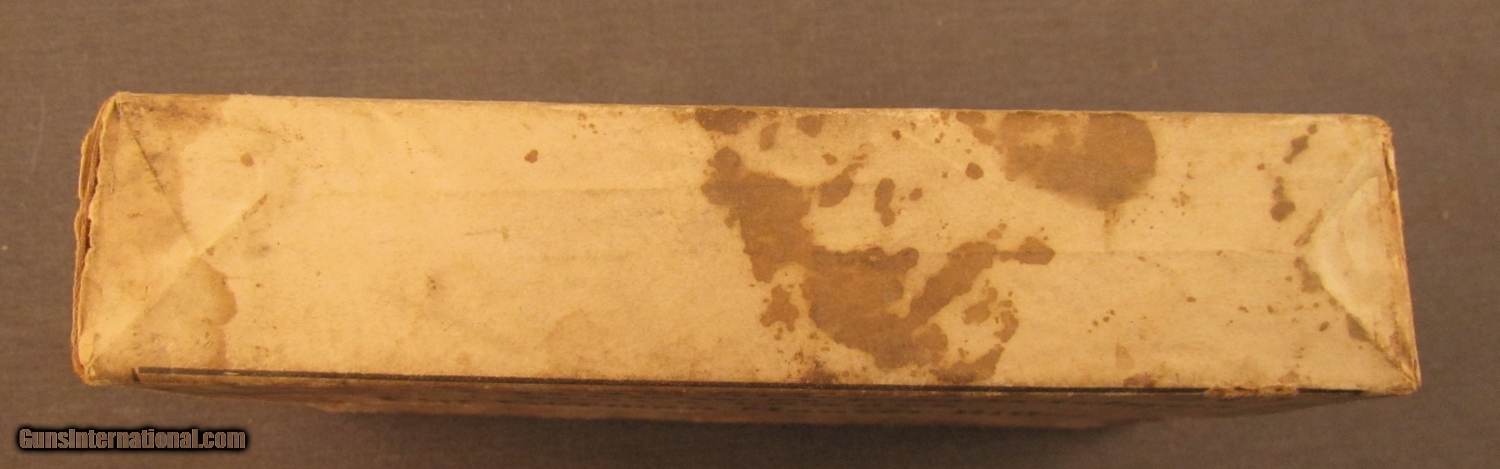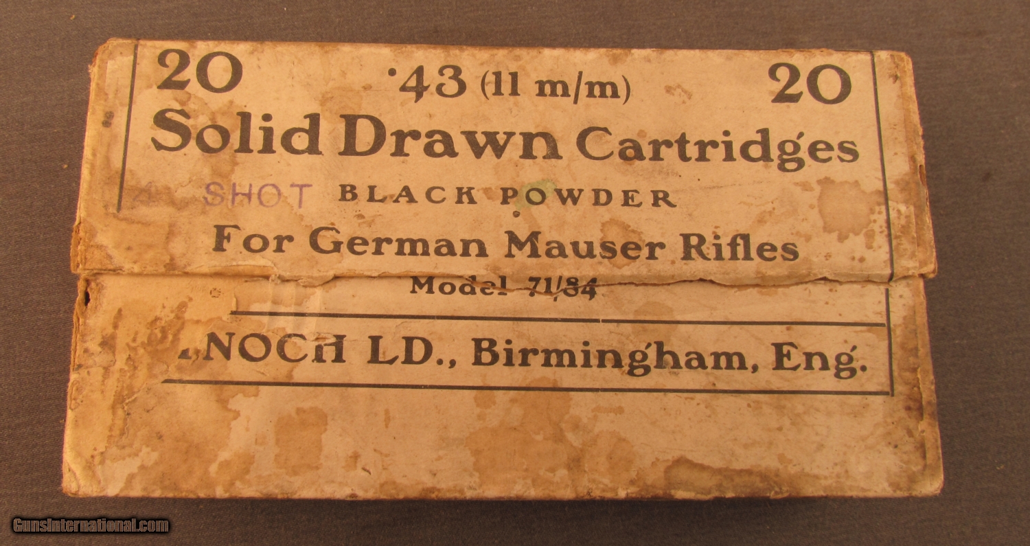 Description: Kynoch box of 19 (One rnd missing) 71/84 Mauser shot cartridges. A scarce box for the 71/84 collector. SOLD Manufacturer: Kynoch Model: Ammo Caliber Info: .43 Mauser Gauge Info: .43 Mauser |
