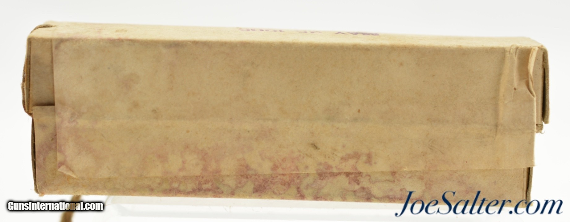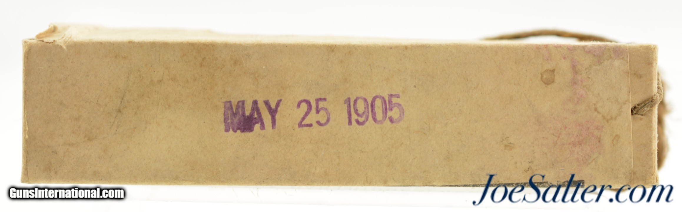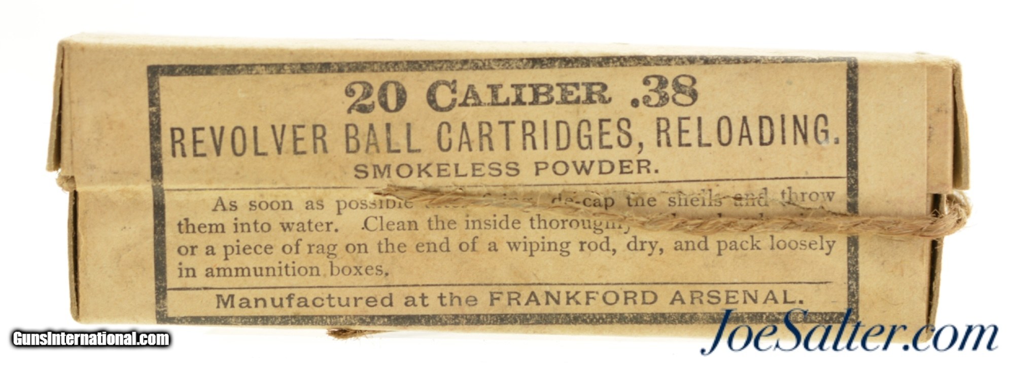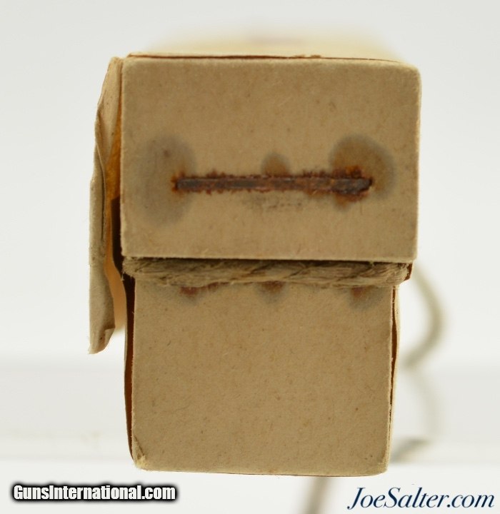 Description: This is a full, partially sealed and unopened packet of .38 Caliber revolver cartridges manufactured by the Frankford Arsenal. The US Army issue box, dated May 25, 1905, remains in excellent condition wit the twine opening chord pulled through 2/3 of the primary side seal label. The box however has not been opened. An excellent box for the military ammo collector or to display with your early US military revolver. SOLD |