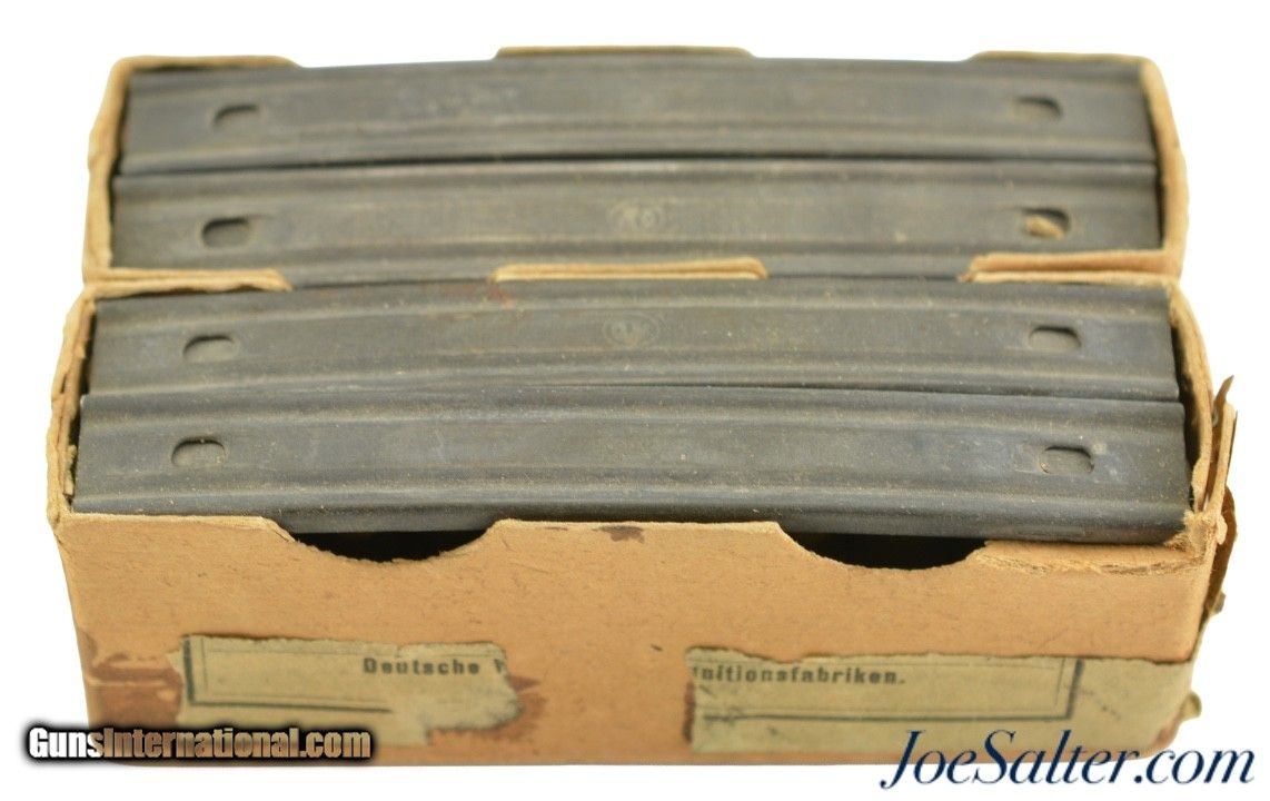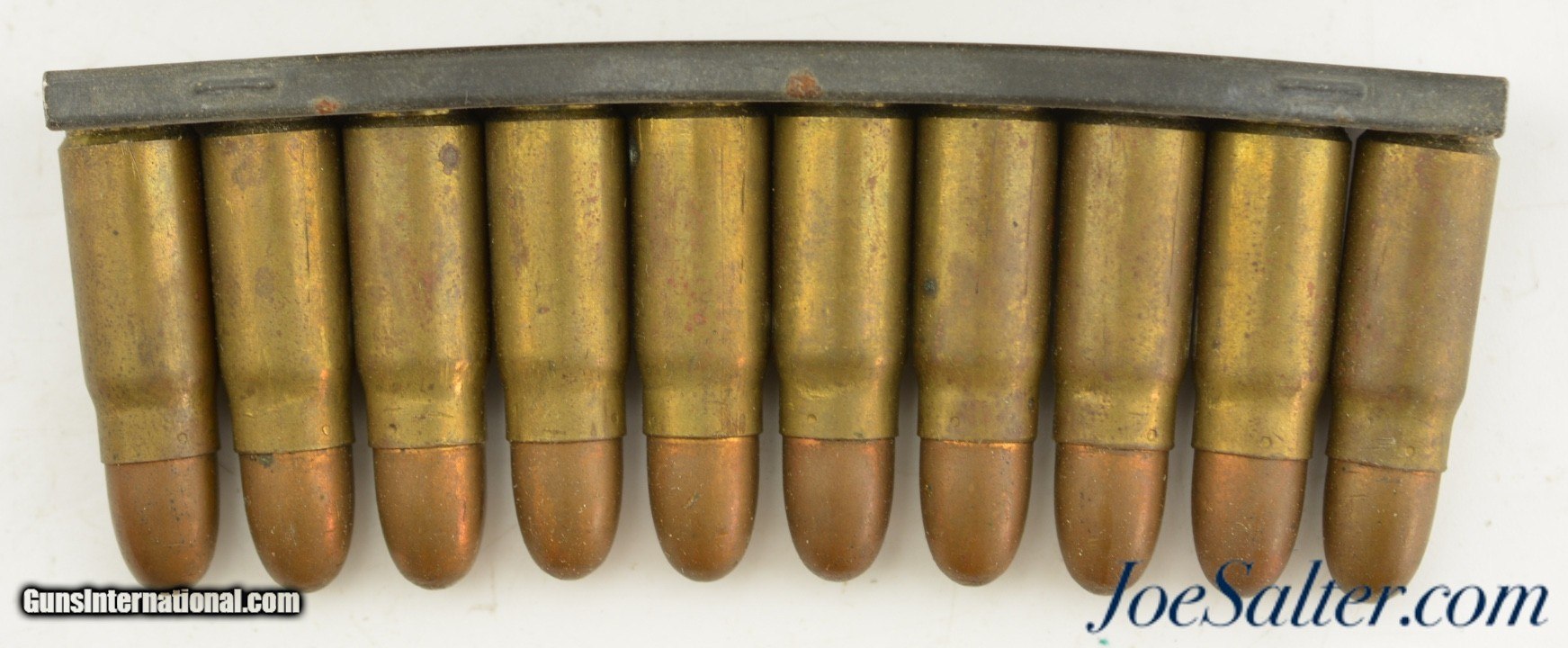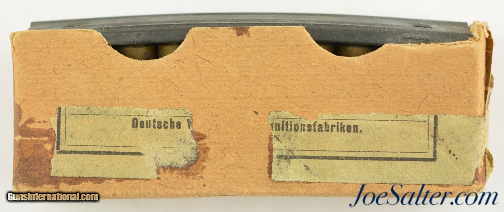 Description: This is two opened boxs of 30 (7.63) MAUSER CN FMJ head stamped "DWM K K 403" This ammo was most likley Manufactured in early 1930's by DWM - Deutsche Waffen- u. Munitionsfabriken of Berlin. Part of the labels are sill intact and the boxes remain in good condition. The ammunition comes on 4 stripper clips, 10 per. The clips and ammunition are in very good condition with, the clips are stamped "DM". great for display.; SOLD |