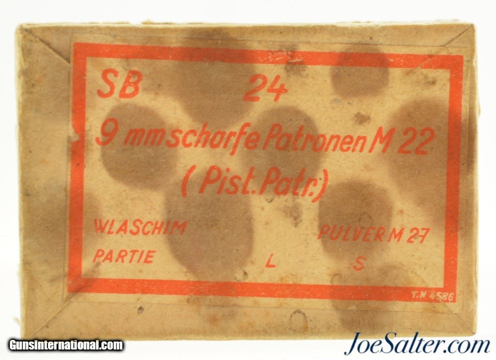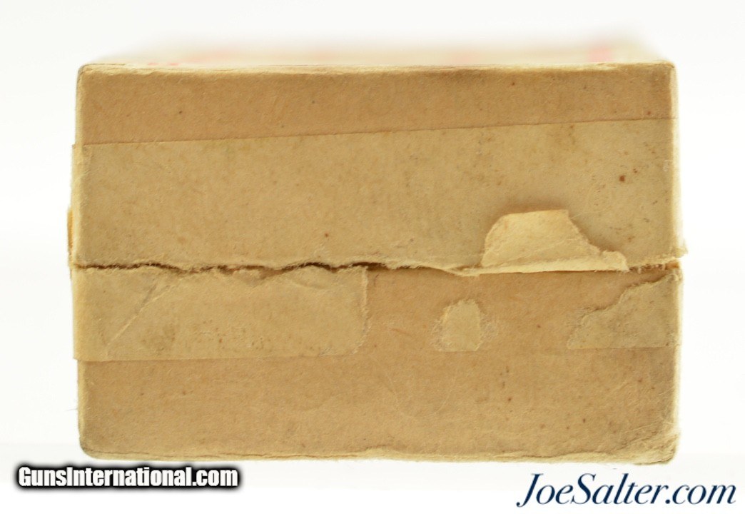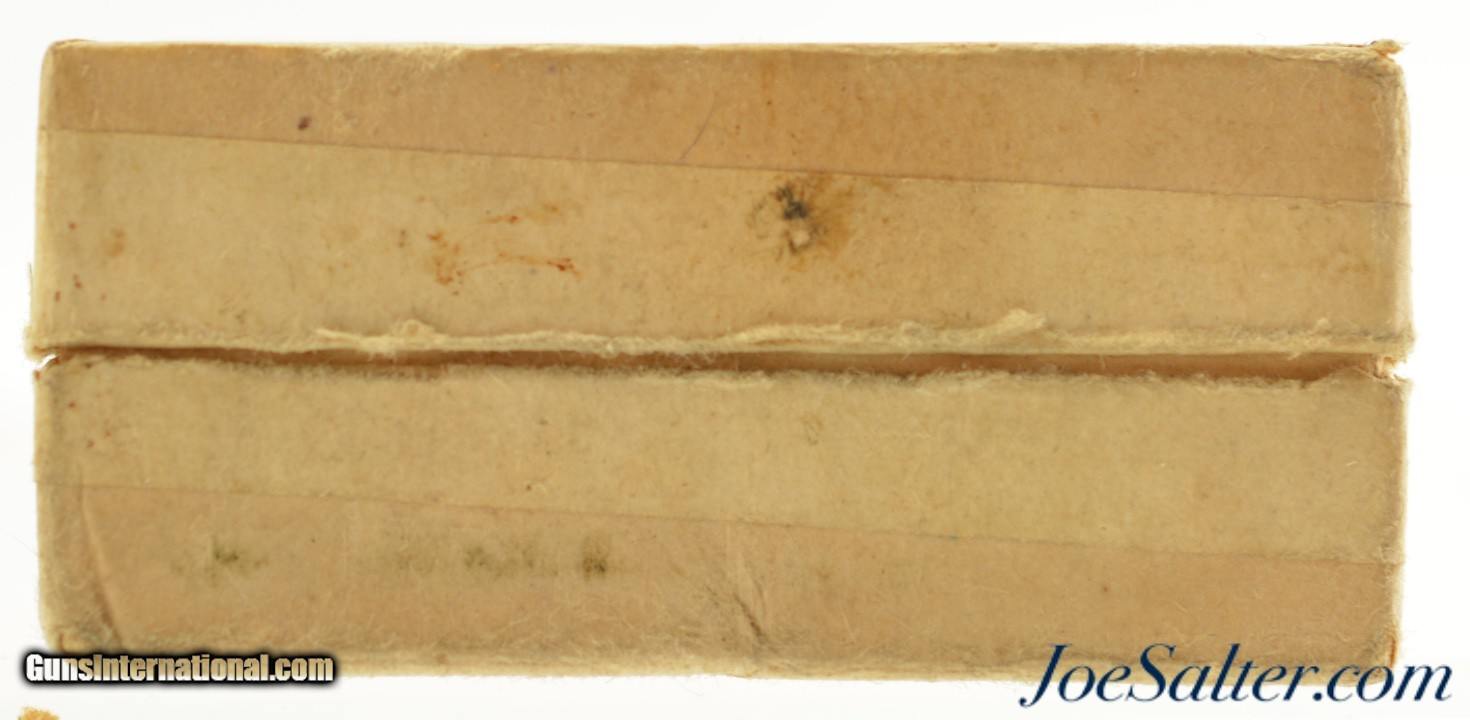 Description: This is a full box, 24 original rounds, of 9mm Kurtz (.380 ACP) ammunition manufactured in Germay marked "SB" on the cover and "SBP" on the headstamp. The box shows light staining with an intact label and has excellent full metal jacket cartridges. A great box to pair with your WWII era German or European pocket pistol. Price: $65.00 Contact Seller |