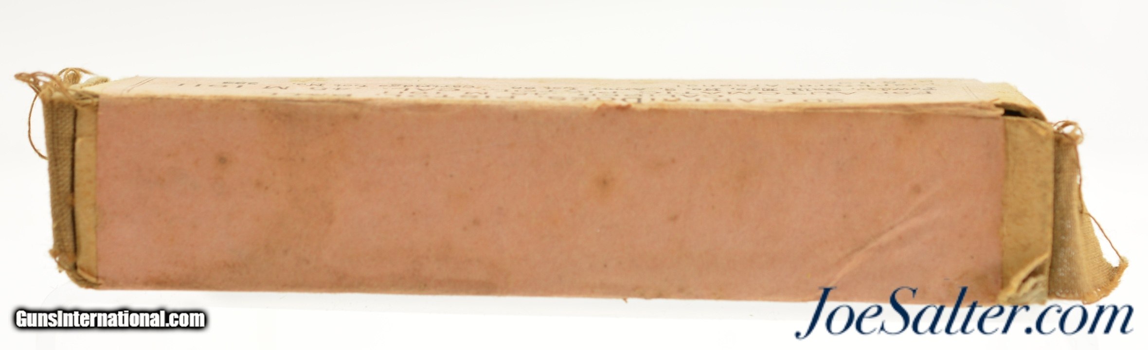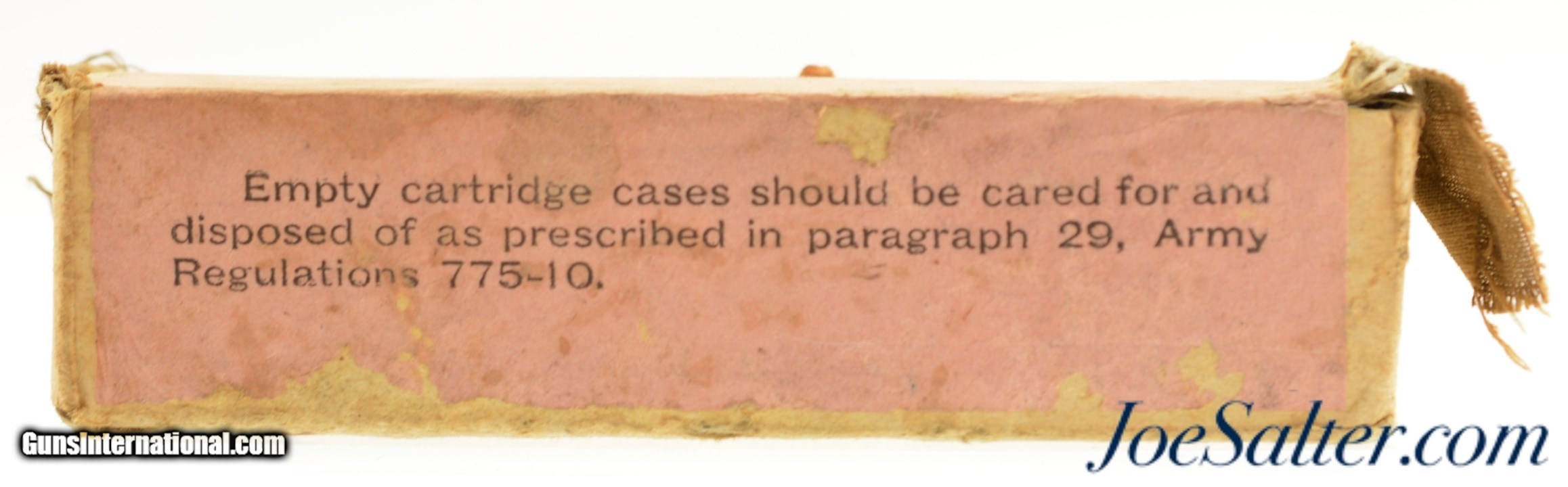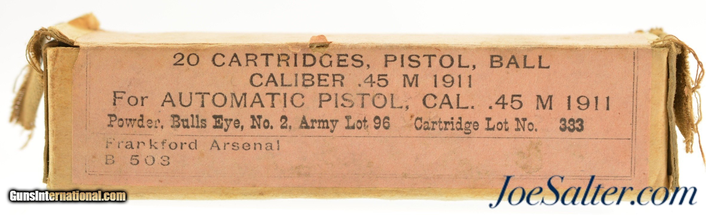Description: This is a full and sealed box, 20 original rounds, of .45 ACP ammunition manufactured by the Frankford Arsenal. The box has the original cloth pull tabs with only a slight opening on the upper left allowing a peak inside to reveal the "27" head stamp. Front is marked "Army Lot 96 Cartridge Lot No. 333". Price: $75.00 Contact Seller |