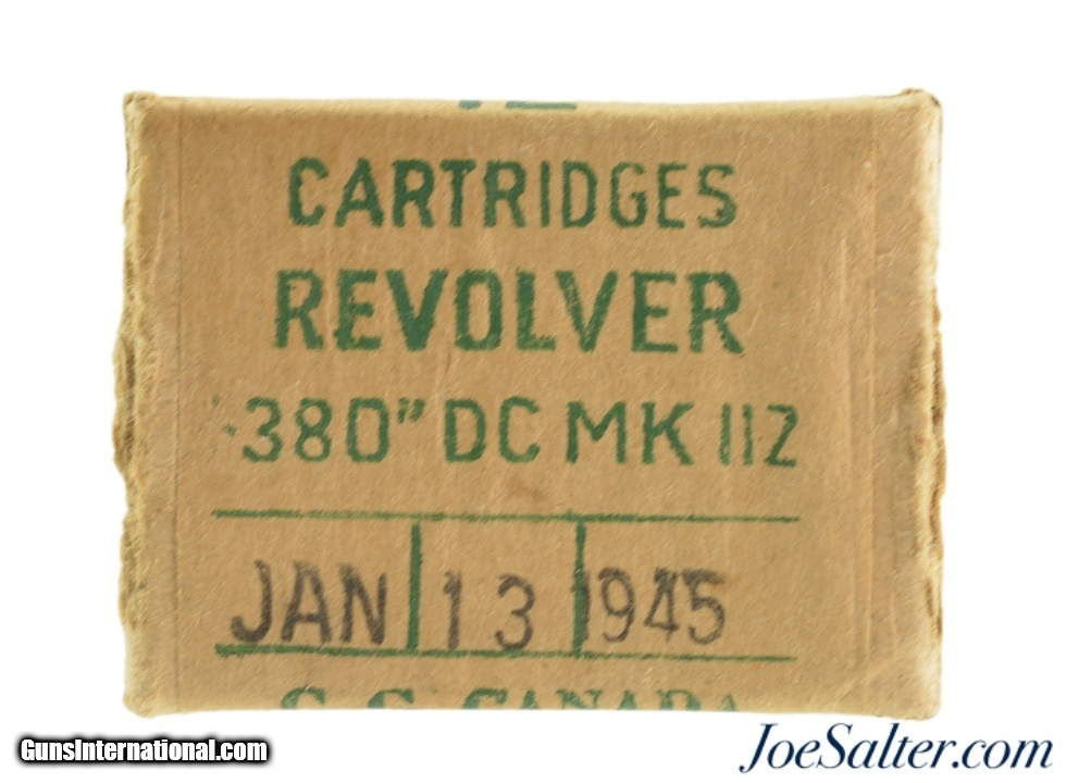 Description: This is a full and sealed, 12 original rounds, of .380 MK IIZ revolver ammunition marked and built by C.G. Canada and dated Jan 13, 1945. The military packaged ammunition has a fully intact seal with a seam split along the top right corner. A great looking WWII item perfect to pair with your British service revolver. SOLD |