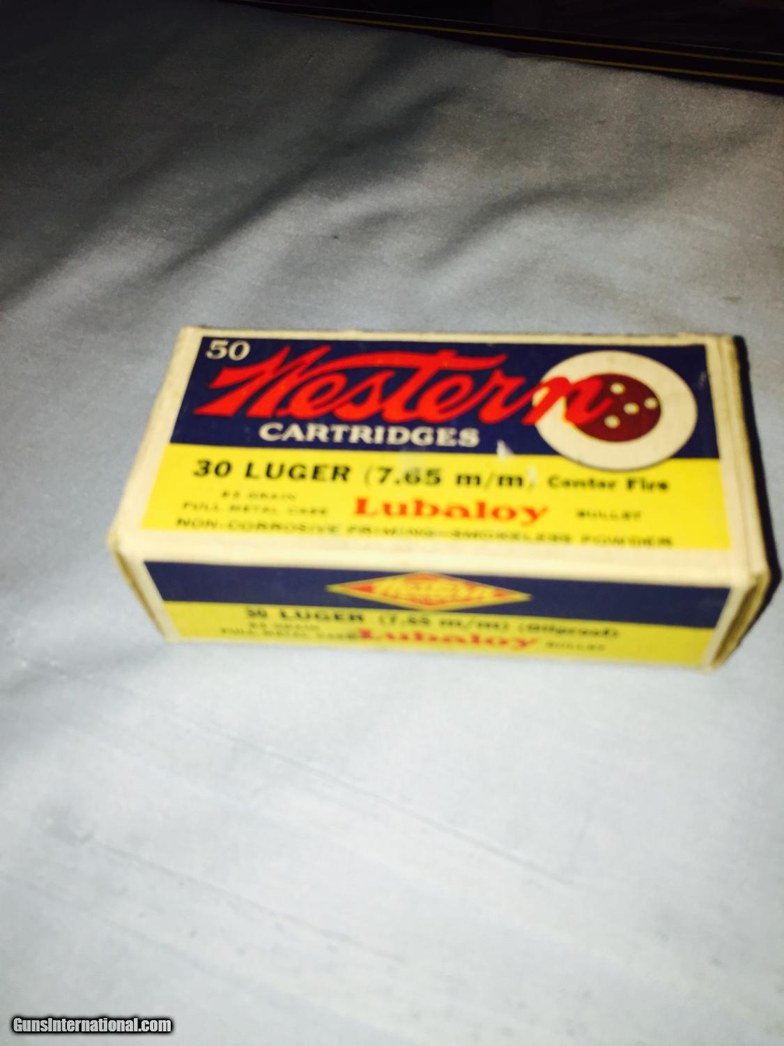 Western Arms yellow,blue/red-Bulls-Eye 50 rd boxes;1940's near mint box 30 luger and 30 Mauser