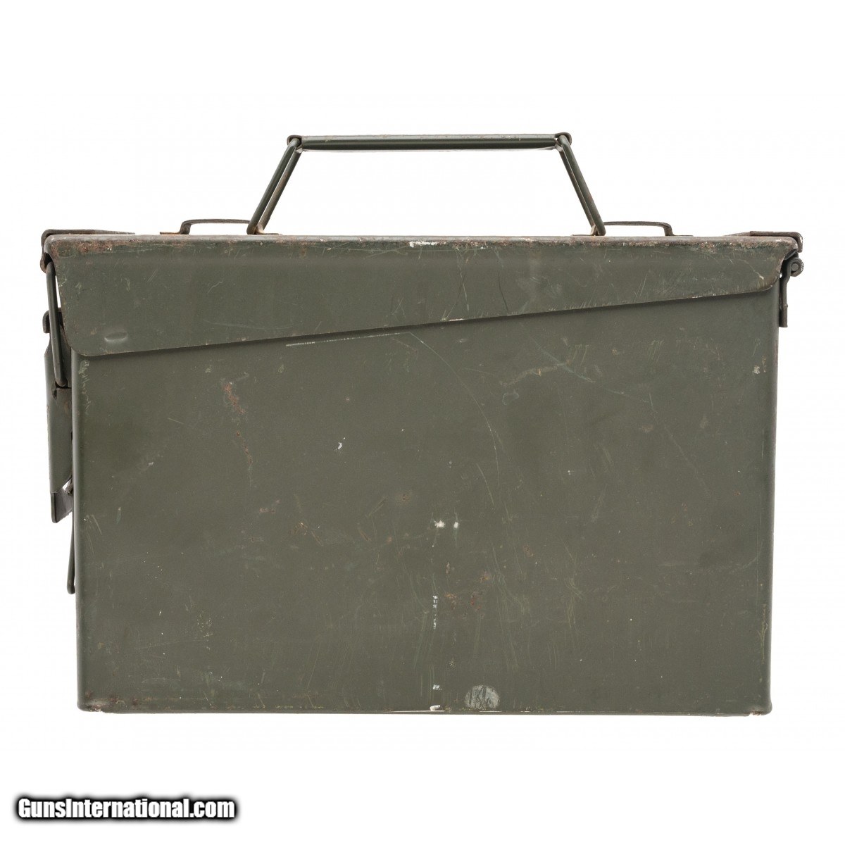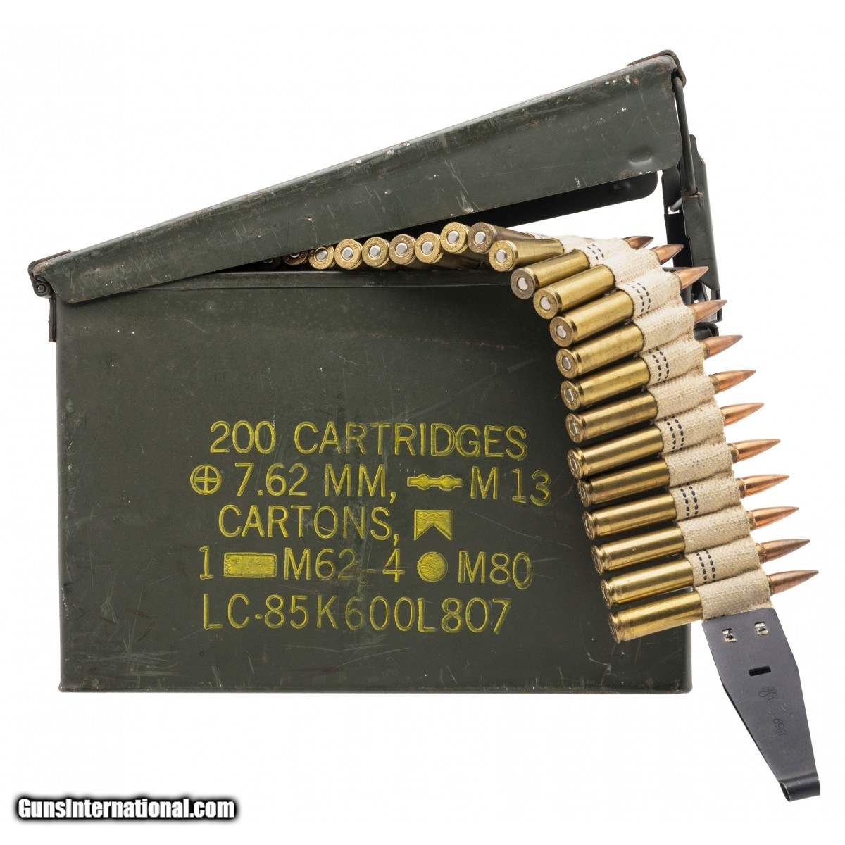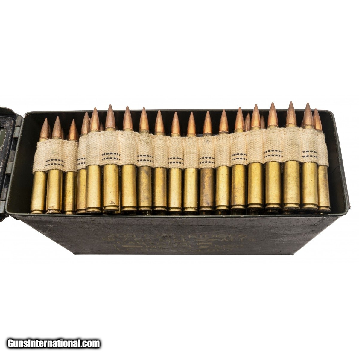 250-rounds of .30-06 ammunition for an M1919 machine gun on a 1969-dated Mk. I cloth belt. Comes in a steel ammunition can for M80 7.62mm NATO ammunition.