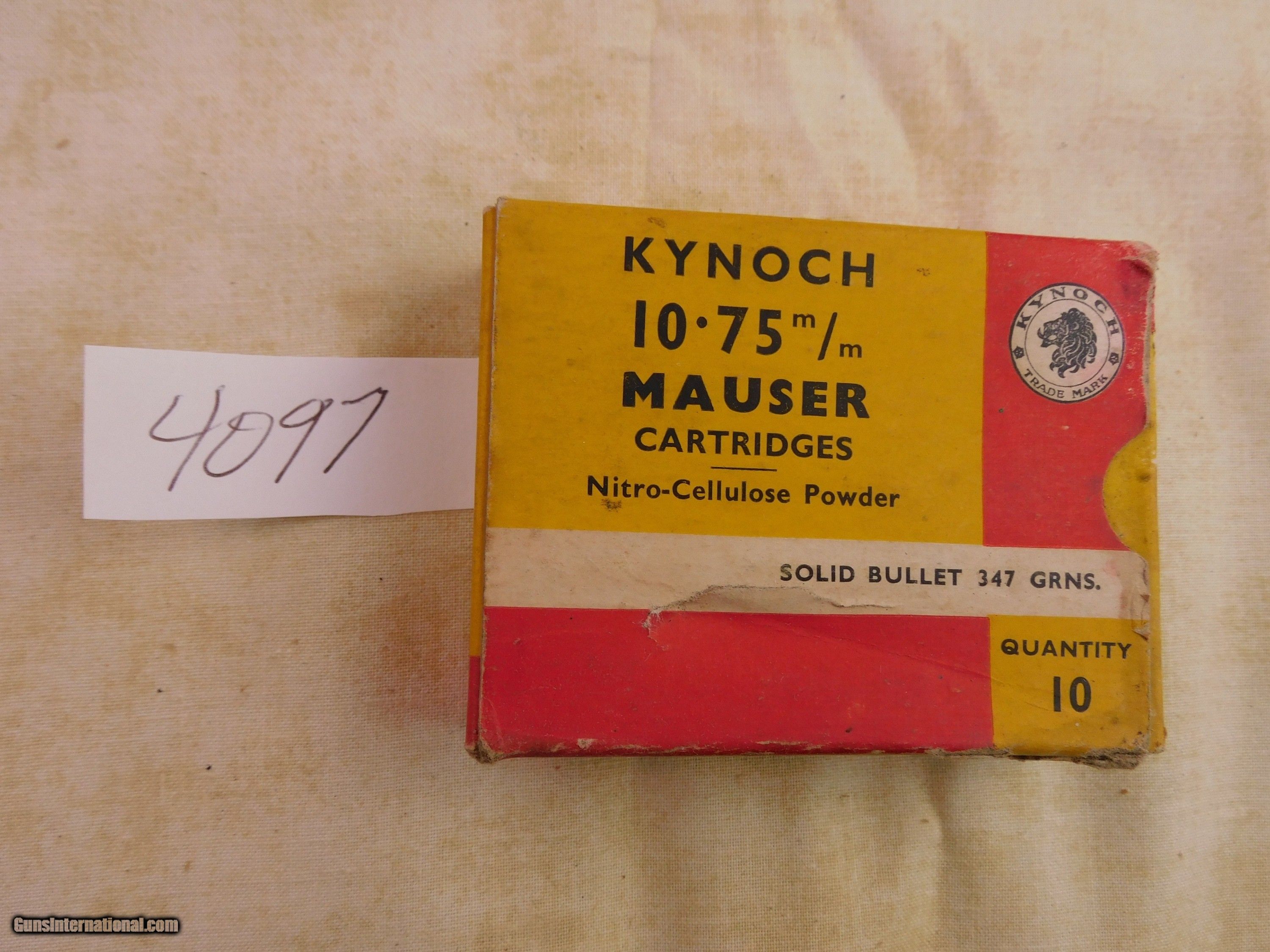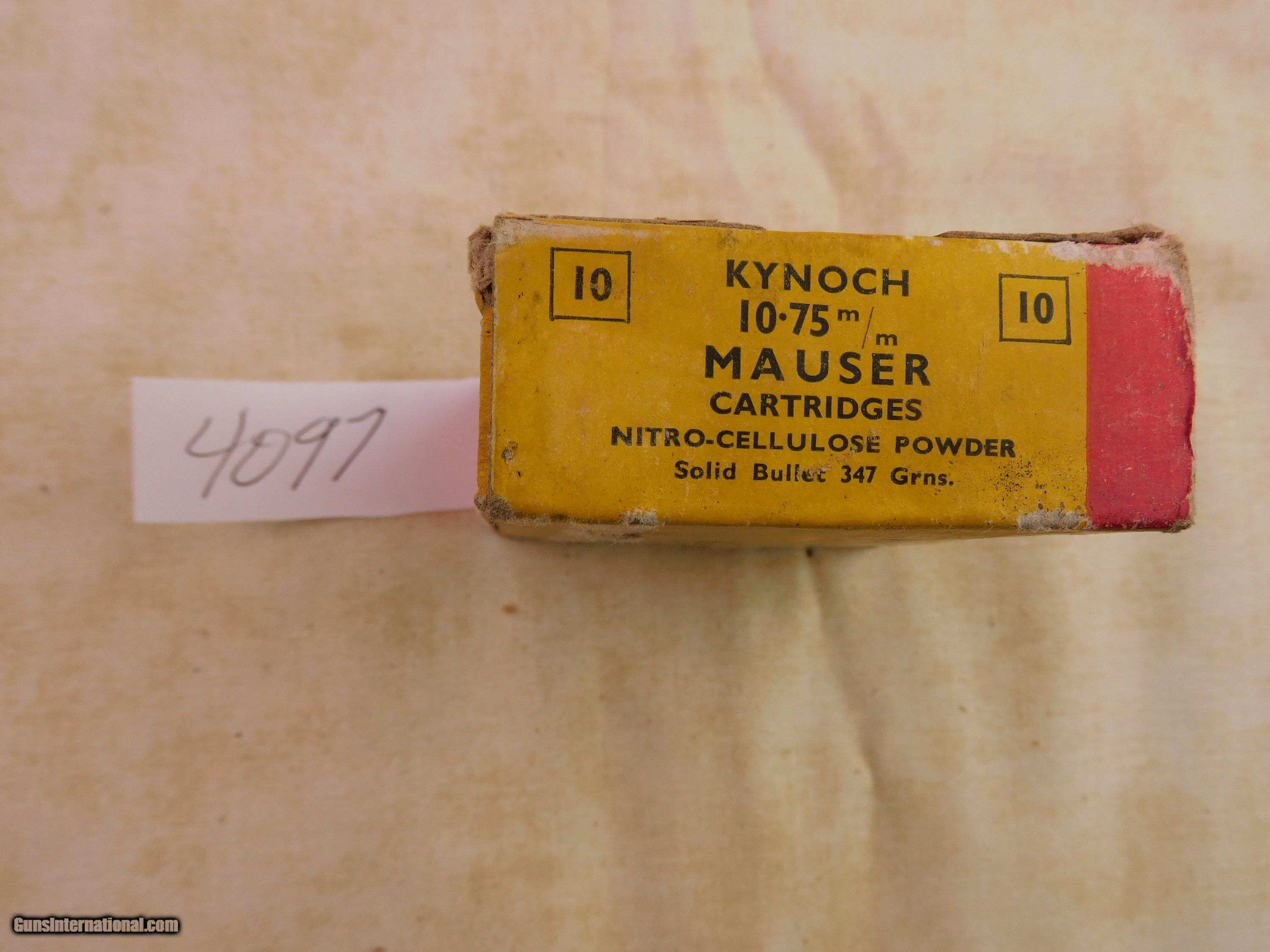 Description: #4097MA 10.75 Mauser cartridges, 347 gr. bullet, Kynoch red & yellow 10 rd. box, VG to exc. condition. $59 (8 available) Price: $59.00 Contact Seller |