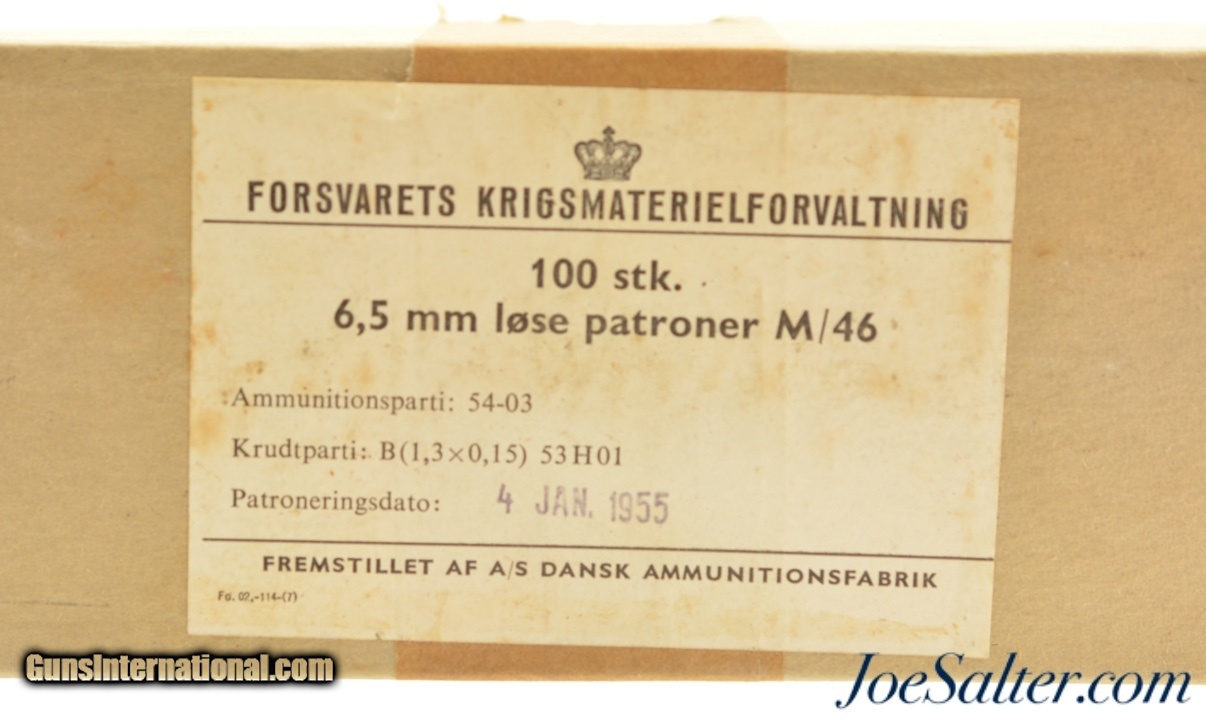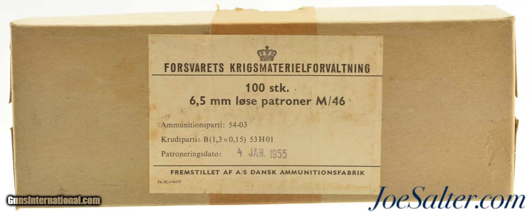 Description: This is Swedish 6.5mm with wooden bullets. Made in Denmark with labeled box is dated 4 JAN 1955 and marked 100 stk. 6,5 mm lose patroner M/46. Nice for display or training. Price: $49.00 Contact Seller |