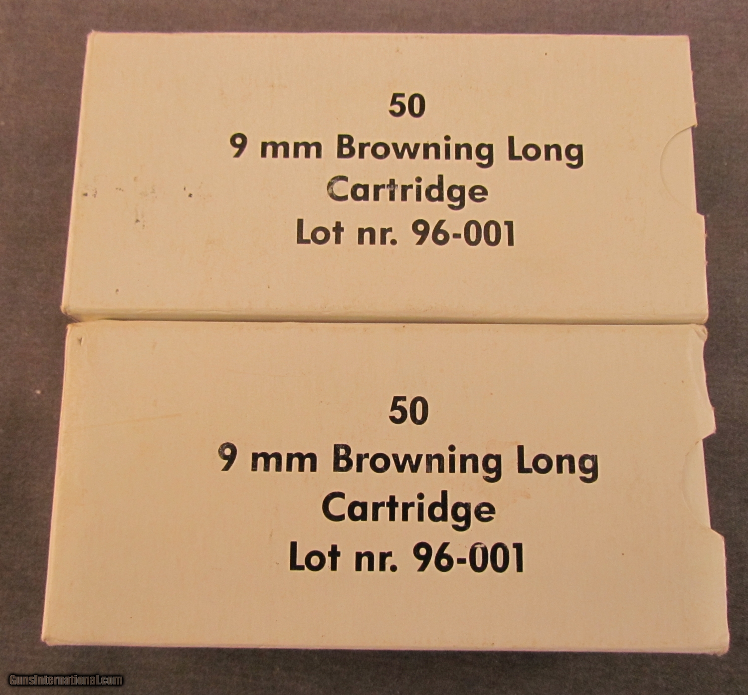 Description: Two full 50 round boxes (100 rounds total) of Bofors Carl Gustaf produced 9 mm browning long ammo. Boxes show shelf wear , some have incorrect retailers label on bottom (wrong caliber), ammo remains bright and clean. This is loaded with round nose full metal jacket 108 grain bullets in brass cases. SOLD Manufacturer: Carl Gustaf Model: Ammo Caliber Info: 9mm Gauge Info: 9mm |