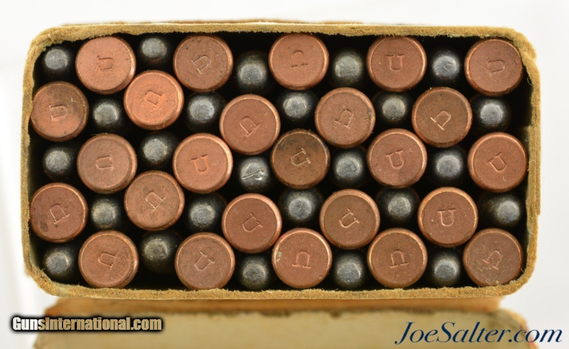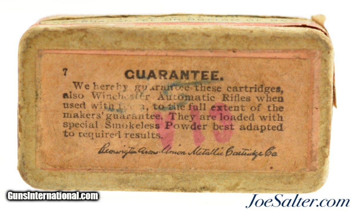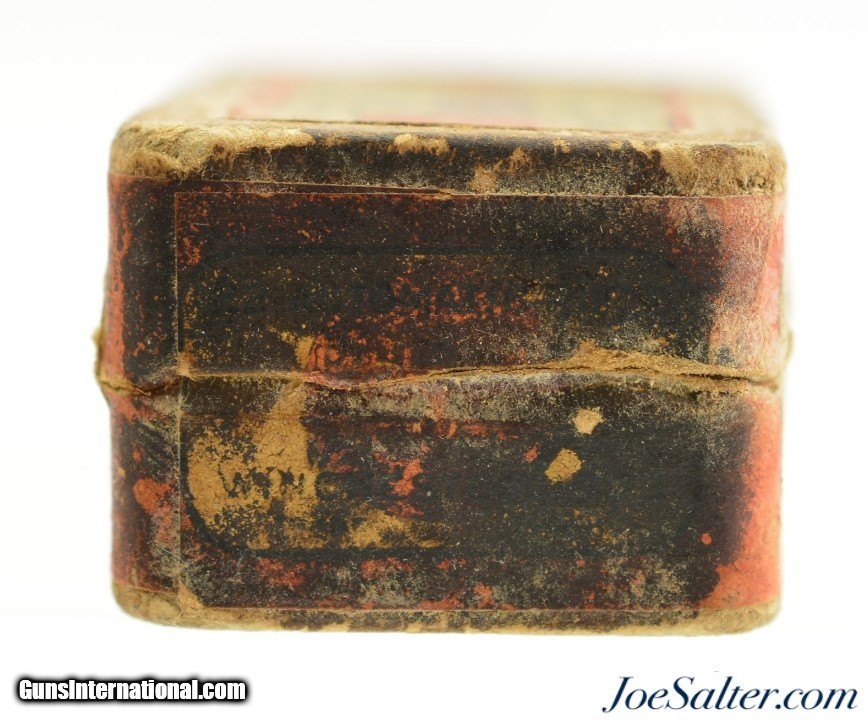 Description: This is a full box, 50 original rounds, of .22 Winchester Auto ammunition manufactured by Remington UMC and was from the 1911 Split Logo issues. The two piece, half split box is solid having very nice graphics with the attractive multi-color cartridge cut. The primary and bottom guarantee labels are intact with about 85% of the side label with the rear side intact for the hinge having overall age soiling and dark staining on one side. The cartridges are in excellent condition. SOLD |