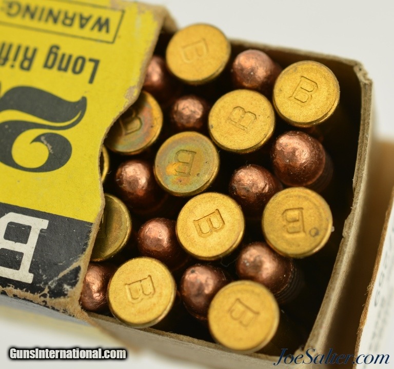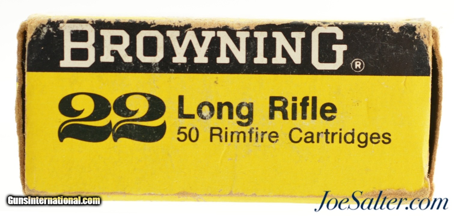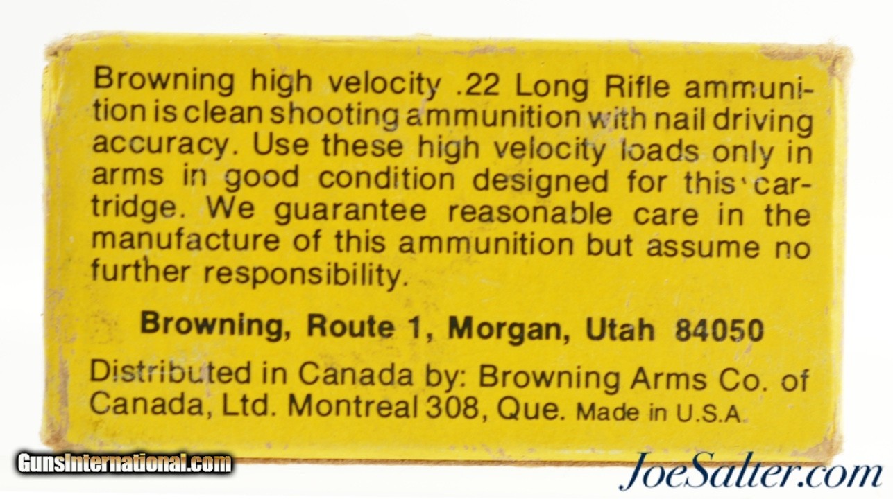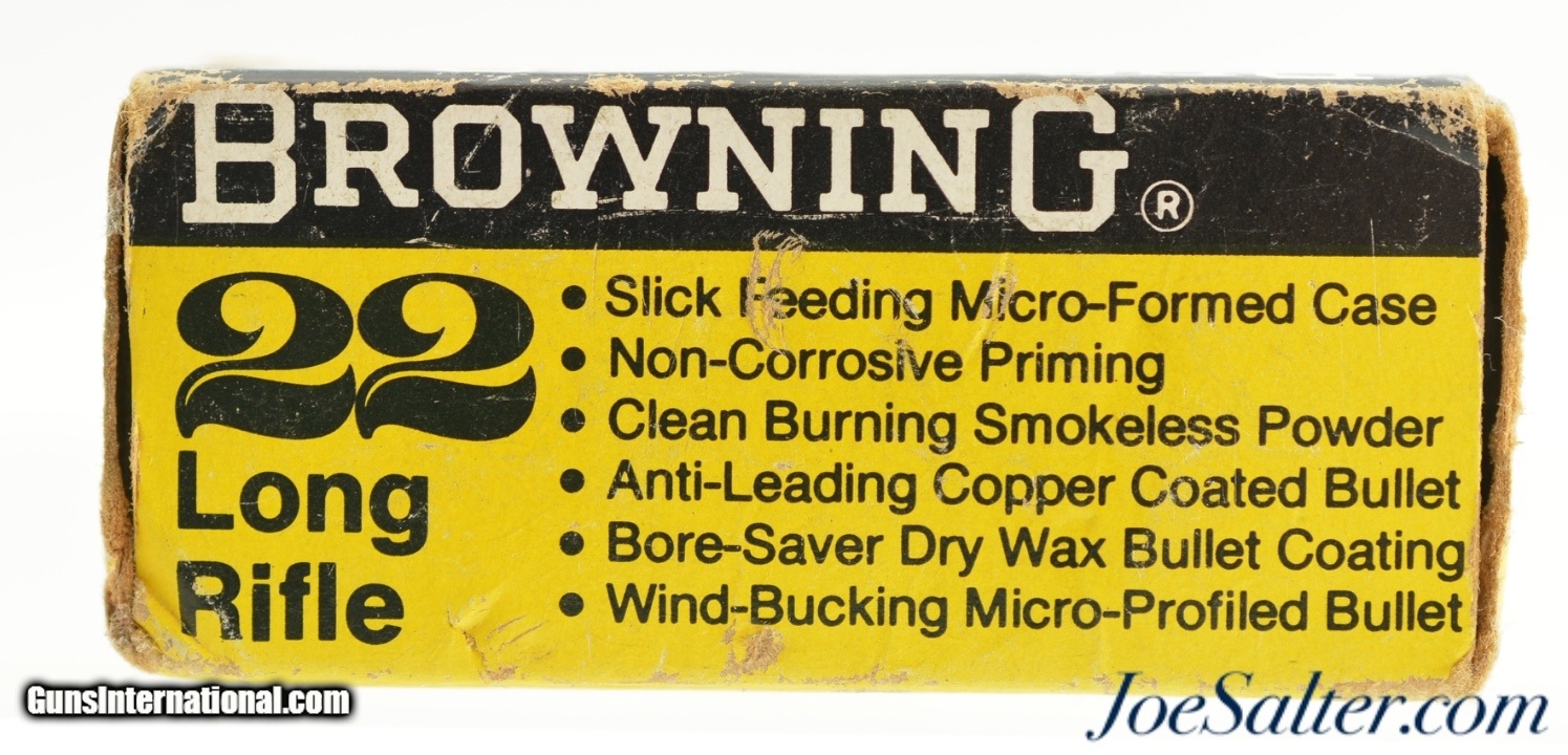 Description: This is a full box, 50 original rounds, of Browning .22 LR high velocity ammunition manufactured by Winchester for Browning from 1970-74. The yellow, black and white box shows light edge and corner wear. The cartridges are in excellent condition. Identified as Brown-1 LR-1 in Roger Huegel's online .22 Rim Fire Box ID reference. SOLD |