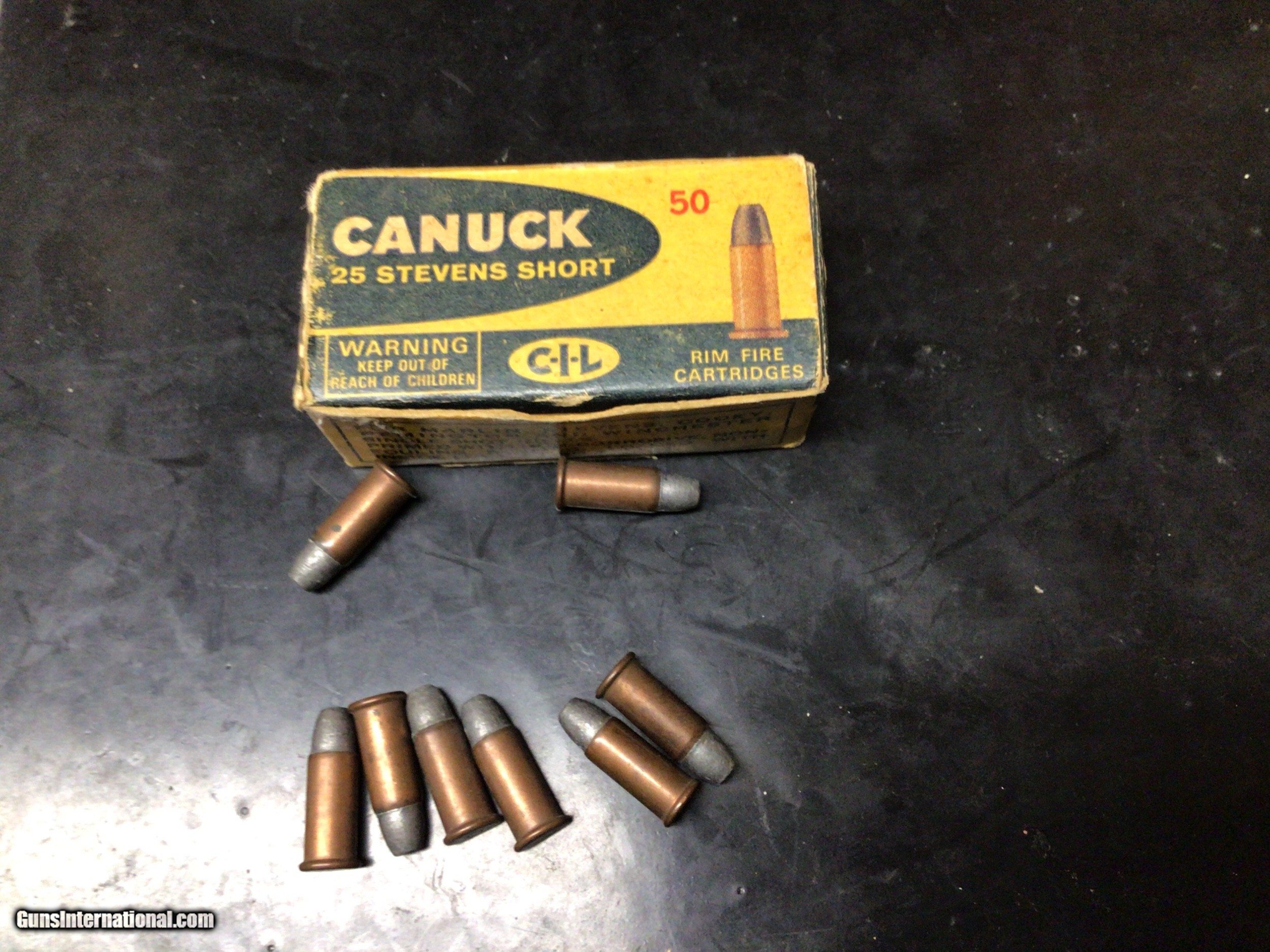 Description: Canuck 25 short rimfire fair box very good bullets 8 extra SOLD |