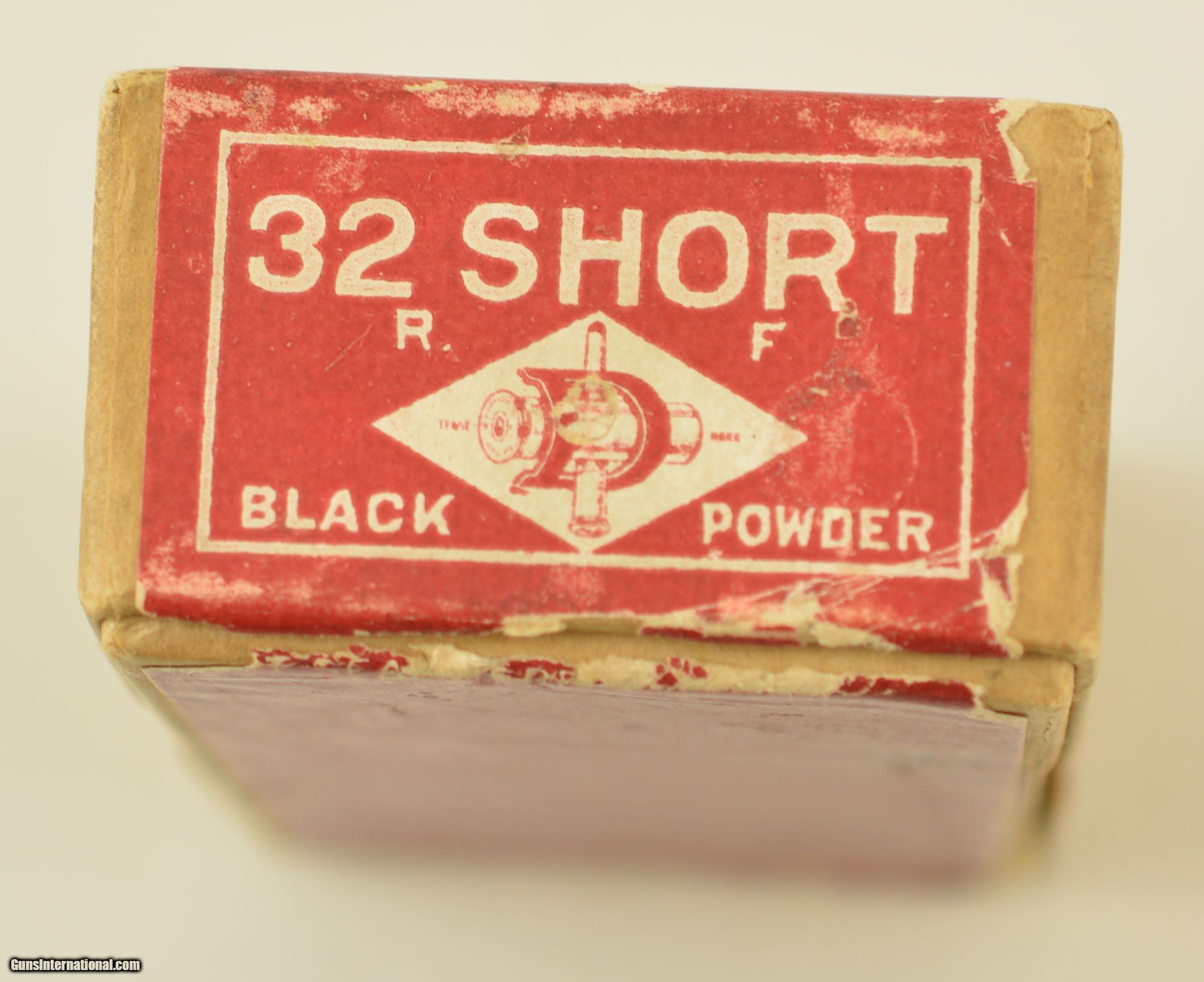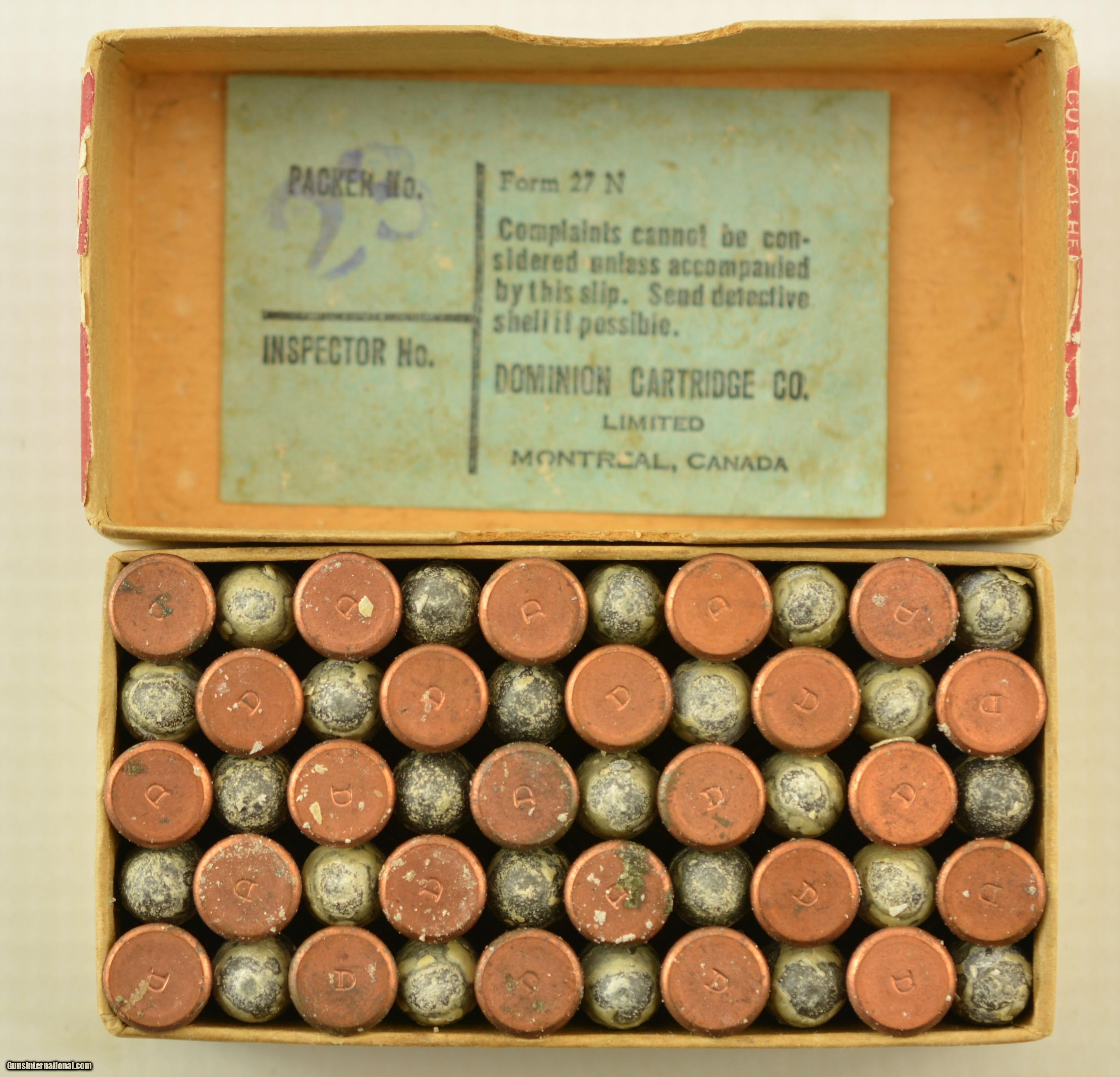 Description: This is an opened, two-piece 50 rd. box of black powder-loaded cartridges, with Dominion Cartridge Co. red paper label. The box is in excellent shape with some minor wear along the edges, no tears or separations, and scattered spots of minor surface staining. The paper label has some minor edge flaking, but is still clear and legible, and there is a date stamp along one side wall: “APR 14 1928". The cartridges are likewise in excellent shape, with only very minor spots of surface corrosion visible on the copper “D" stamped cases, and the original paper packing slip is still present. This is an attractive box, and would make a nice addition to a collection. SOLD Manufacturer: Dominion Model: Cartridges Caliber Info: .32RF Gauge Info: .32RF |