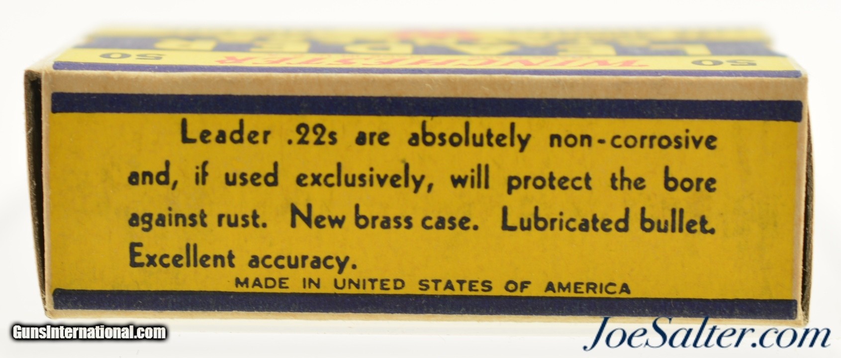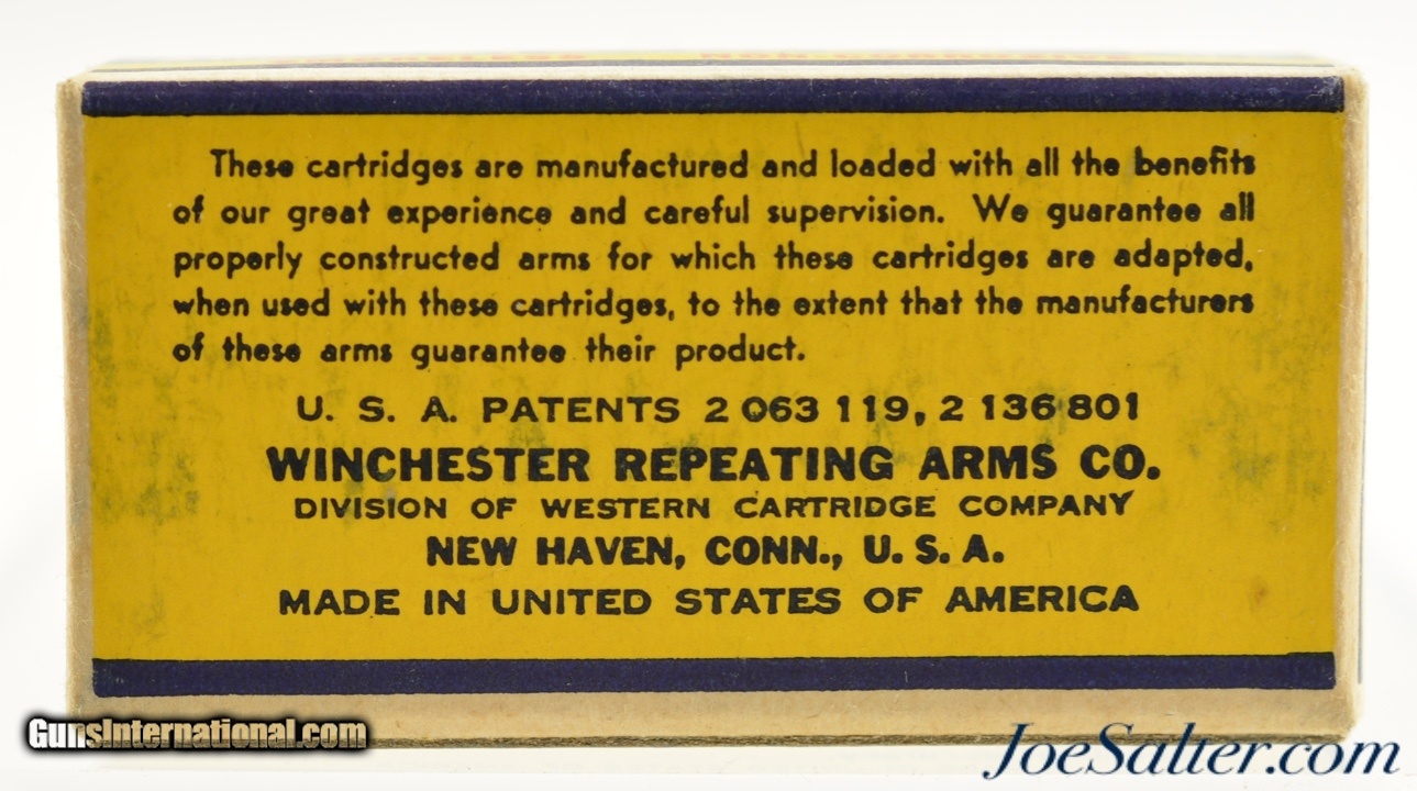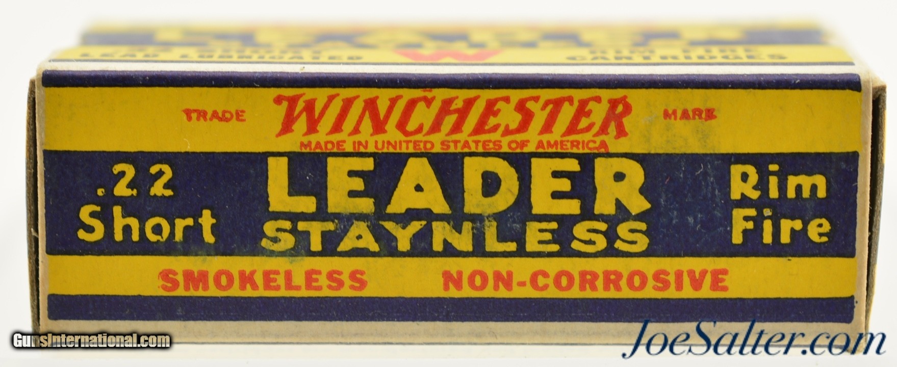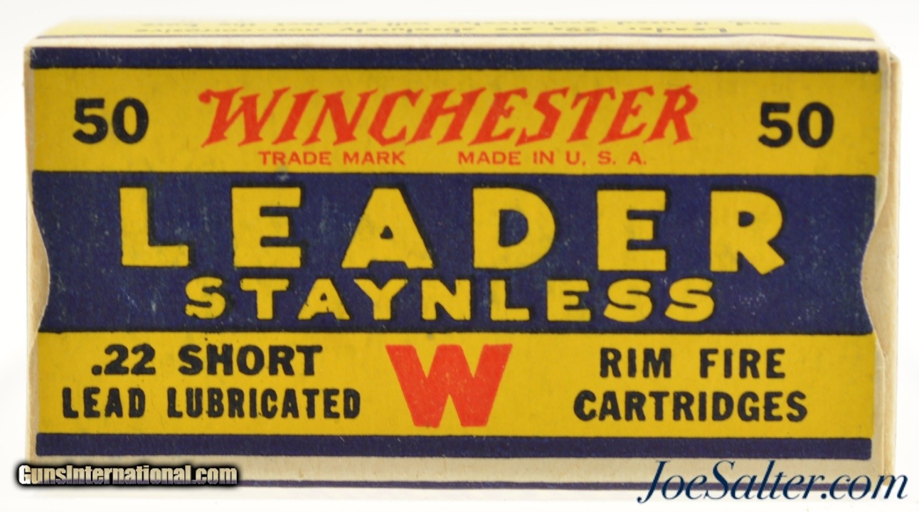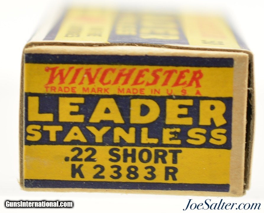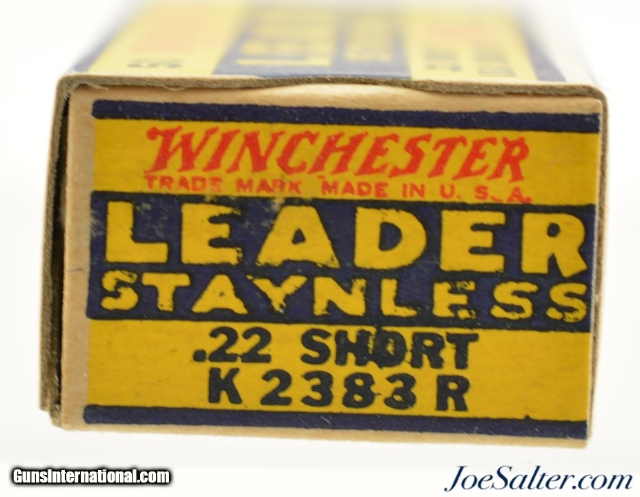 Description: This is a full box, 50 original rounds, of .22 short ammunition manufactured by Winchester. The one piece 1938 "Leader" Target issue box has the Western Cartridge company call out with "K 2383 R" code listed as WRA-55 S-1 B#2 in Identified as WRA-55 S-1(b) with #2 warning in Roger Huegel's online .22 Rim Fire Box ID Reference. The box is brick fresh with excellent graphics with bright colors, crisp edges and corners and slight bottom rub wear from movement within the carton. An excellent box for the collector.; SOLD |