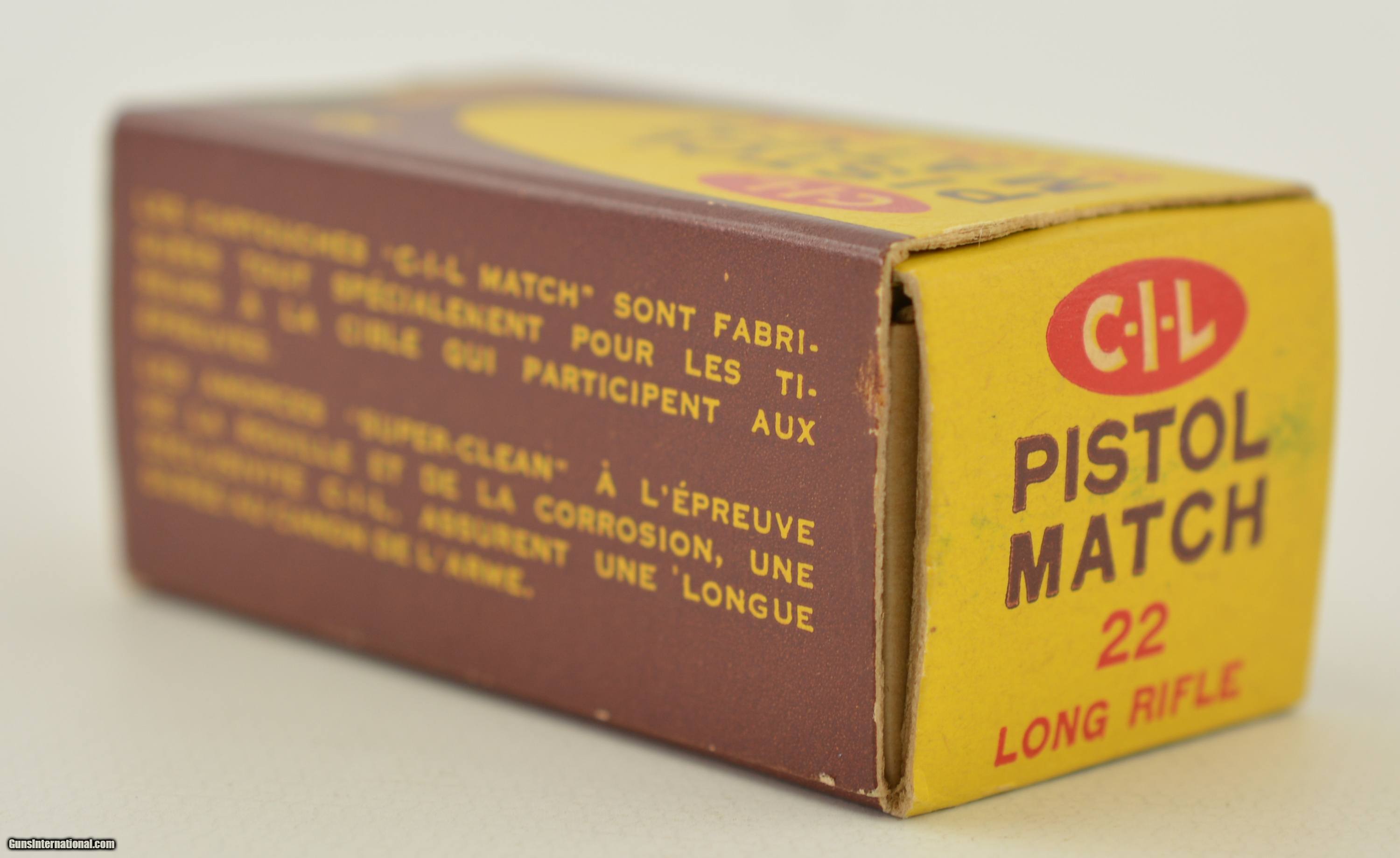Description: This full 50 round one piece box remains in excellent condition. Box is from the 1957-60 period. Listed in Blyth + Dunn as CIL-8-LR-3. SOLD Manufacturer: CIL Model: Ammo Caliber Info: .22LR Gauge Info: .22LR |