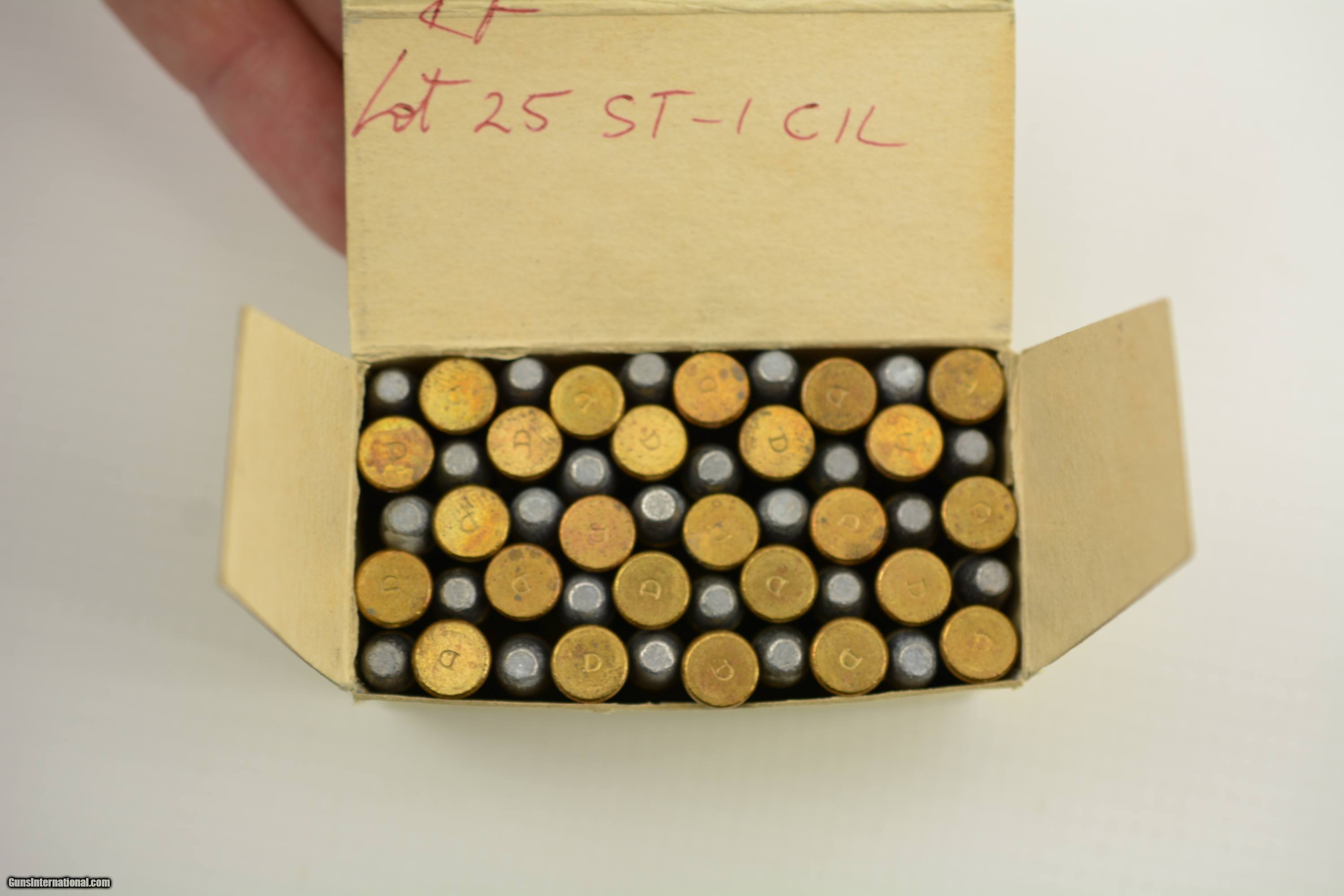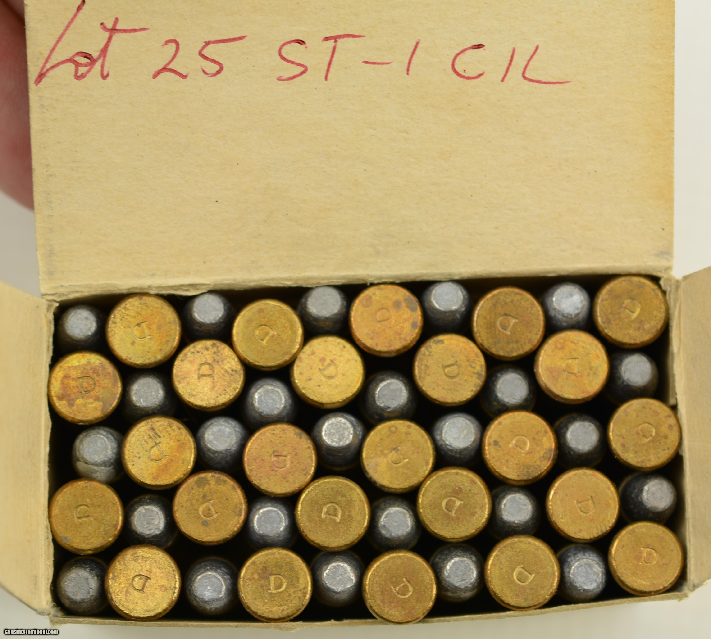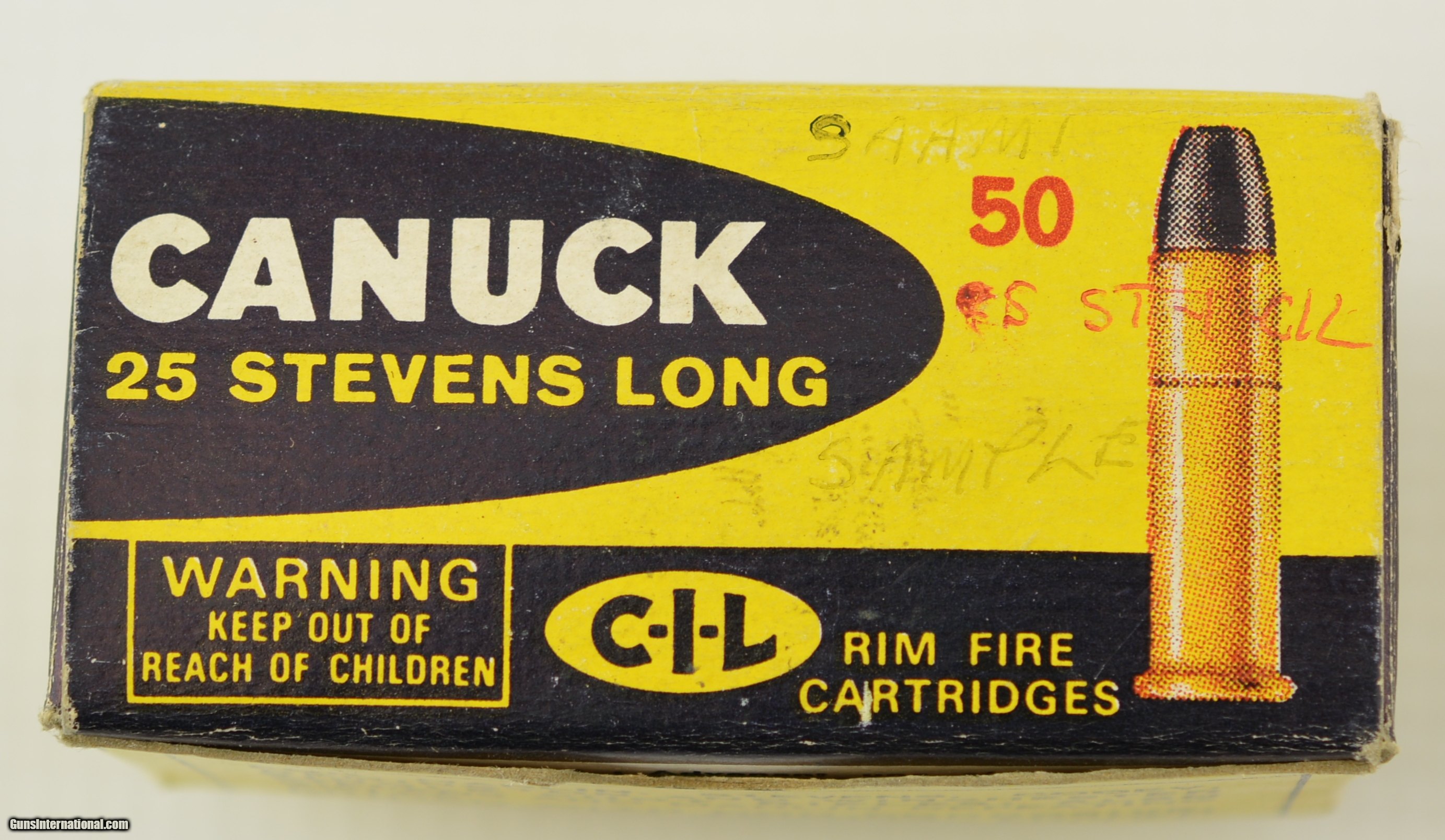 Description: Cil "Canuck" 25 Stevens Long Factory production reference full box of original cartridges. The yellow and black box remains in excellent plus condition as are the included rounds. Light pencil marking on the top saam above red CS St-1-cil factory code over pencil mark sample. The inside cover is marked red RF Lot 25 St-1-cil. An excellent plus box of 25 Stevens with the bonus of being one of very few factory reference boxes that survived the closing of IVI and the destruction of the factory collection. SOLD Manufacturer: CIL Model: Ammo Caliber Info: .25 Stevens Gauge Info: .25 Stevens |