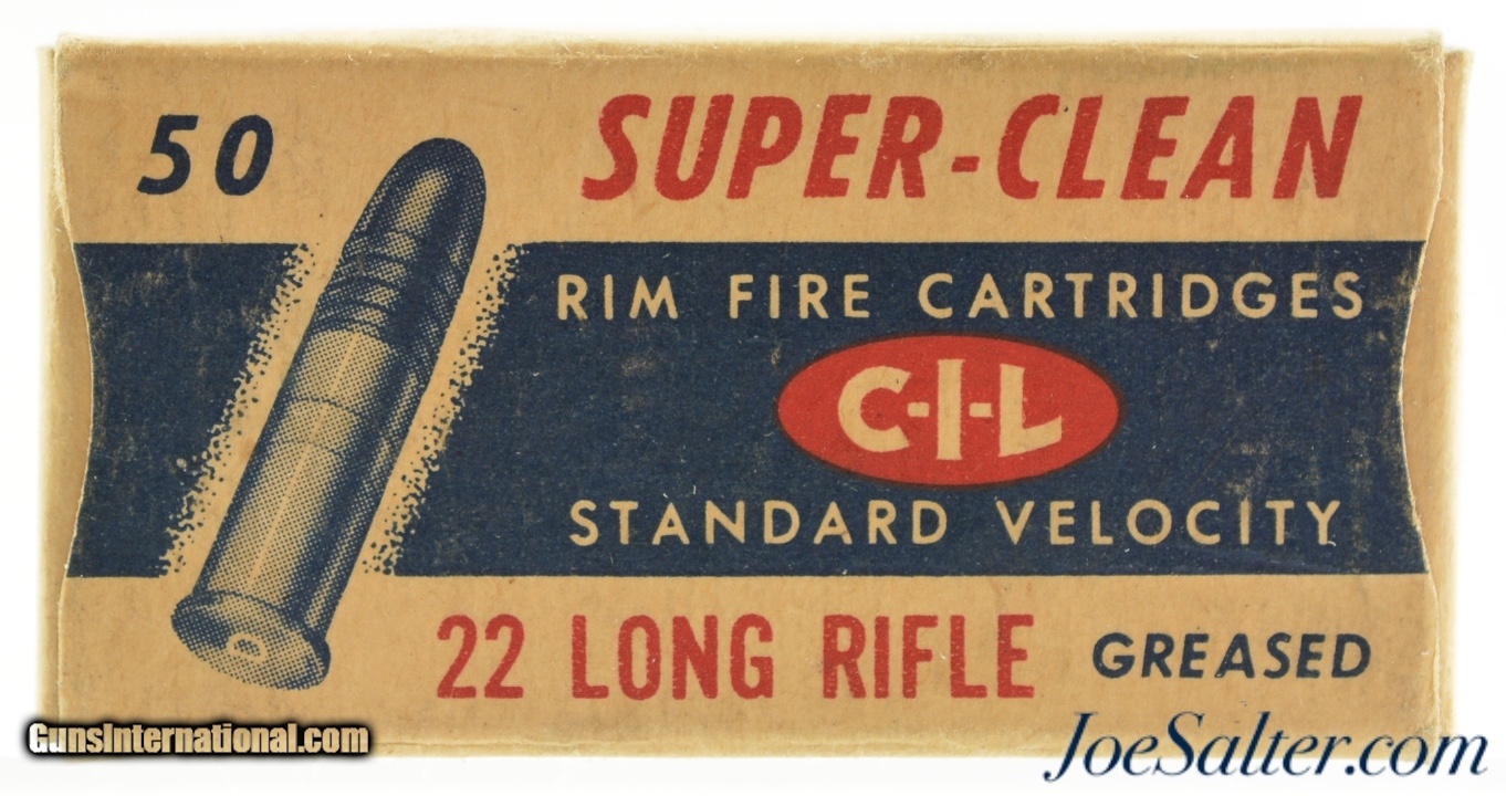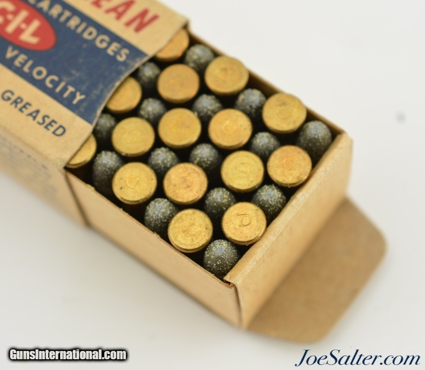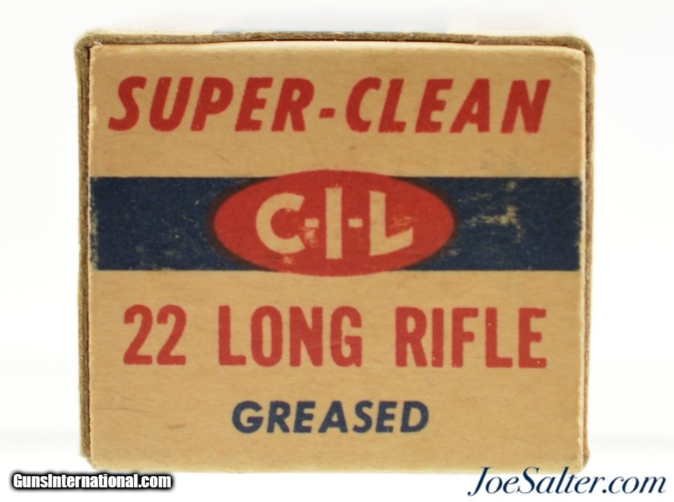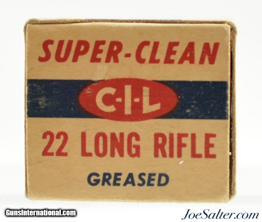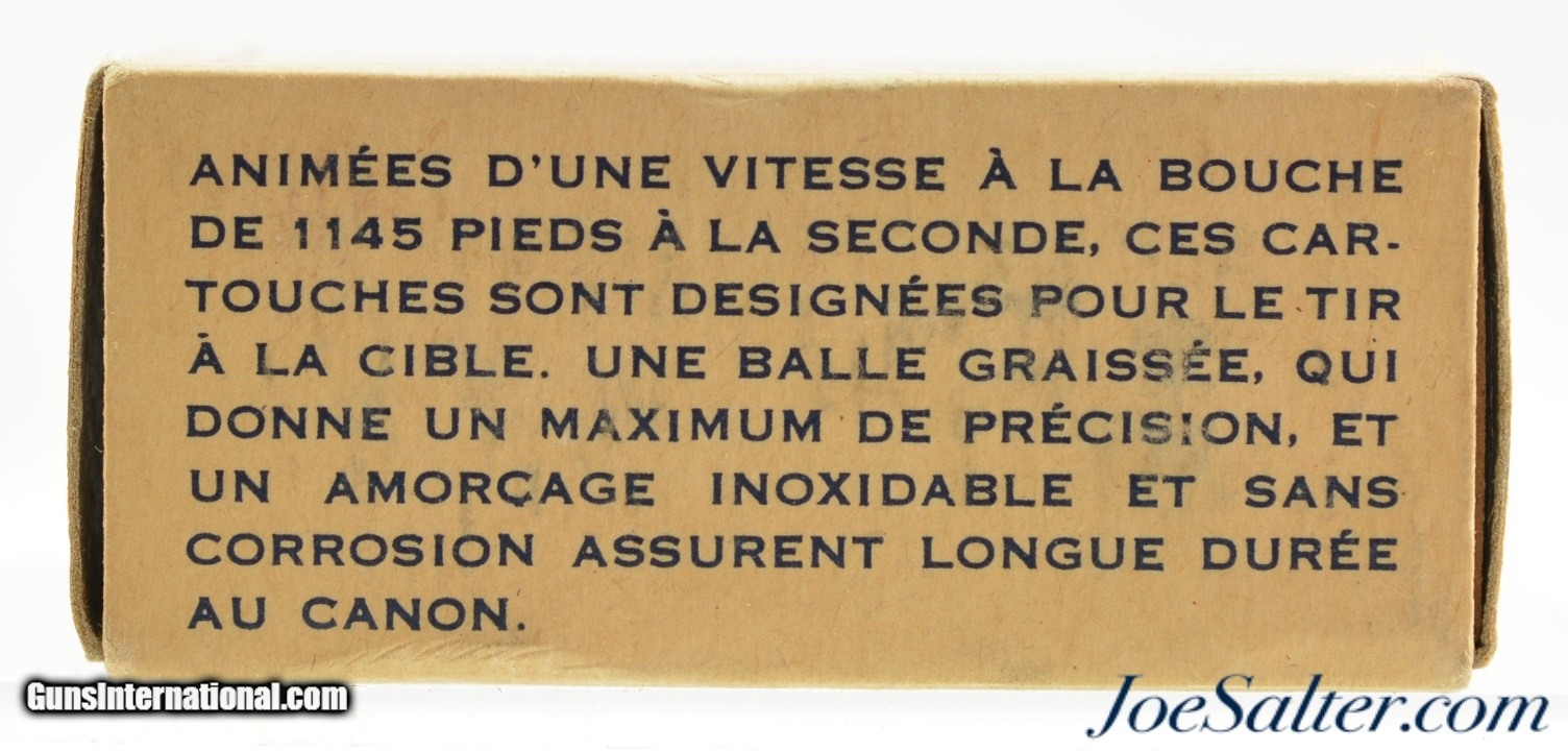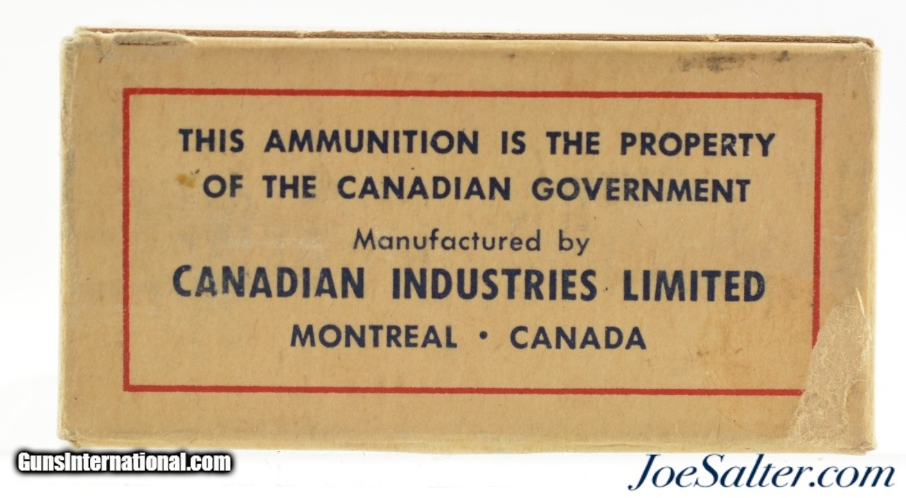 Description: This full 50 round one piece box features the 1957-60 period CIL oval with Canadian Govt ownership callout on bottom label. Box shows light soiling and shelf wear. Contains brass cased ammo with "D" head stamp.; SOLD |