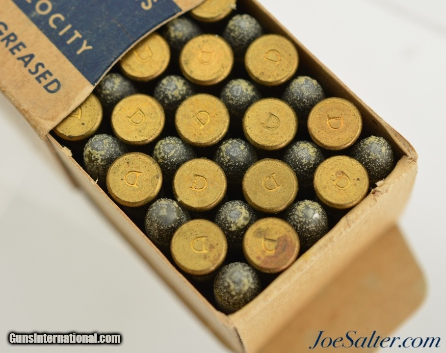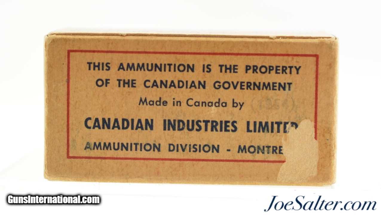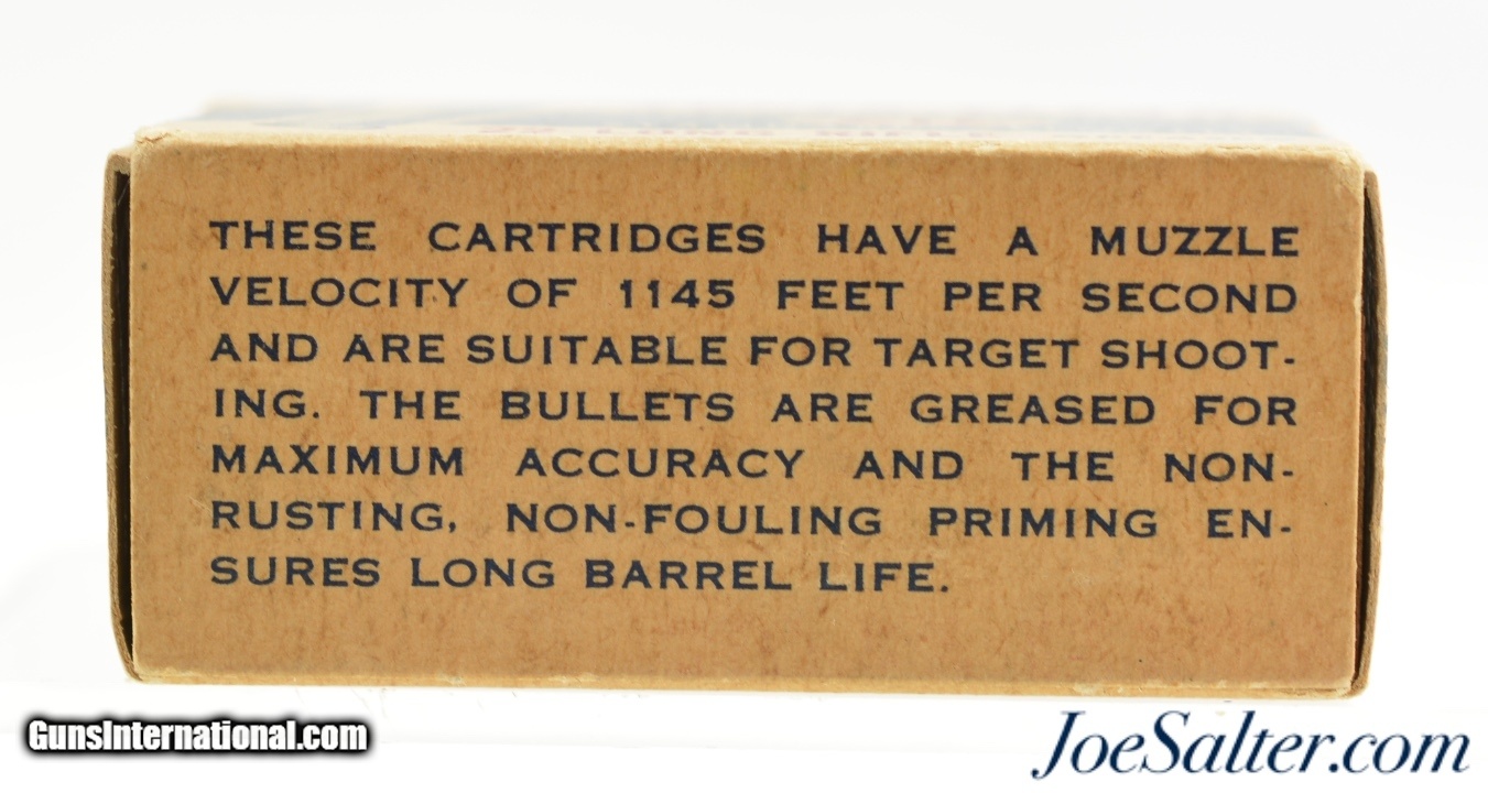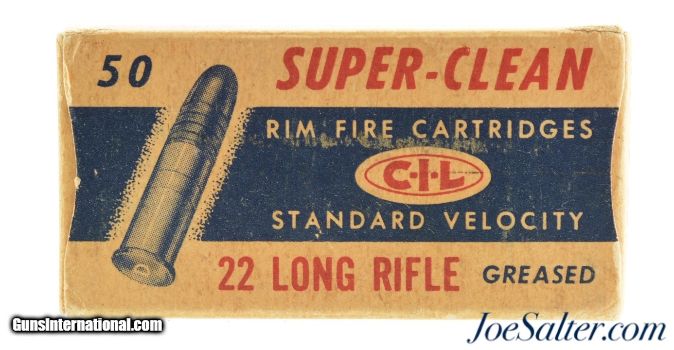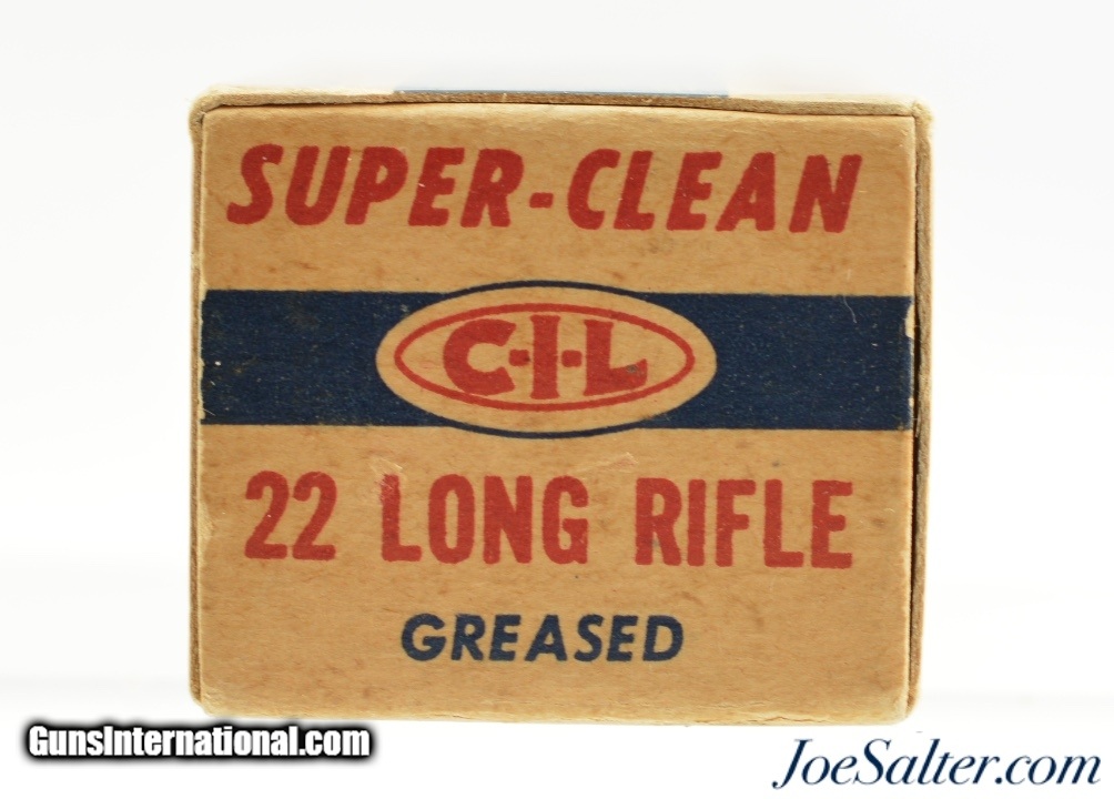 Description: This buff, red and blue 50 round one piece box features the double oval CIL logo used from 1950 to 1956. Box back calls out Government ownership and shows a stamped "(1954)" in black ink. Box shows light wear and soiling. A seldom seen box listed in Blyth +Dunn as CIL-6-LR-2-C.; SOLD |